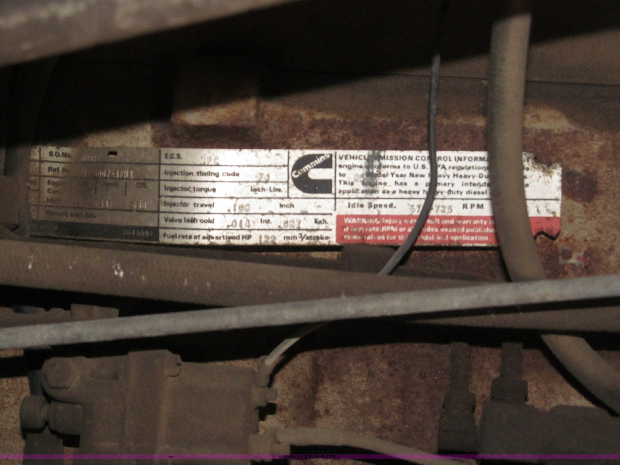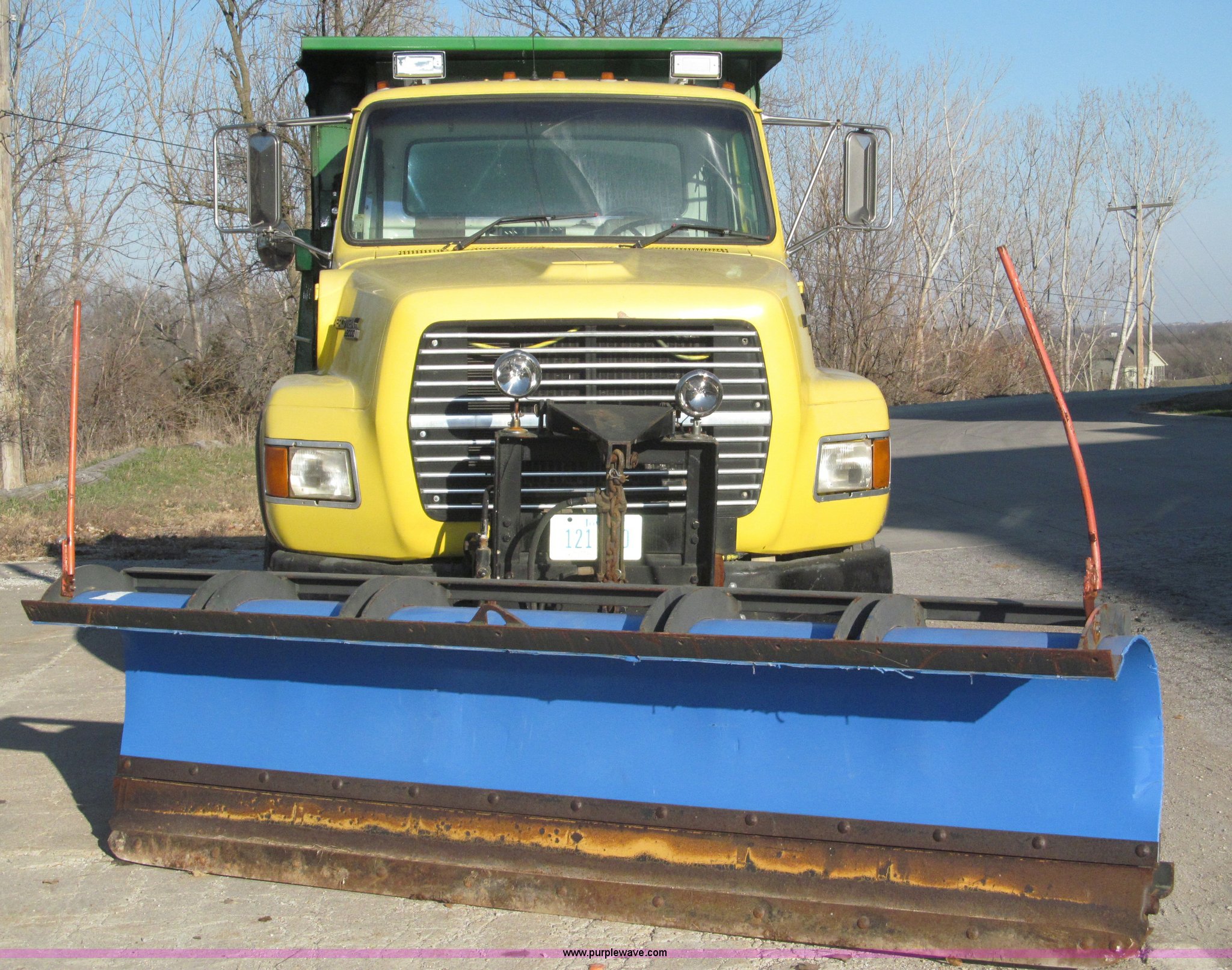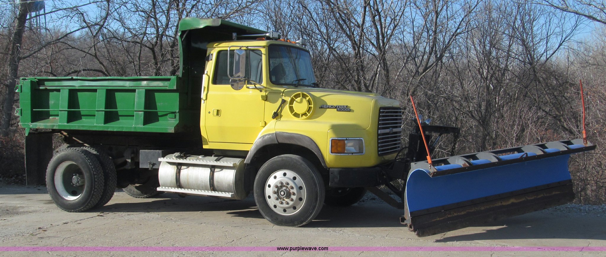 Purple Wave is selling a used Construction Dump Truck in Iowa. This item is a 1995 Ford LA9000 AeroMax dump truck with the following: 231,180 miles on odometer, Cummins L10 10.0L L6 diesel engine, Eaton Fuller Road Ranger Performance nine speed manual transmission, AC and heat, Sony AM/FM/CD, Custom made Apache speakers, Bostrom 914 air suspension seat, Heated mirrors, Block heater, Front side disconnected, Single stage ram, Dual 95 gallon fuel tanks, Roof mounted clearance lights and horn, Wausau 11' snow plow, Hydraulic operated, Work lights, Bolt-on cutting edge, Manual end gate, Spring suspension, Muncie PTO, Air brakes, 143" wheelbase, Aluminum front wheels, Steel rear wheels, 285/75R24.5 14PR tires, Snow chains included, GVWR 33,200 lbs, FAWR 12,000 lbs, RAWR 21,200 lbs, Lockable fuel caps, Maintenance history available upon request, Floor cracks, Bed rust, Hood may not open