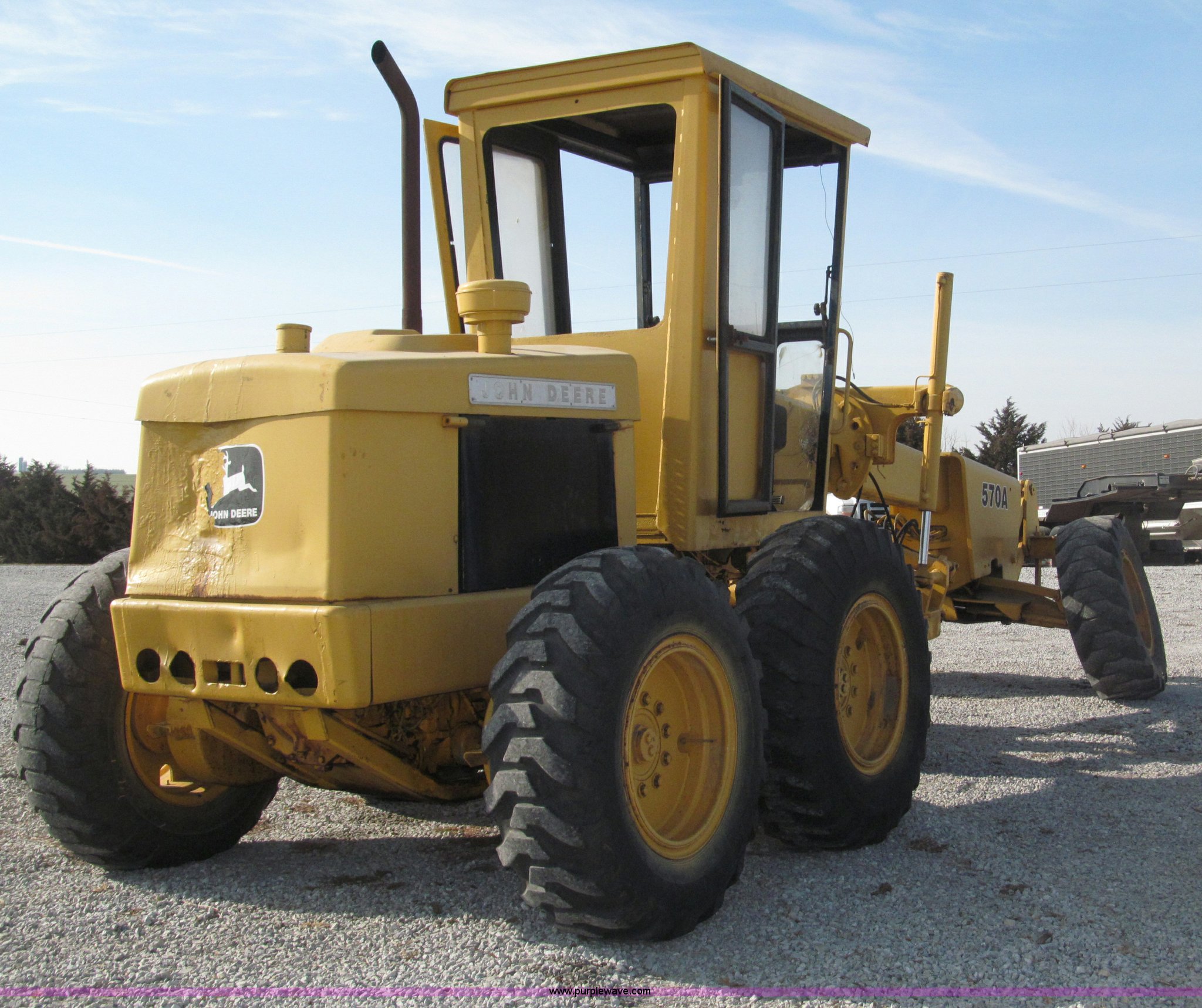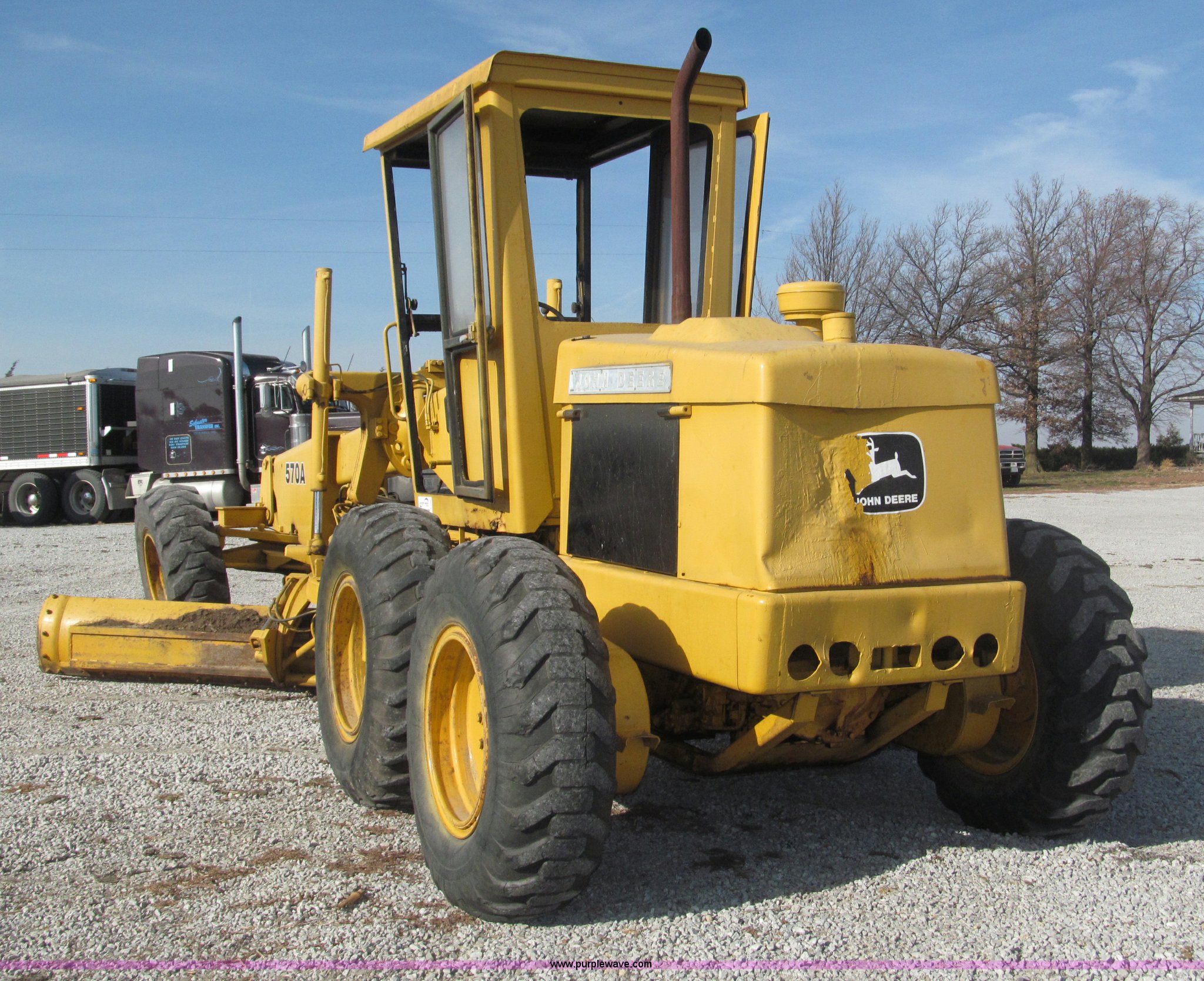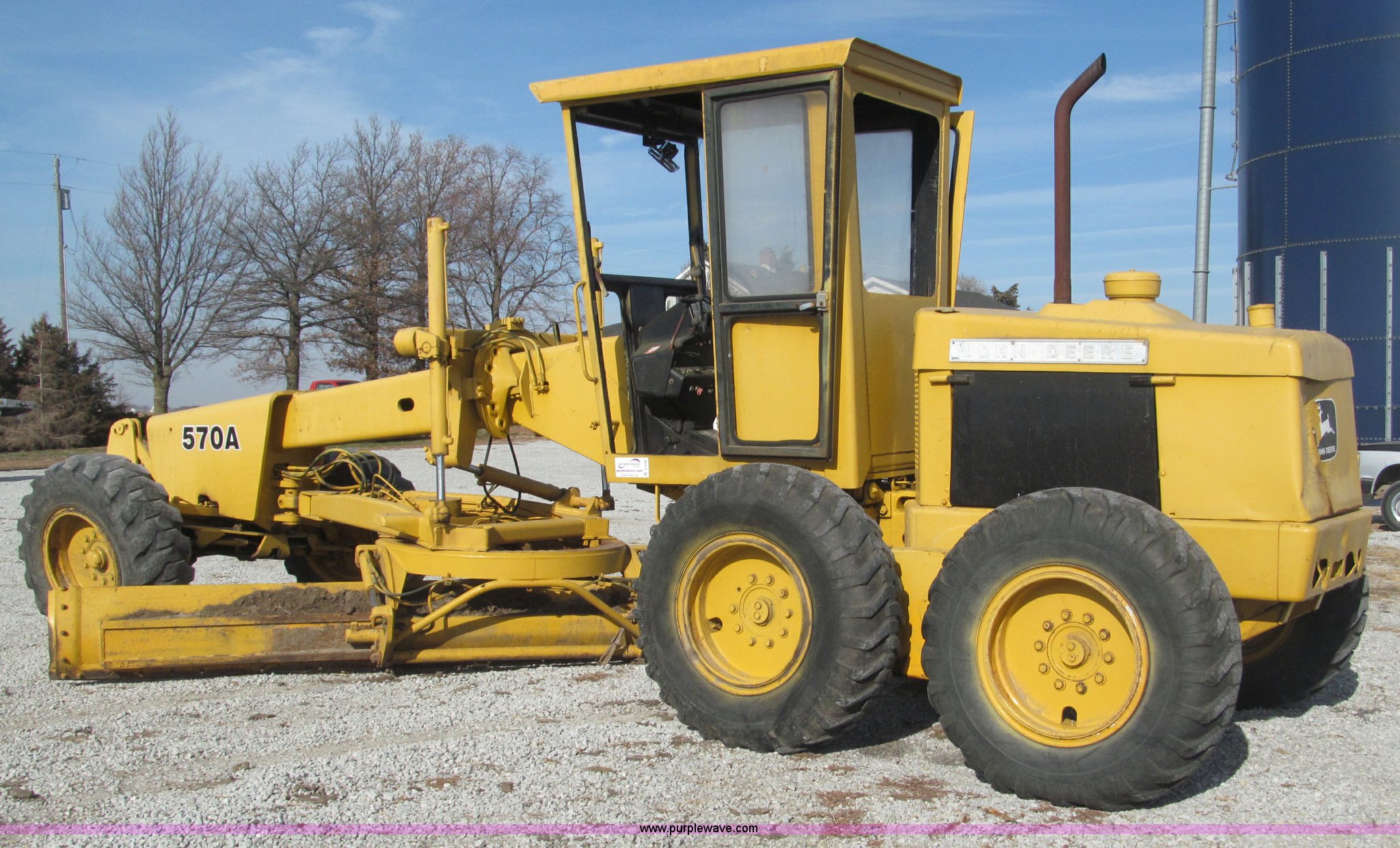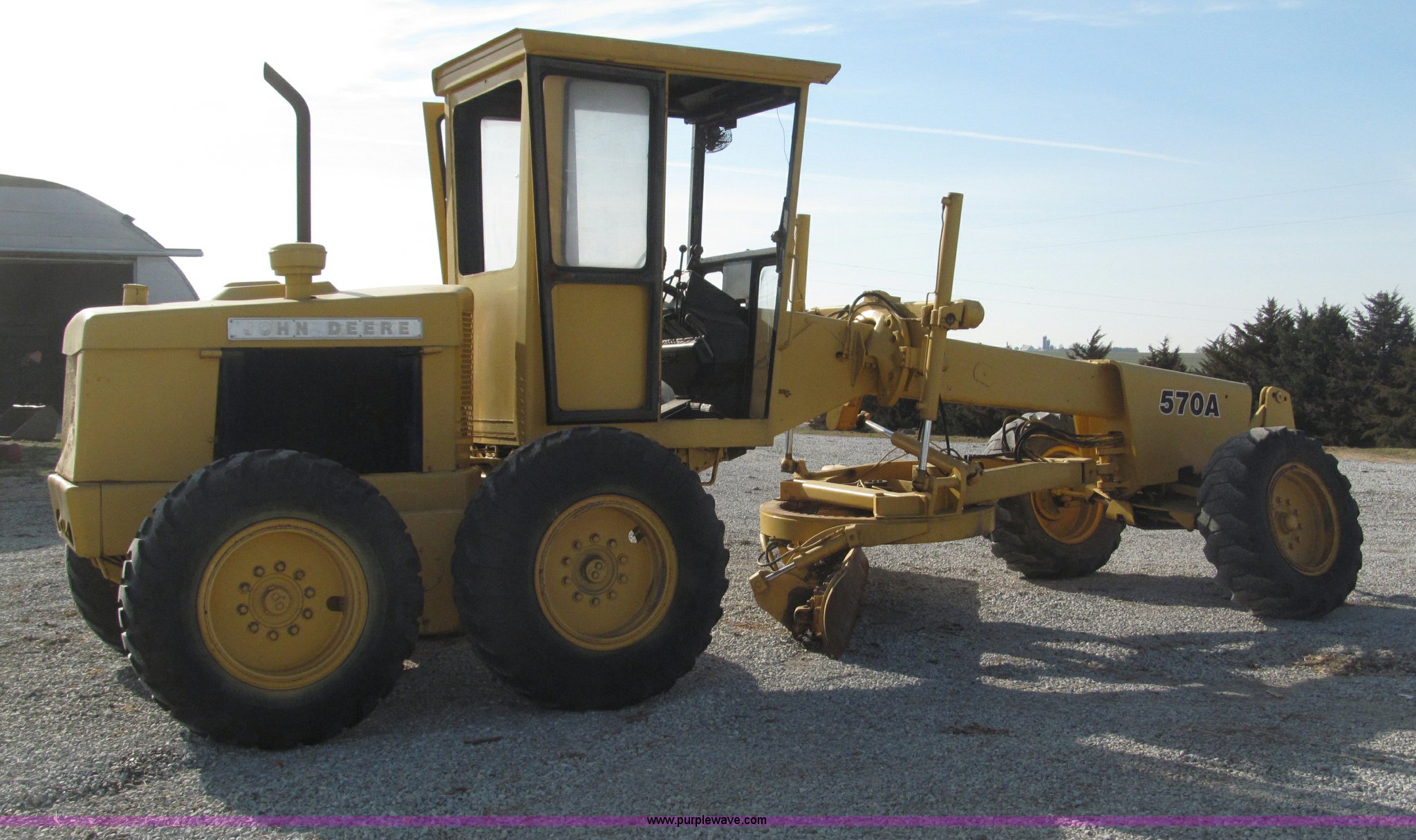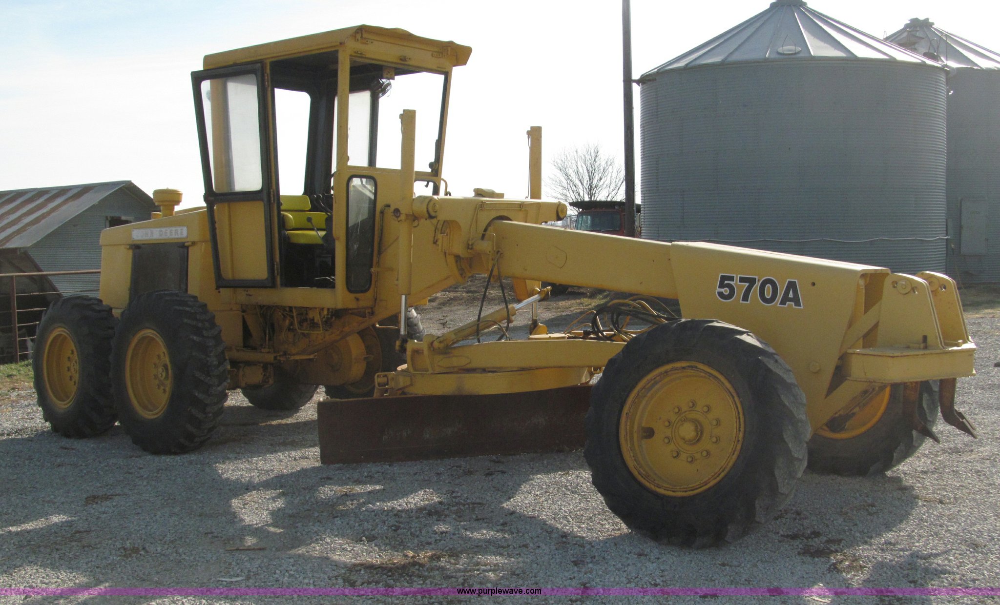 Purple Wave is selling a used Motor Grader in Nebraska. This item is a 1978 John Deere 570A motor grader with the following: John Deere 329 CID six cylinder diesel engine, 85 HP, Serial T06359D192331, Powershift transmission, 8F-4R gears, Four wheel drive, Locking differential, Canopy, High cab profile, Suspension seat, Articulated frame, 12' moldboard, Tip control, Side shift, Front mounted scarifier, Three teeth, Hydraulic front wheel lean, Blade rotation, Blade pitch/height, Frame steer, Circle side shift, Hand and foot throttle, Hand operating parking brake, Oscillating front axle, 15.5-25 tires, 21,703 lbs. base operating weight, Windows missing and damaged, Rust, Tires weather cracked, Serial 570A-07206T