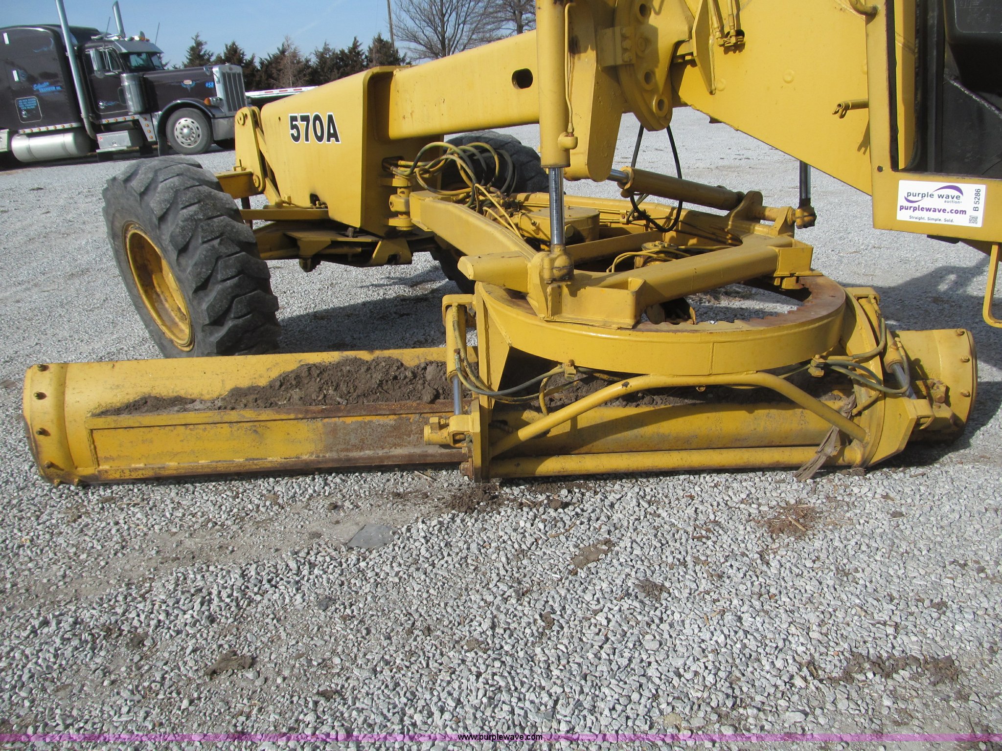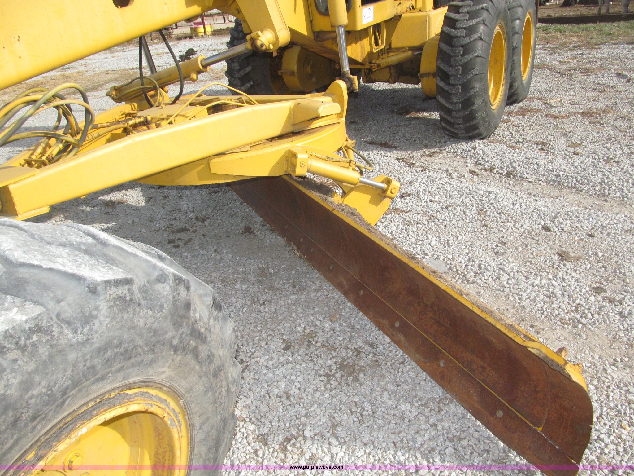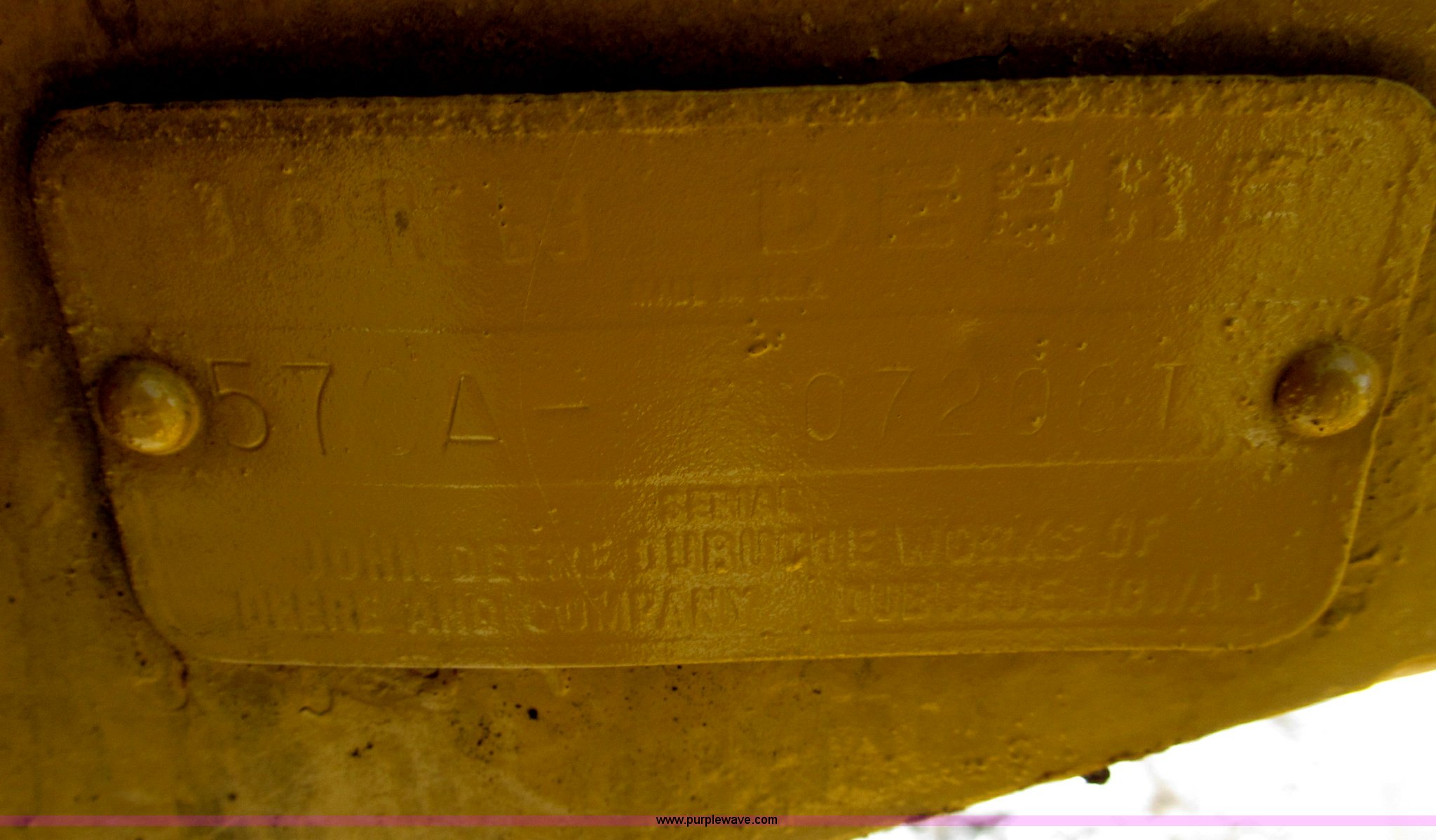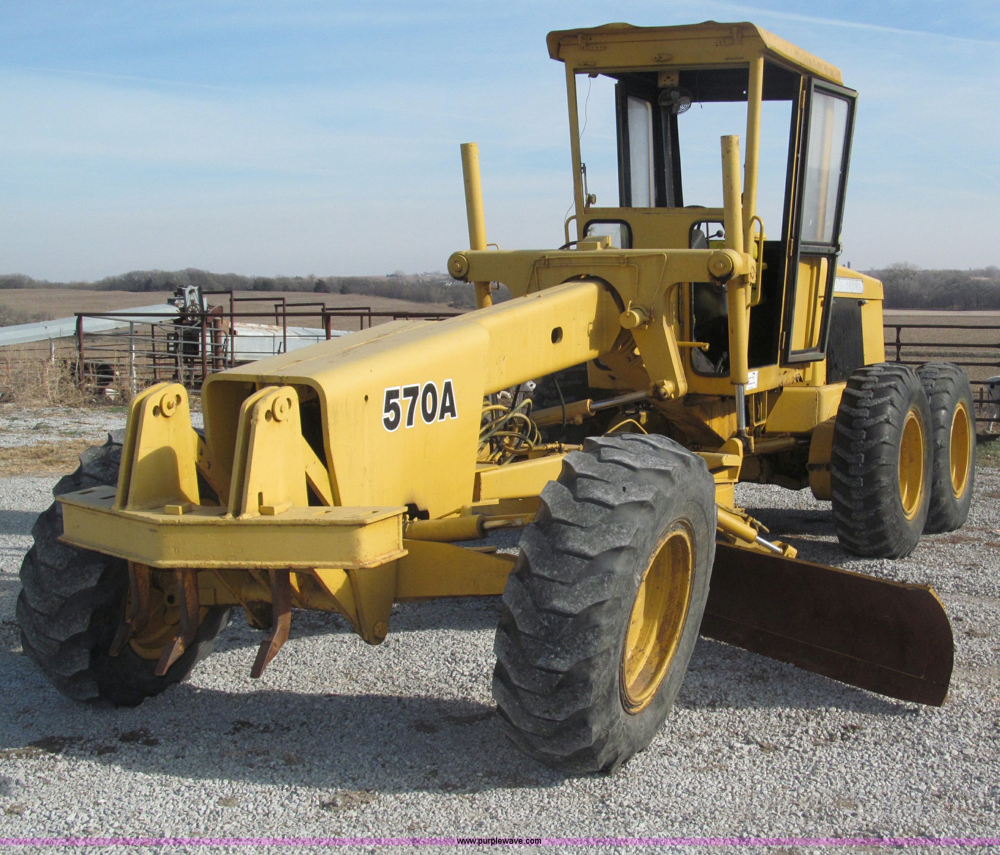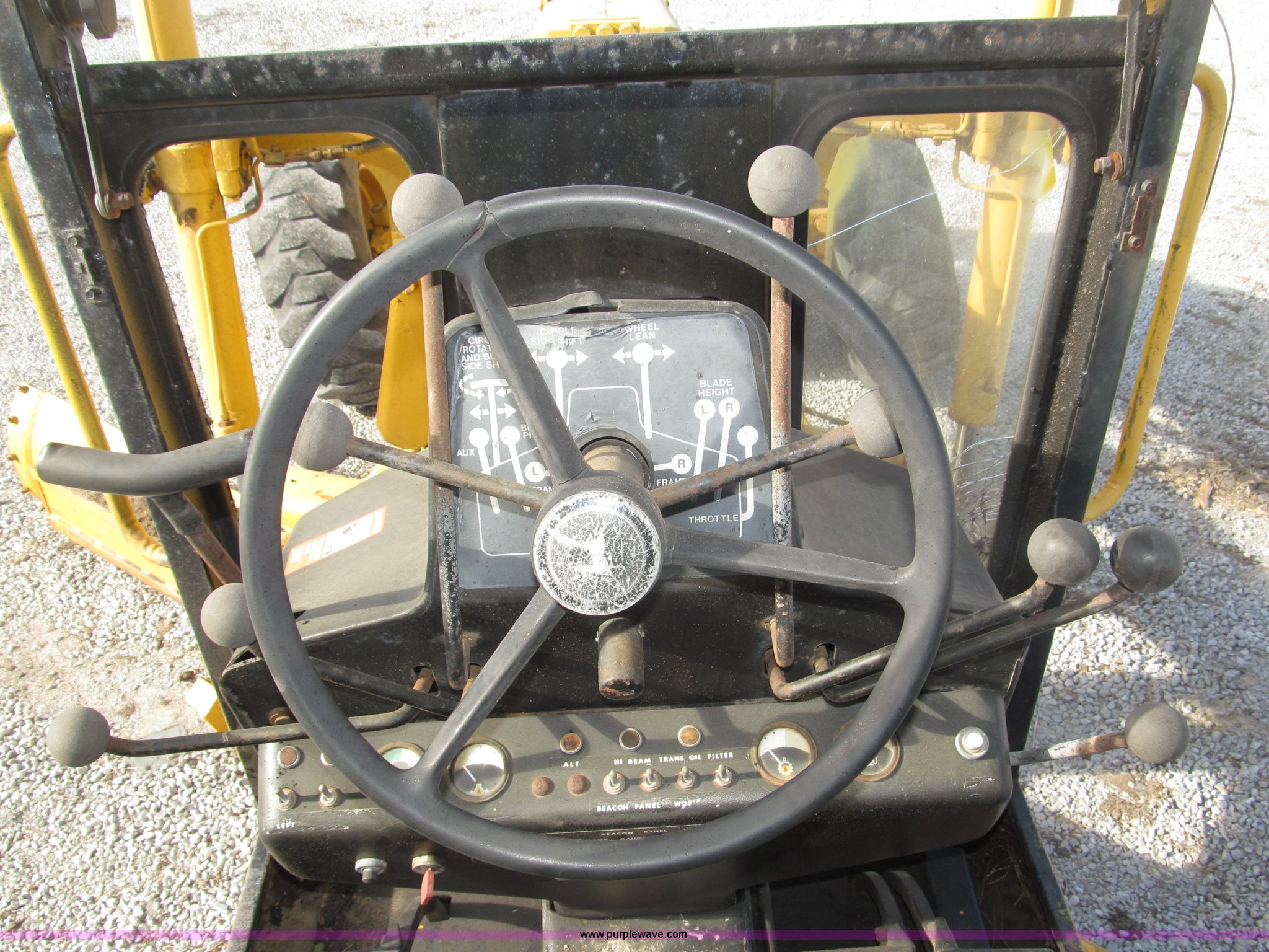 Purple Wave is selling a used Motor Grader in Nebraska. This item is a 1978 John Deere 570A motor grader with the following: John Deere 329 CID six cylinder diesel engine, 85 HP, Serial T06359D192331, Powershift transmission, 8F-4R gears, Four wheel drive, Locking differential, Canopy, High cab profile, Suspension seat, Articulated frame, 12' moldboard, Tip control, Side shift, Front mounted scarifier, Three teeth, Hydraulic front wheel lean, Blade rotation, Blade pitch/height, Frame steer, Circle side shift, Hand and foot throttle, Hand operating parking brake, Oscillating front axle, 15.5-25 tires, 21,703 lbs. base operating weight, Windows missing and damaged, Rust, Tires weather cracked, Serial 570A-07206T