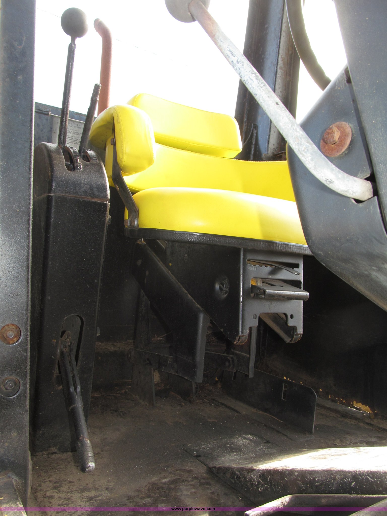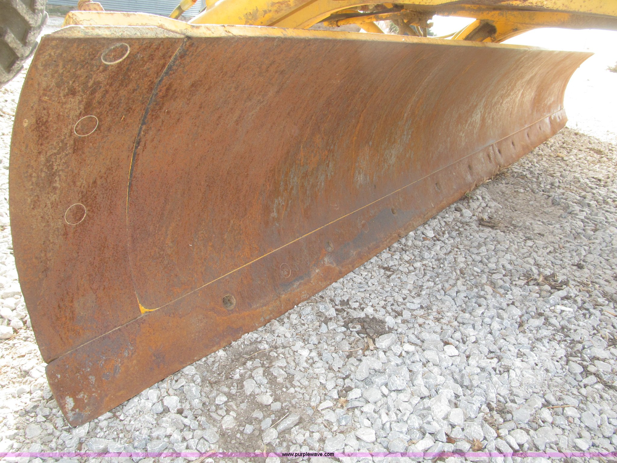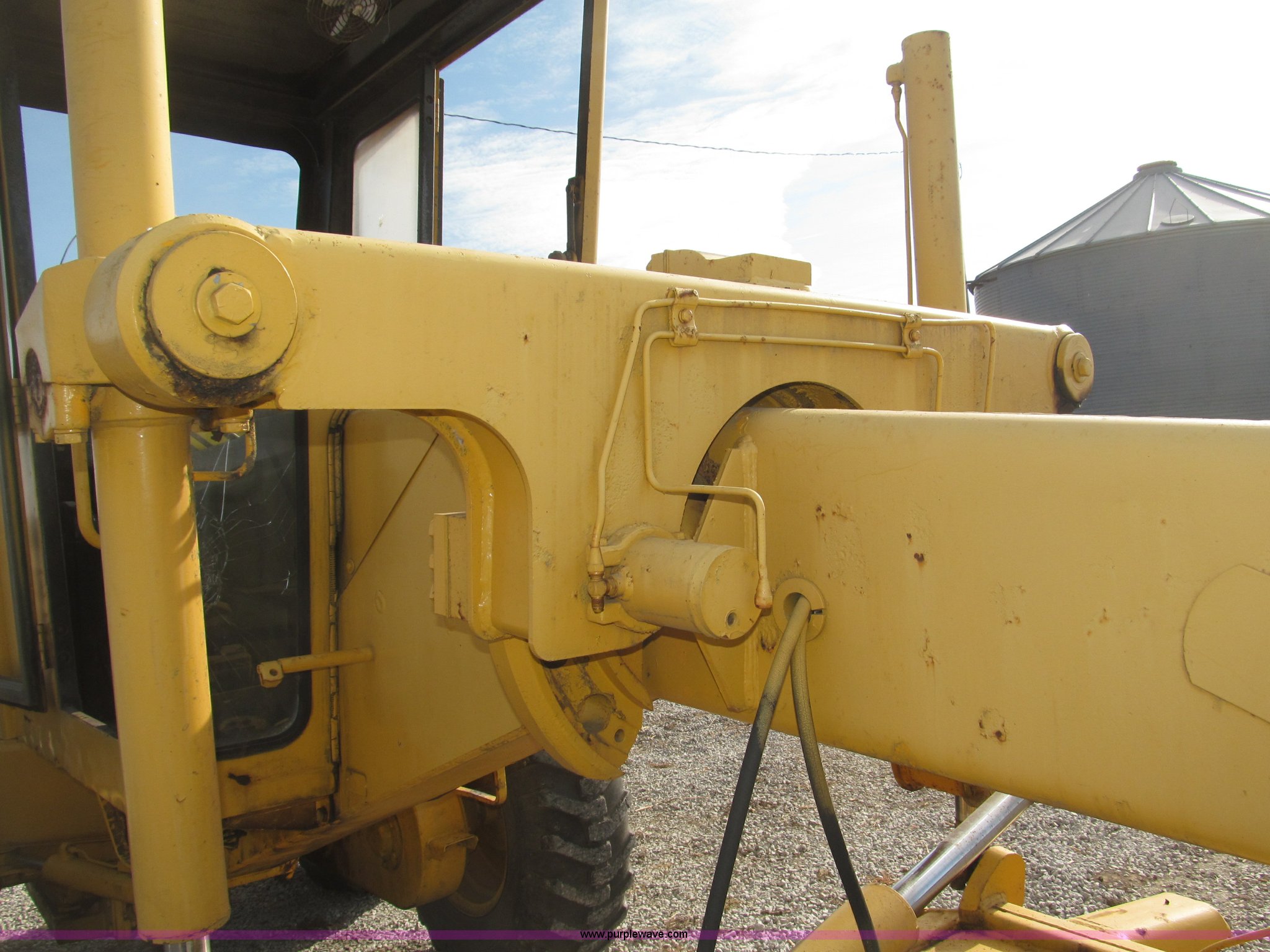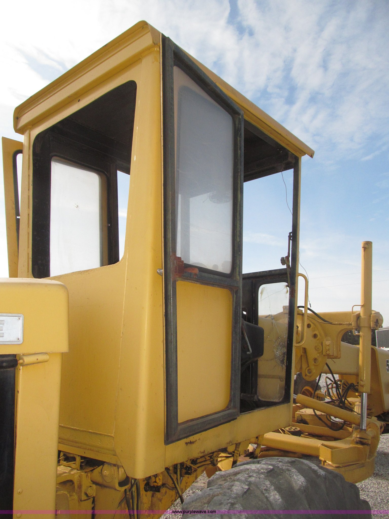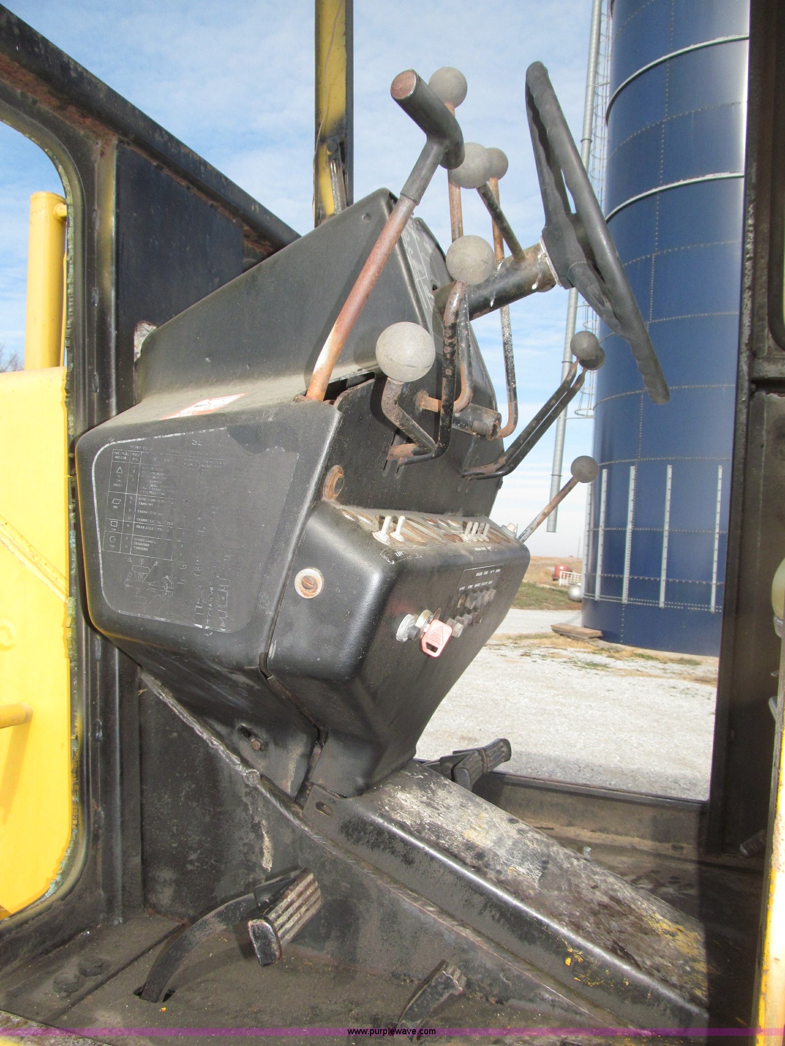 Purple Wave is selling a used Motor Grader in Nebraska. This item is a 1978 John Deere 570A motor grader with the following: John Deere 329 CID six cylinder diesel engine, 85 HP, Serial T06359D192331, Powershift transmission, 8F-4R gears, Four wheel drive, Locking differential, Canopy, High cab profile, Suspension seat, Articulated frame, 12' moldboard, Tip control, Side shift, Front mounted scarifier, Three teeth, Hydraulic front wheel lean, Blade rotation, Blade pitch/height, Frame steer, Circle side shift, Hand and foot throttle, Hand operating parking brake, Oscillating front axle, 15.5-25 tires, 21,703 lbs. base operating weight, Windows missing and damaged, Rust, Tires weather cracked, Serial 570A-07206T