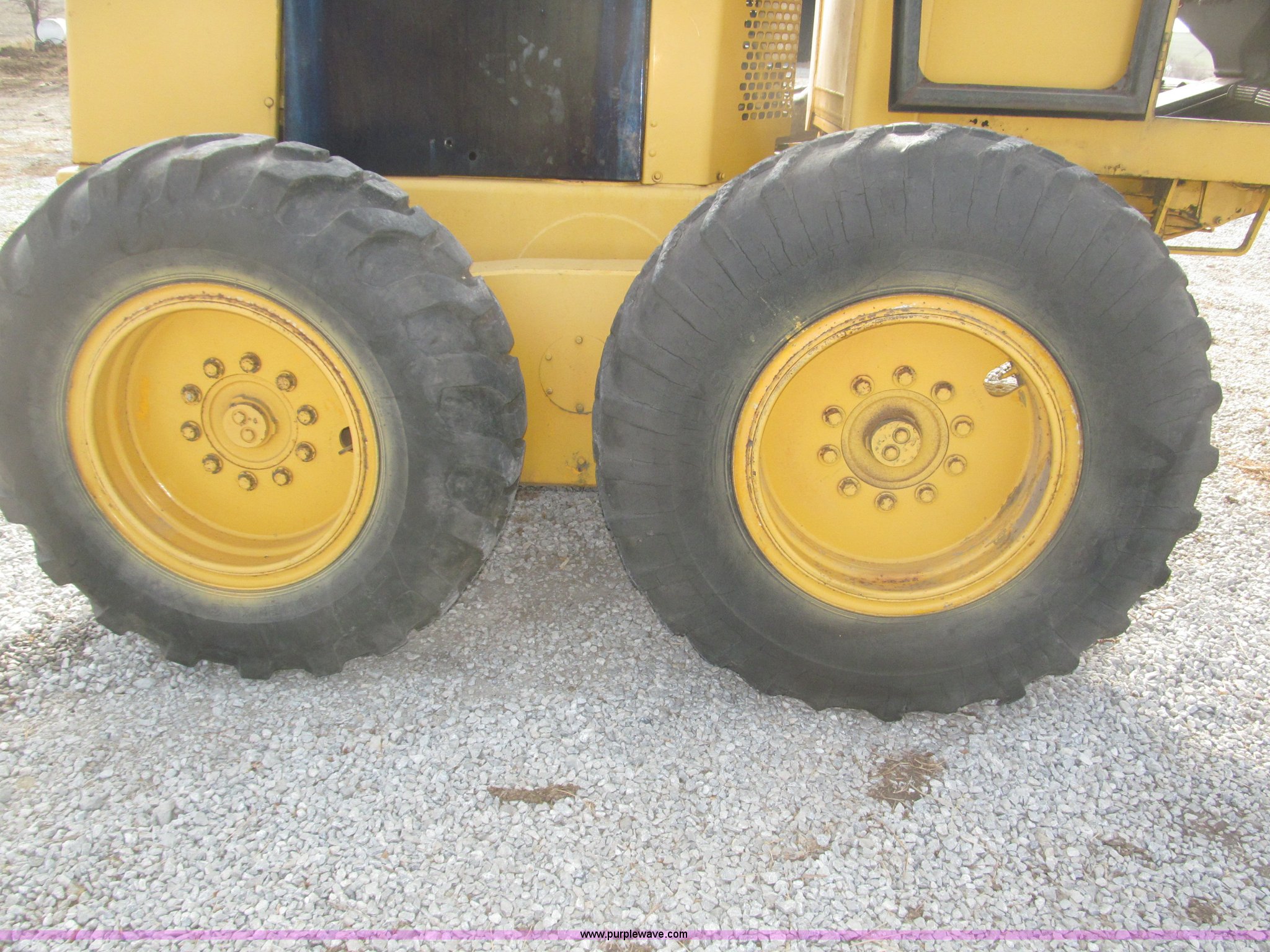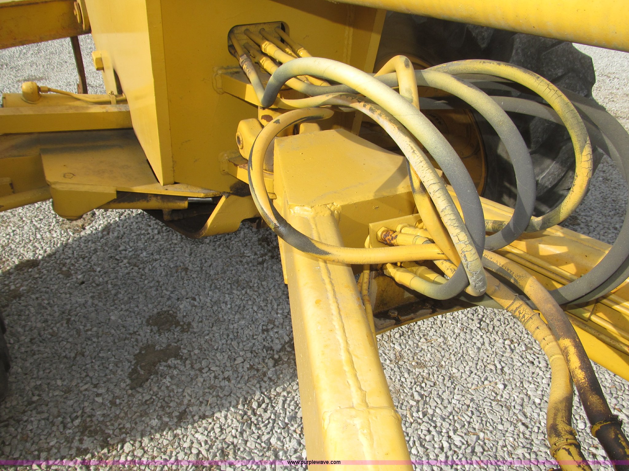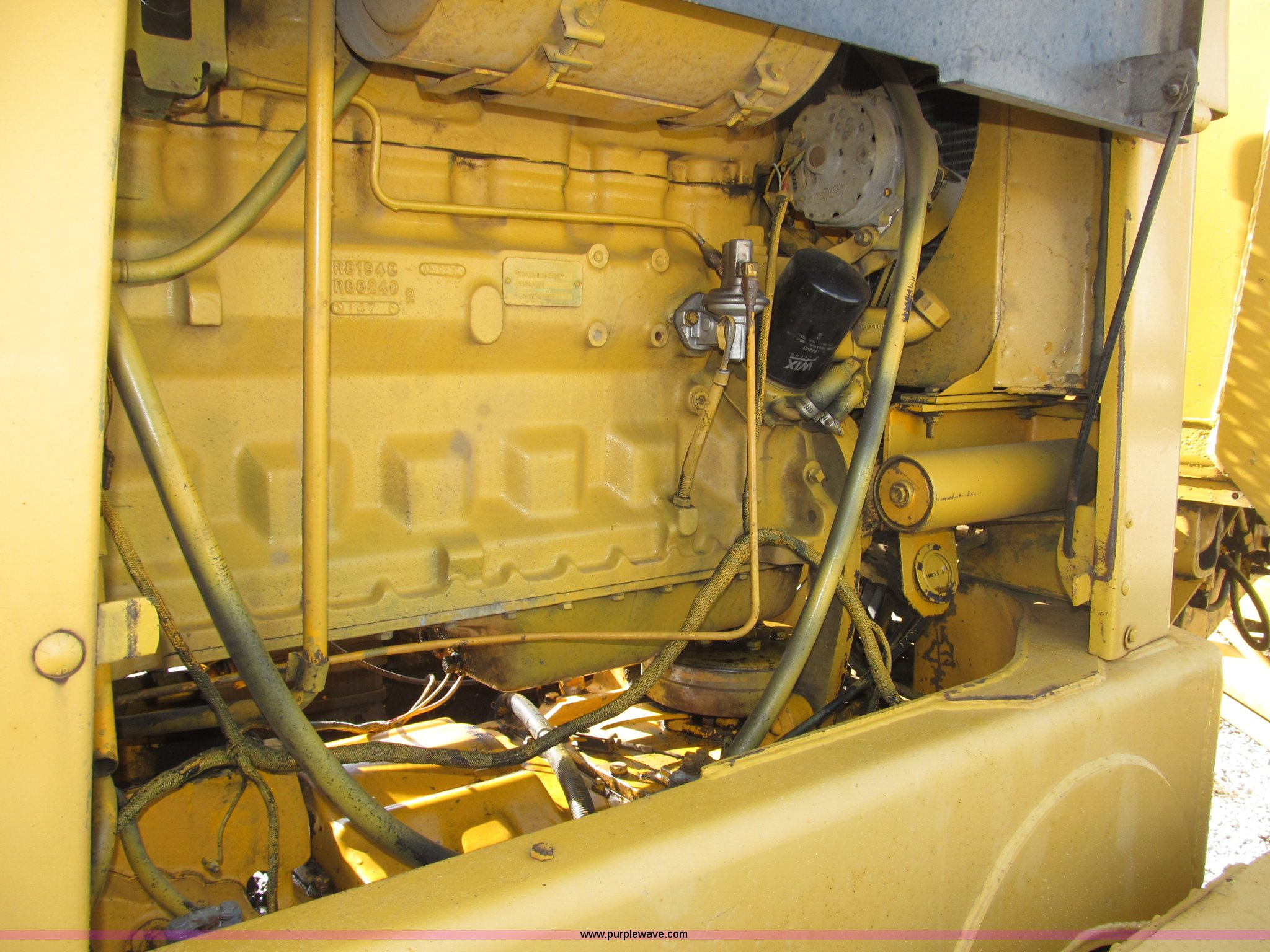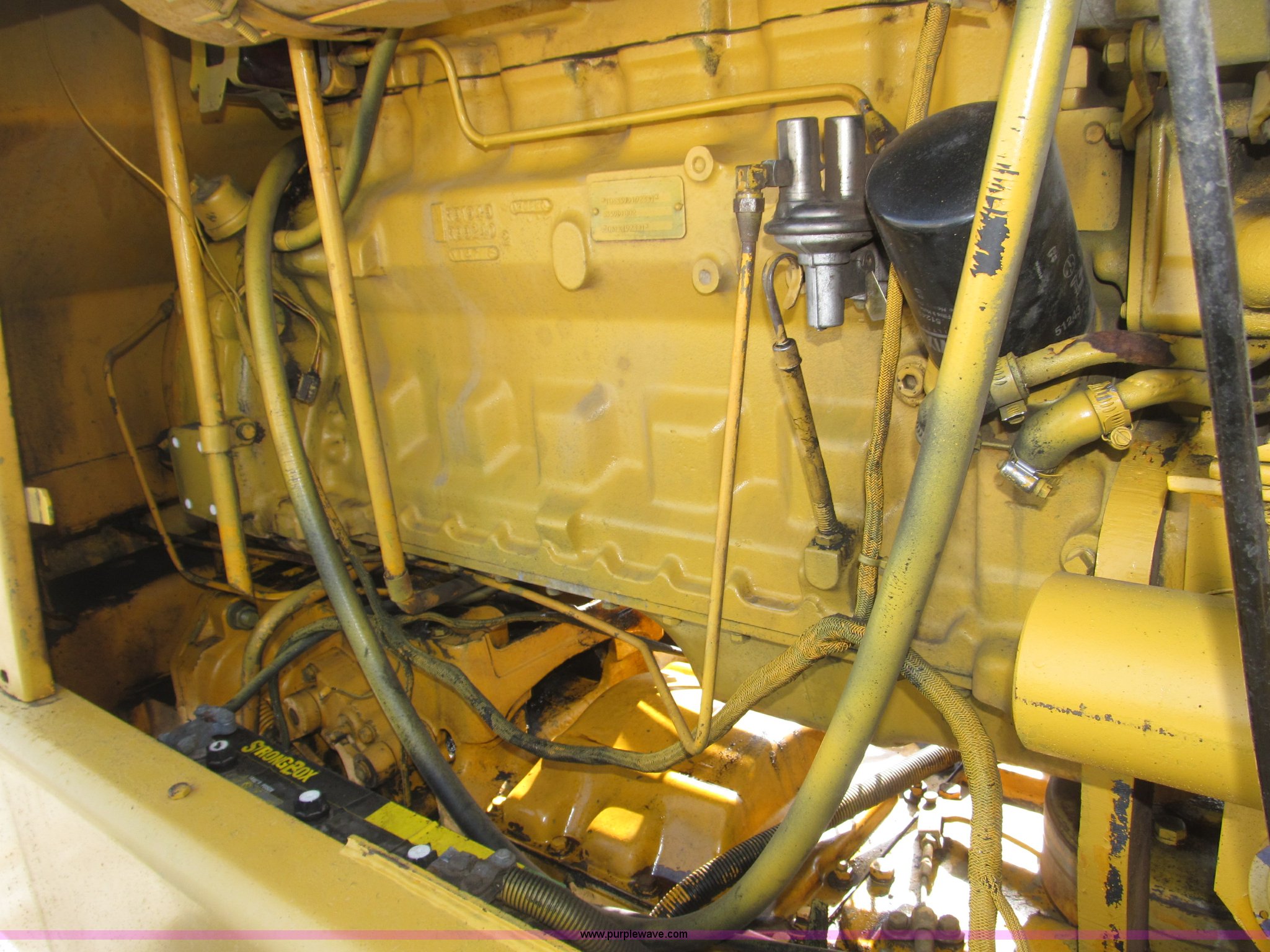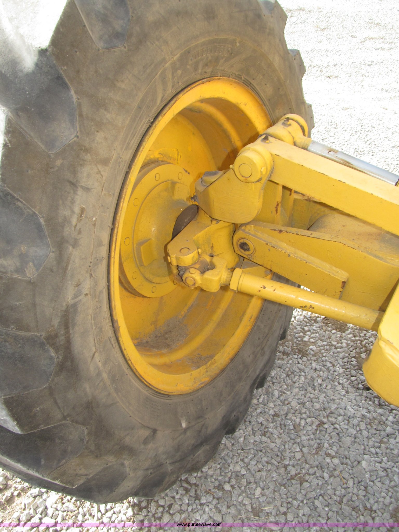 Purple Wave is selling a used Motor Grader in Nebraska. This item is a 1978 John Deere 570A motor grader with the following: John Deere 329 CID six cylinder diesel engine, 85 HP, Serial T06359D192331, Powershift transmission, 8F-4R gears, Four wheel drive, Locking differential, Canopy, High cab profile, Suspension seat, Articulated frame, 12' moldboard, Tip control, Side shift, Front mounted scarifier, Three teeth, Hydraulic front wheel lean, Blade rotation, Blade pitch/height, Frame steer, Circle side shift, Hand and foot throttle, Hand operating parking brake, Oscillating front axle, 15.5-25 tires, 21,703 lbs. base operating weight, Windows missing and damaged, Rust, Tires weather cracked, Serial 570A-07206T