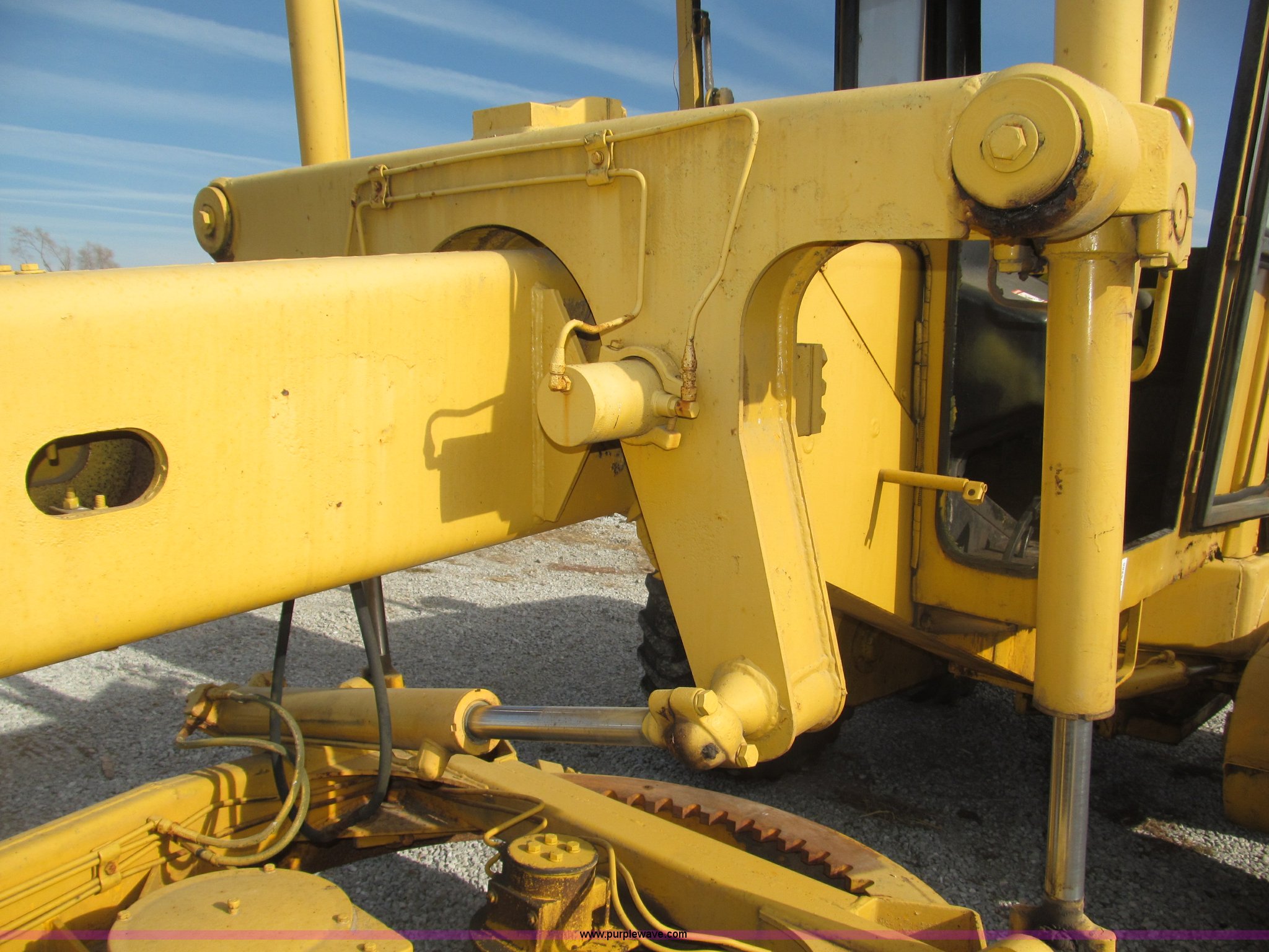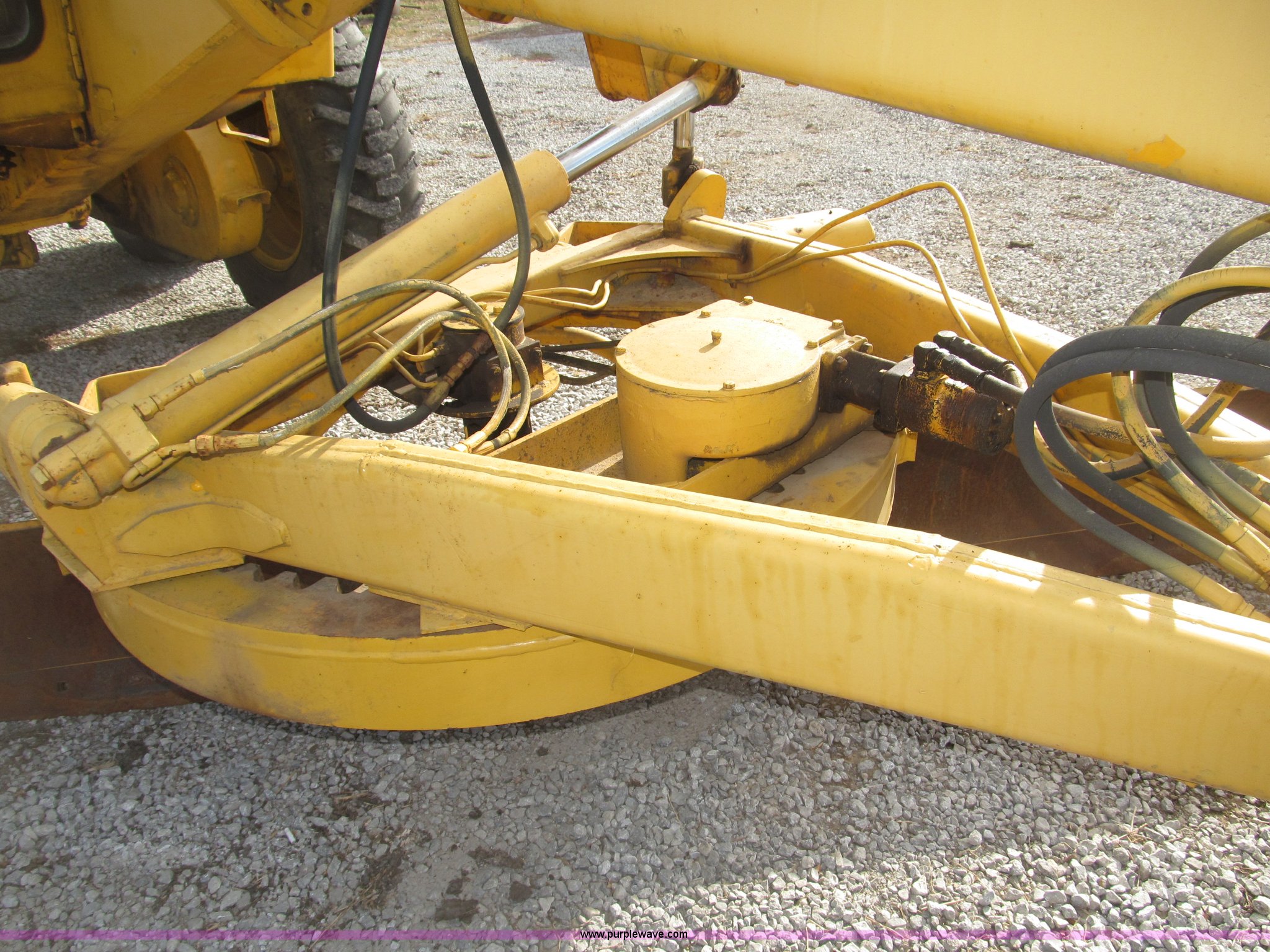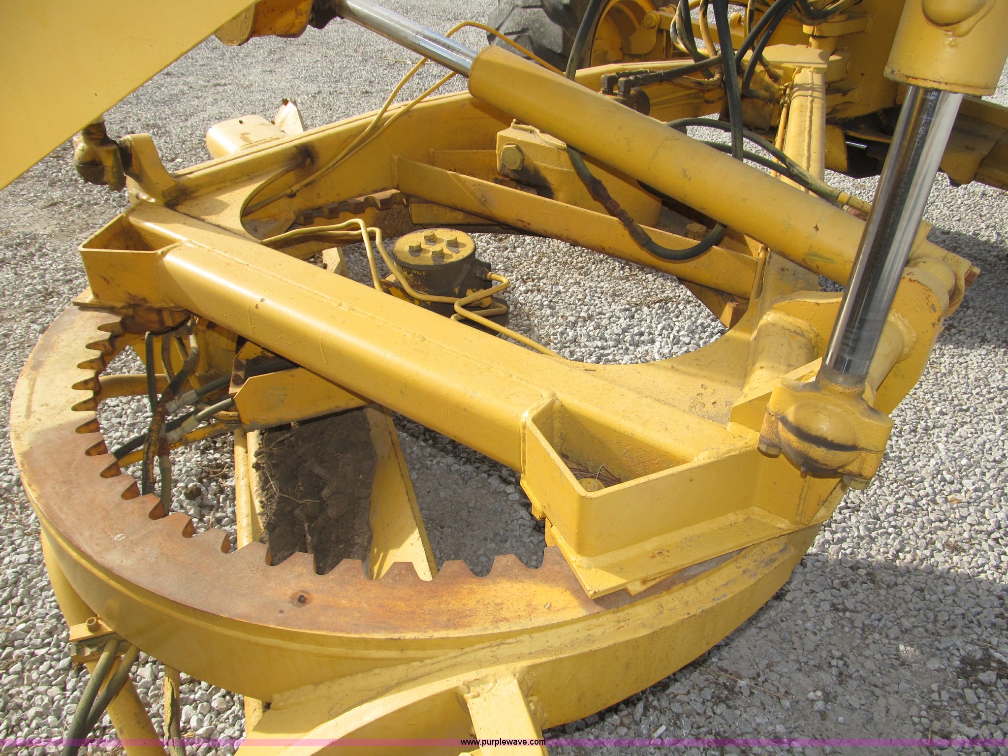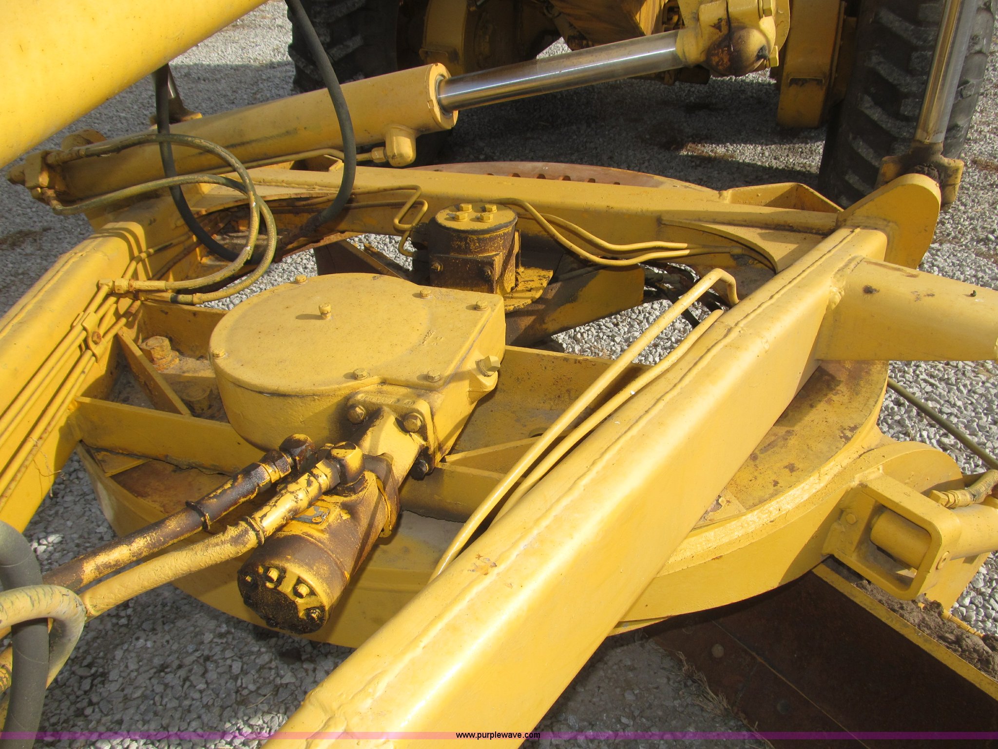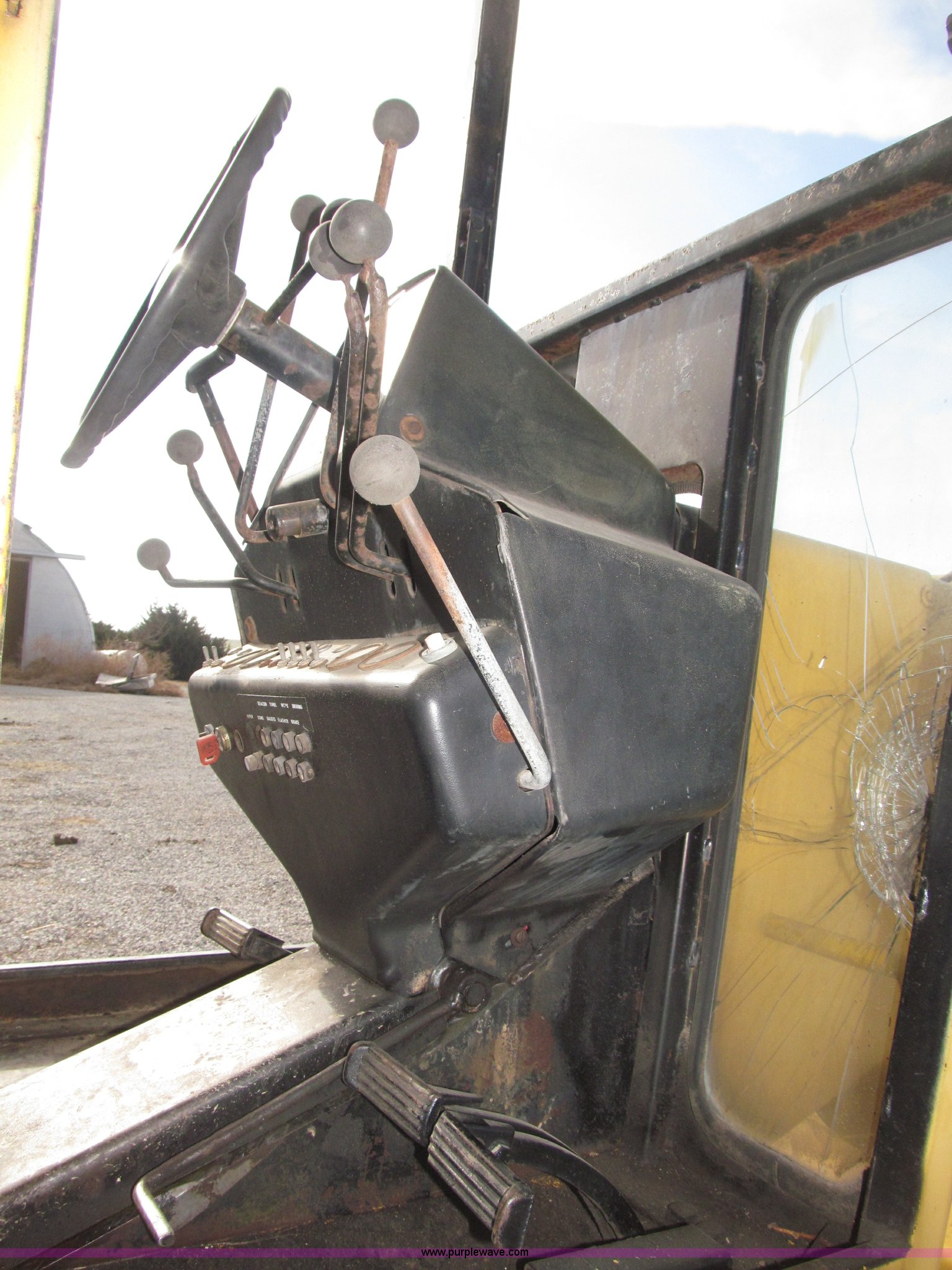 Purple Wave is selling a used Motor Grader in Nebraska. This item is a 1978 John Deere 570A motor grader with the following: John Deere 329 CID six cylinder diesel engine, 85 HP, Serial T06359D192331, Powershift transmission, 8F-4R gears, Four wheel drive, Locking differential, Canopy, High cab profile, Suspension seat, Articulated frame, 12' moldboard, Tip control, Side shift, Front mounted scarifier, Three teeth, Hydraulic front wheel lean, Blade rotation, Blade pitch/height, Frame steer, Circle side shift, Hand and foot throttle, Hand operating parking brake, Oscillating front axle, 15.5-25 tires, 21,703 lbs. base operating weight, Windows missing and damaged, Rust, Tires weather cracked, Serial 570A-07206T