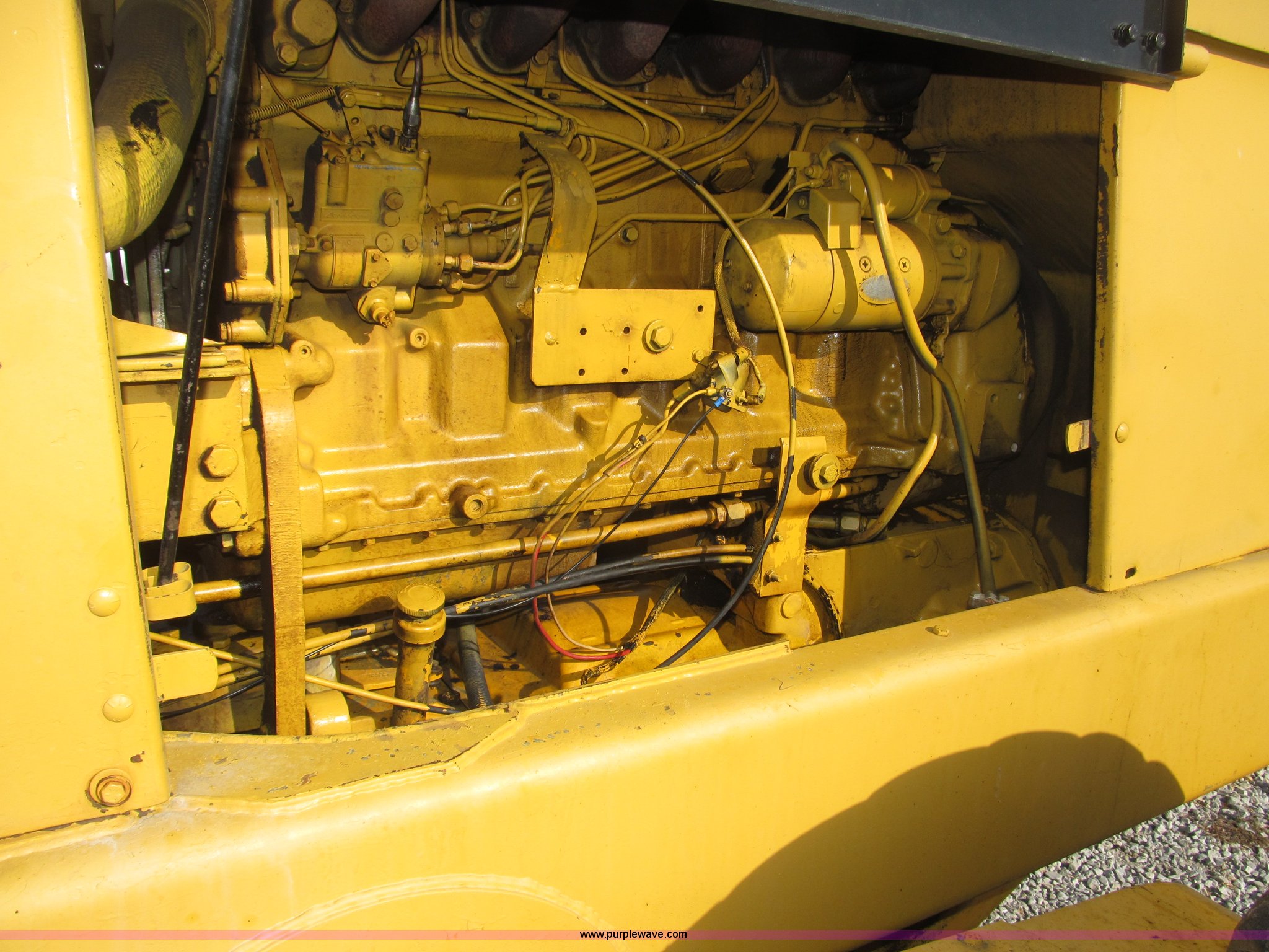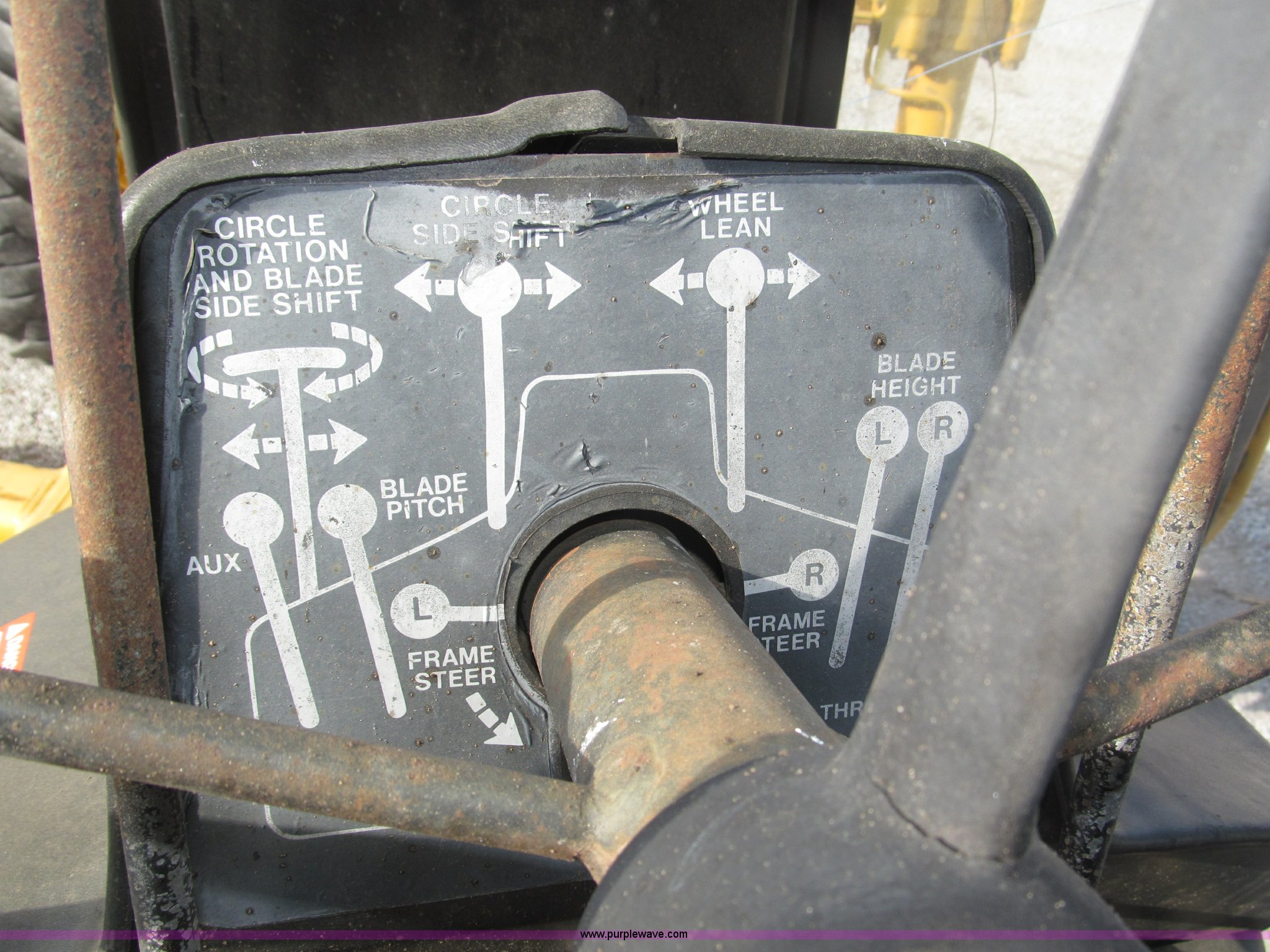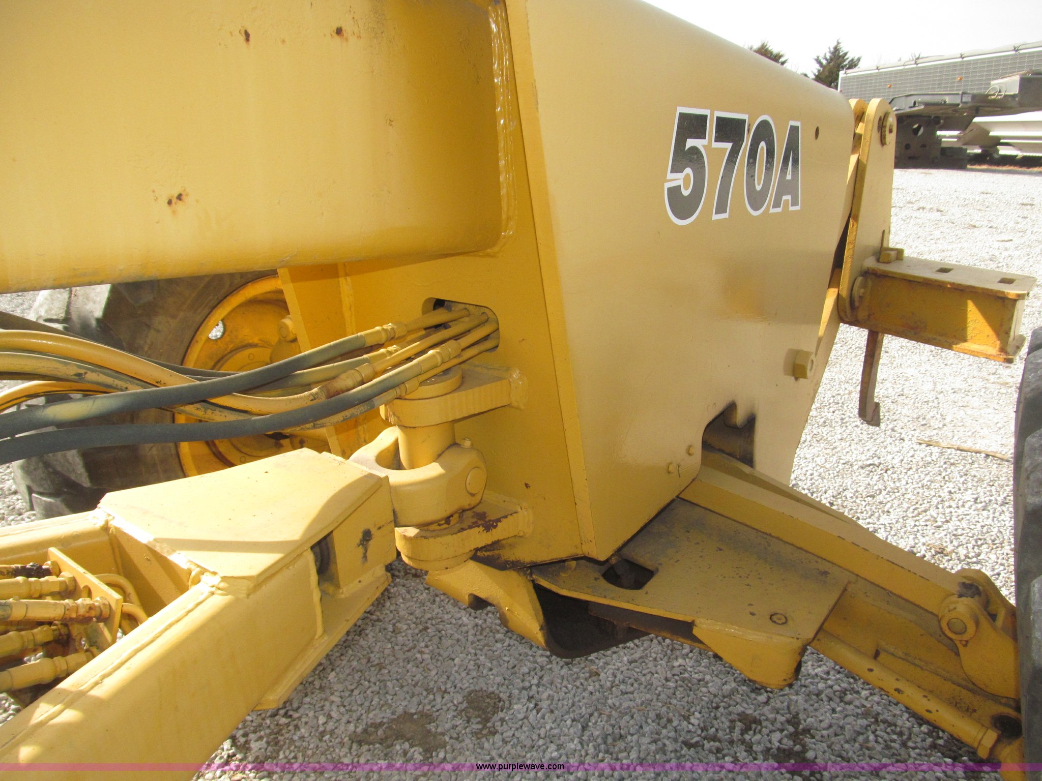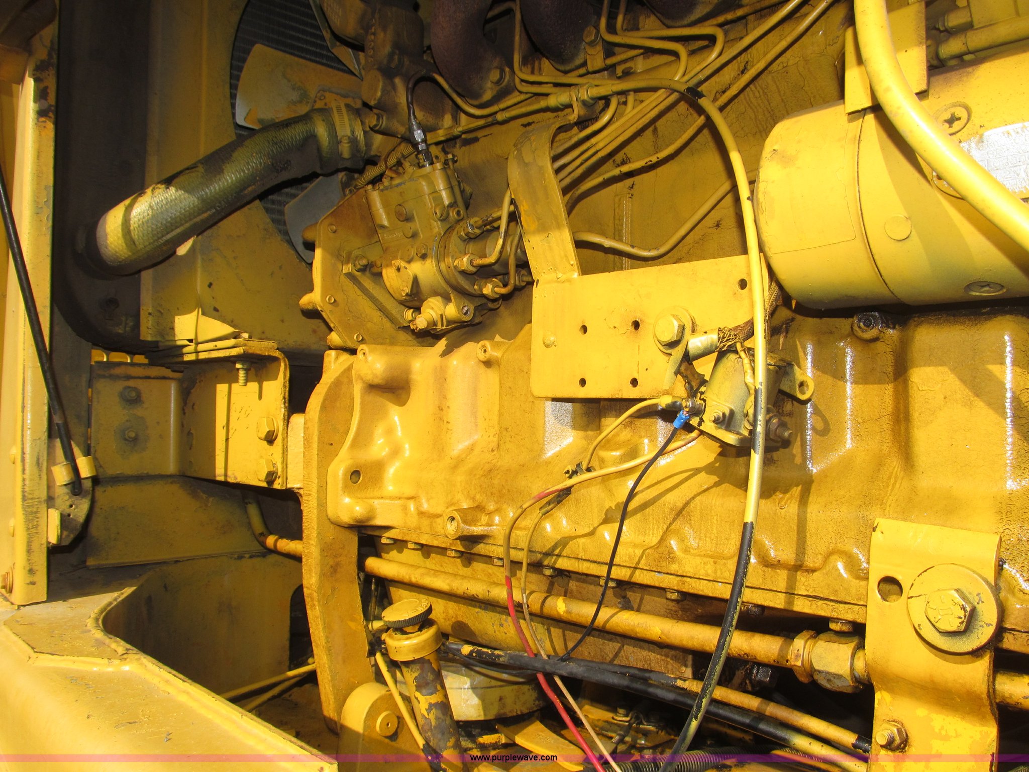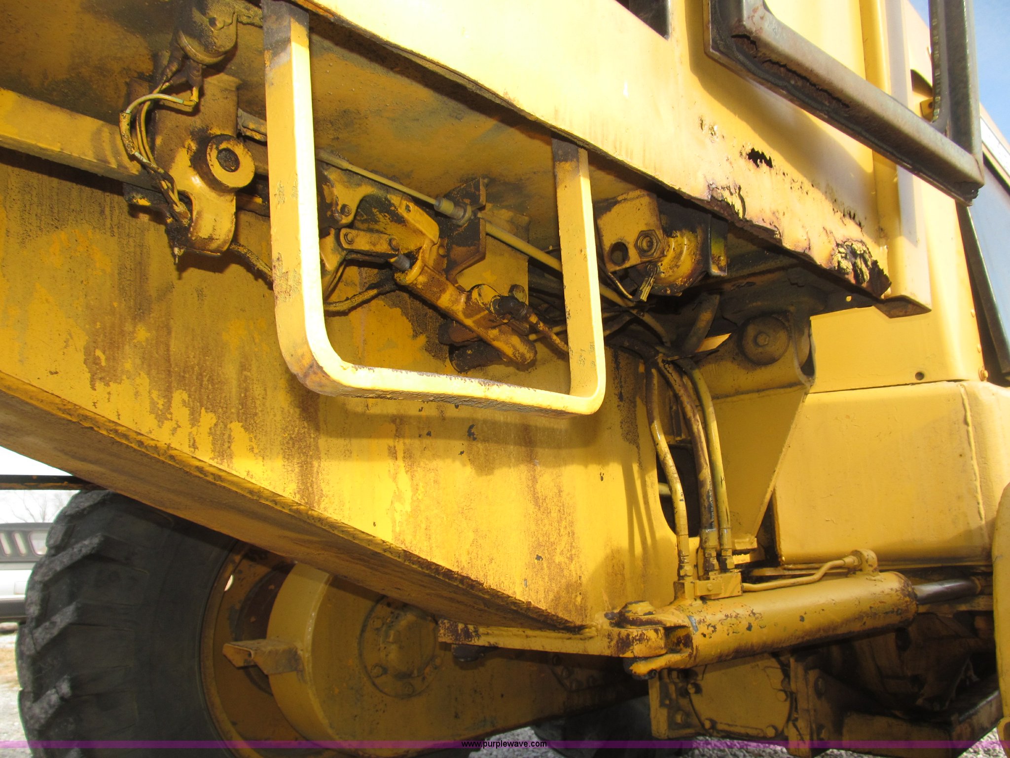 Purple Wave is selling a used Motor Grader in Nebraska. This item is a 1978 John Deere 570A motor grader with the following: John Deere 329 CID six cylinder diesel engine, 85 HP, Serial T06359D192331, Powershift transmission, 8F-4R gears, Four wheel drive, Locking differential, Canopy, High cab profile, Suspension seat, Articulated frame, 12' moldboard, Tip control, Side shift, Front mounted scarifier, Three teeth, Hydraulic front wheel lean, Blade rotation, Blade pitch/height, Frame steer, Circle side shift, Hand and foot throttle, Hand operating parking brake, Oscillating front axle, 15.5-25 tires, 21,703 lbs. base operating weight, Windows missing and damaged, Rust, Tires weather cracked, Serial 570A-07206T