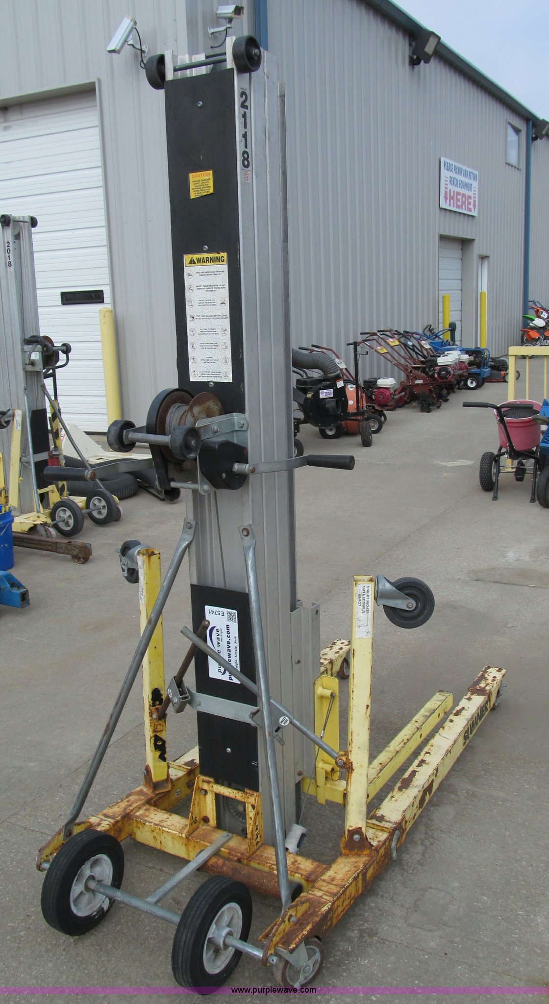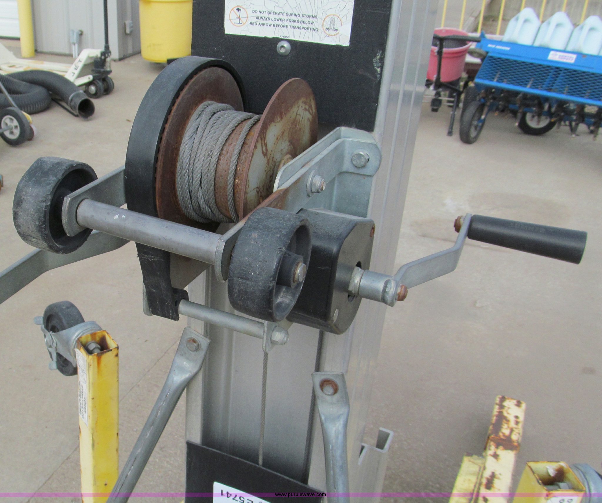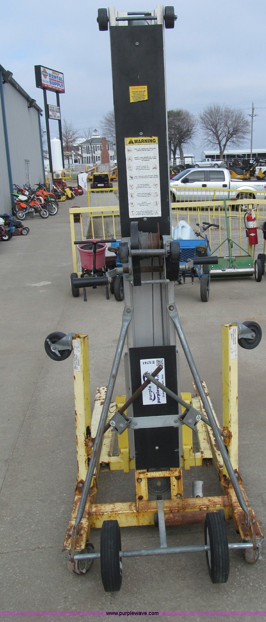 Purple Wave is selling a used Tools in Missouri. This item is a Sumner 2118 material lift with the following: 650 lbs capacity, 18' maximum lift height, 25" to 48" slide out fork, Casters, Fold up legs, Manual fold out stablizers