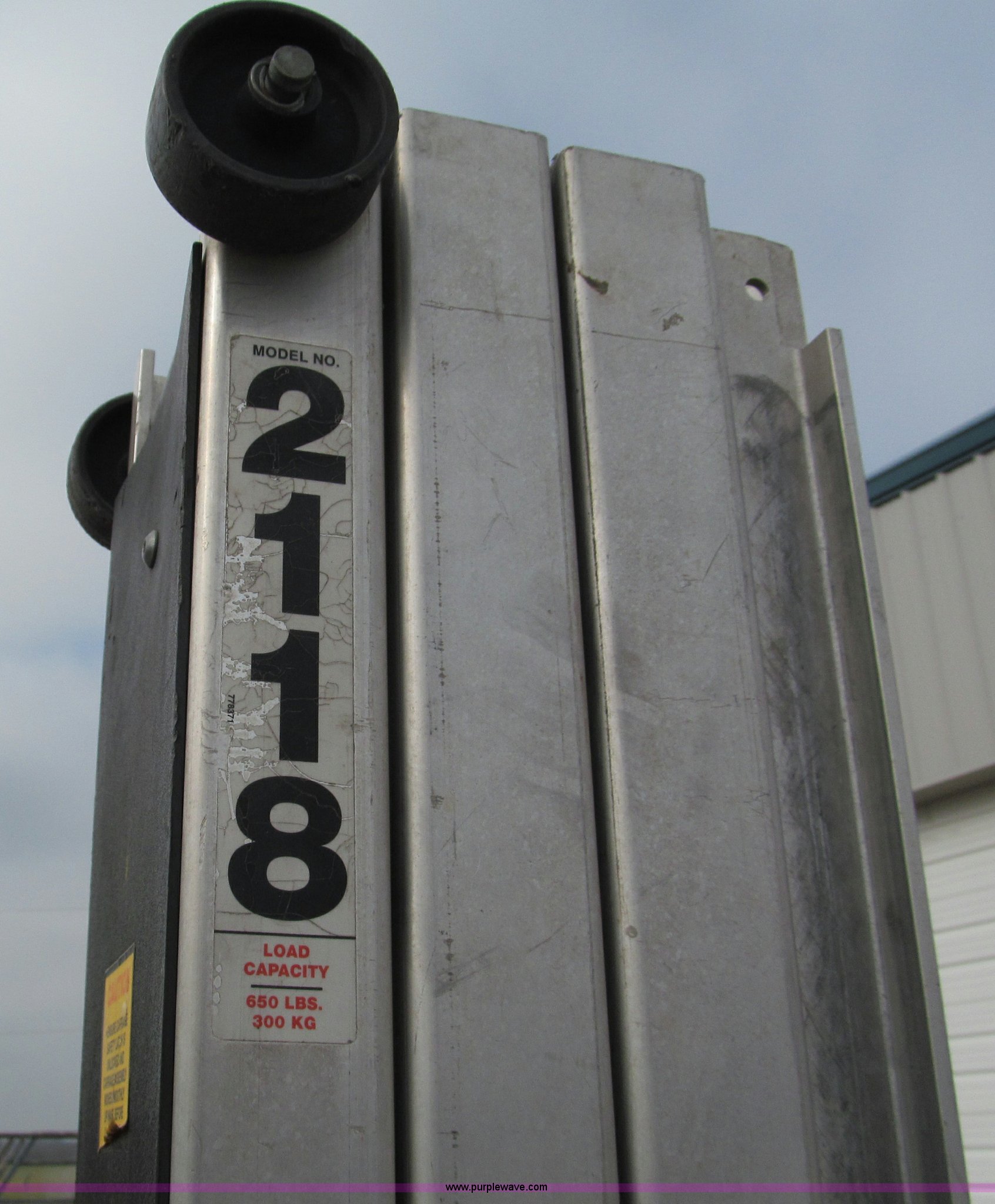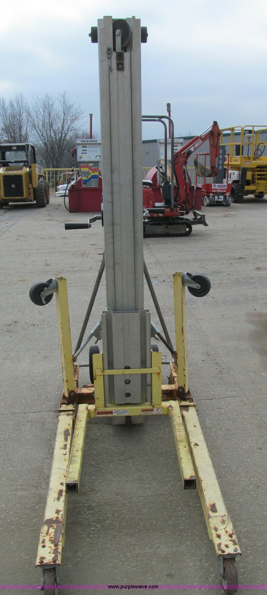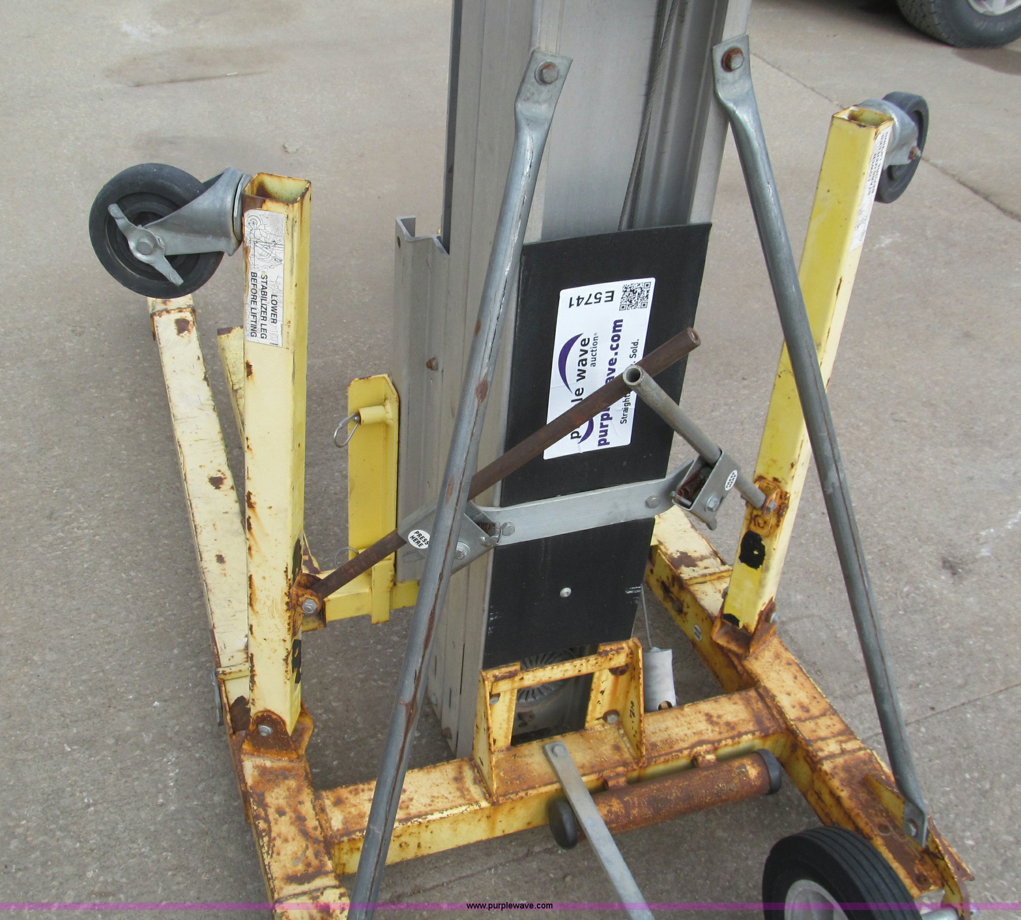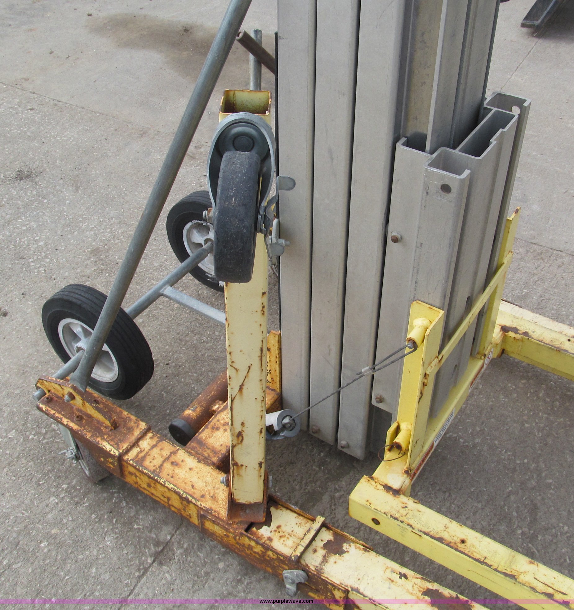 Purple Wave is selling a used Tools in Missouri. This item is a Sumner 2118 material lift with the following: 650 lbs capacity, 18' maximum lift height, 25" to 48" slide out fork, Casters, Fold up legs, Manual fold out stablizers