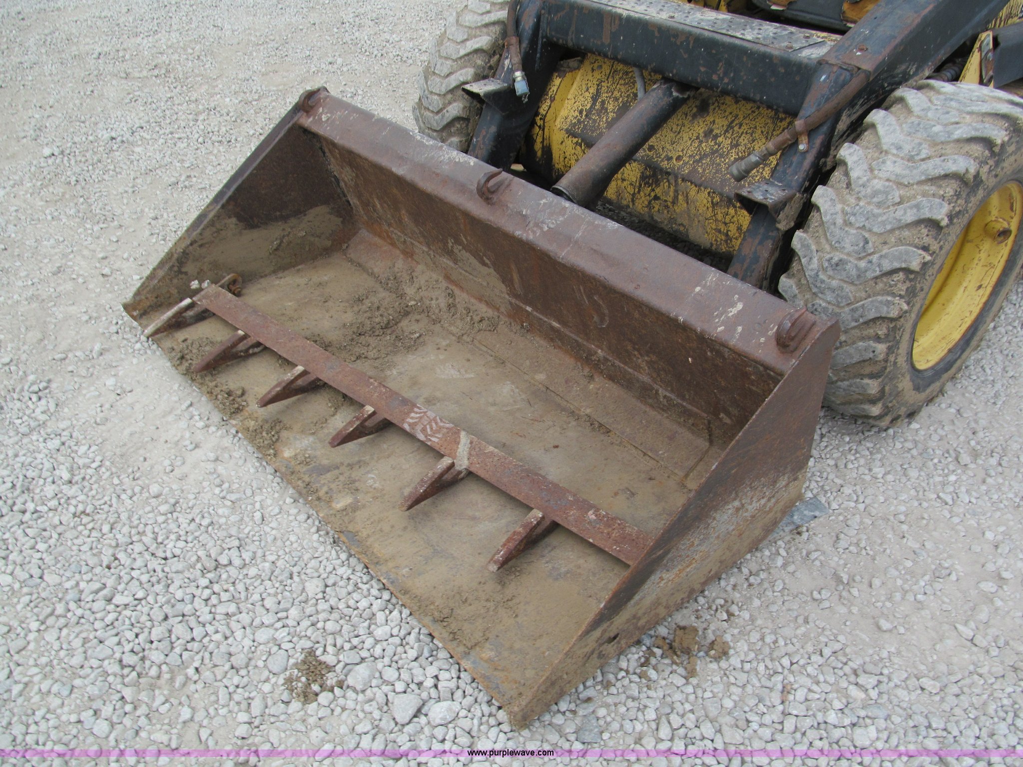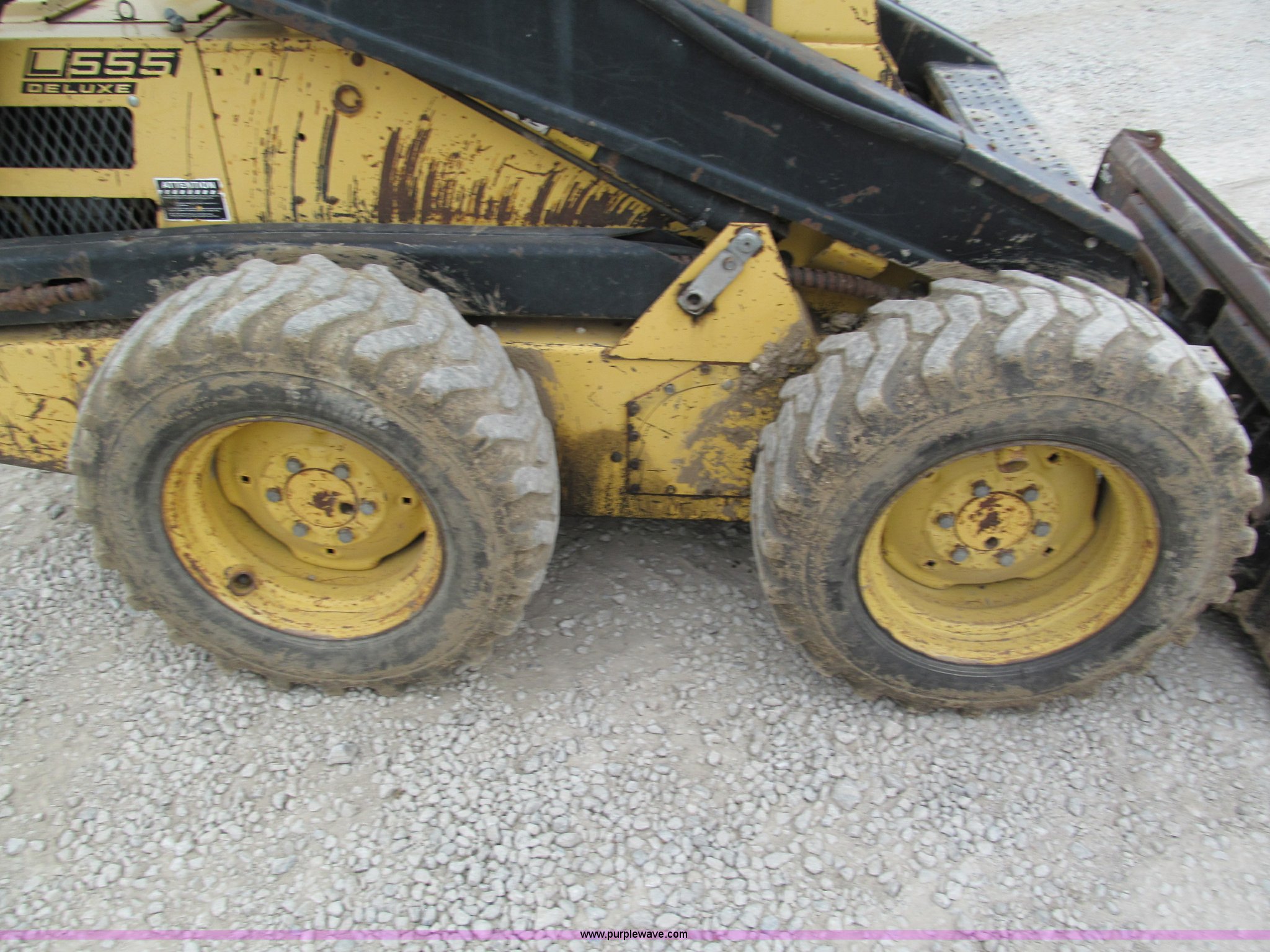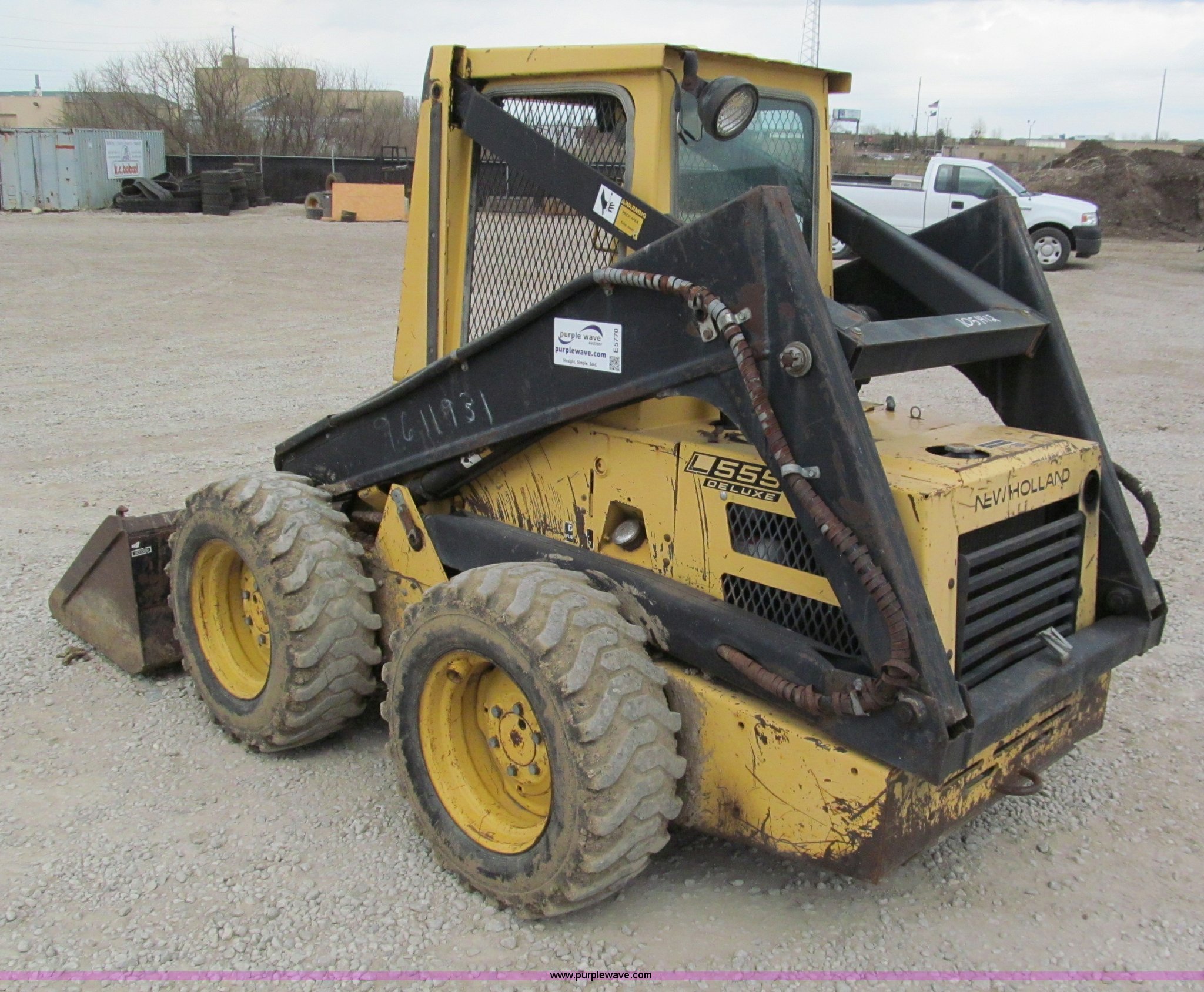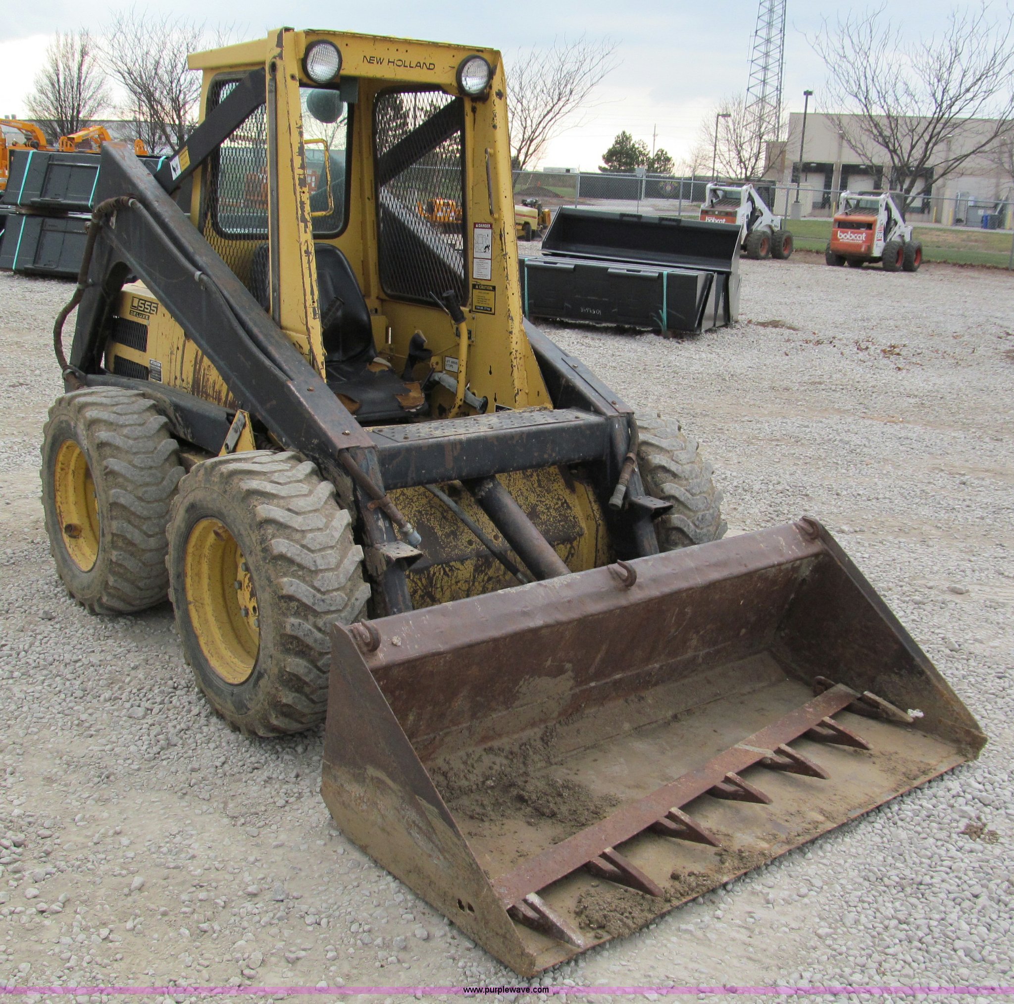 Purple Wave is selling a used Skid Steer Loader in Kansas. This item is a 1987 New Holland L555 Deluxe skid steer with the following: 2,209 hours on meter, Kubota four cylinder diesel engine, Foot loader controls, Auxiliary hydraulics, 64" smooth bucket with tooth bar, 10-16.5 tires, 4,994 lbs. base operating weight, Serial 713194, Unit# 1051412
