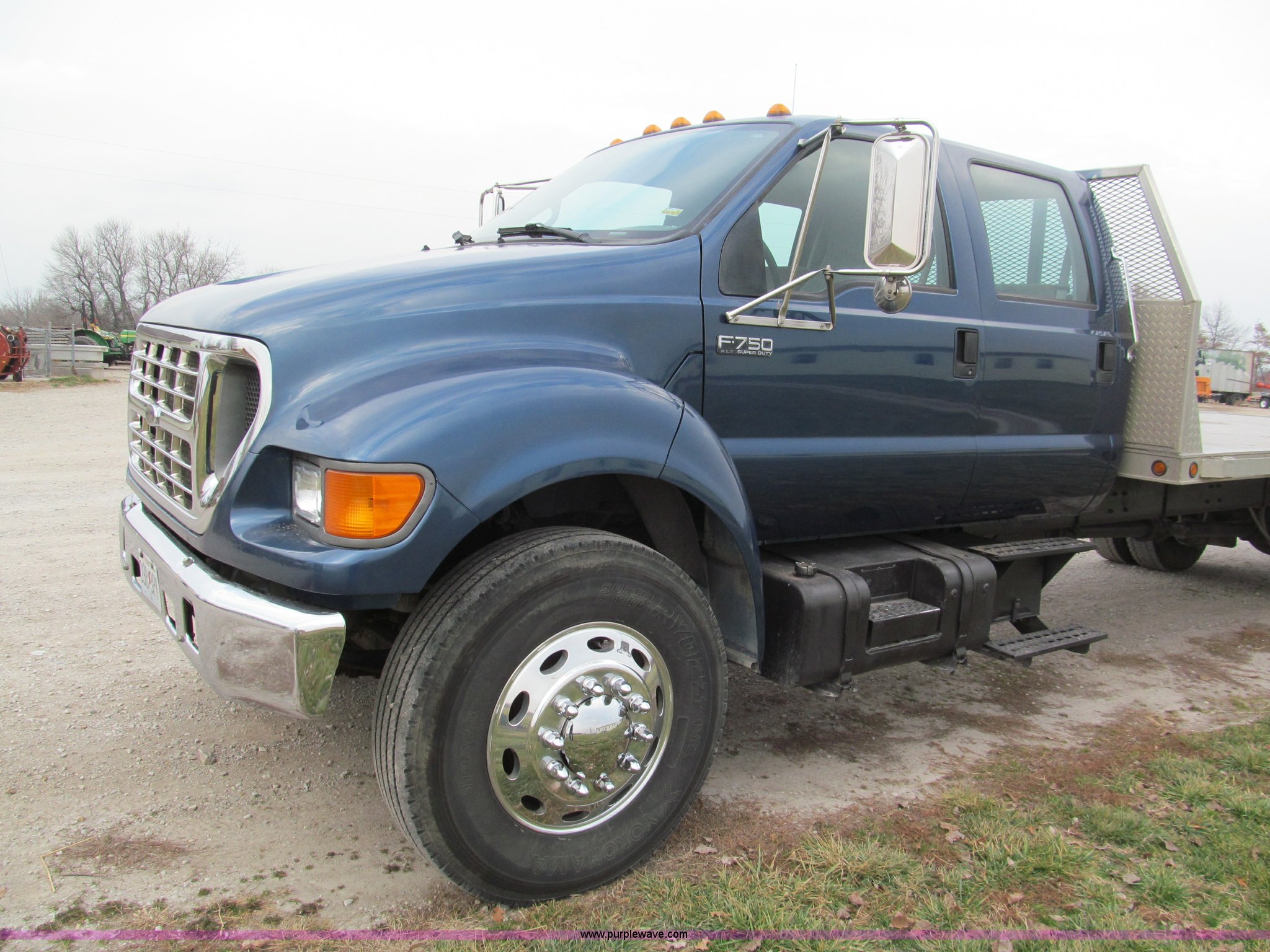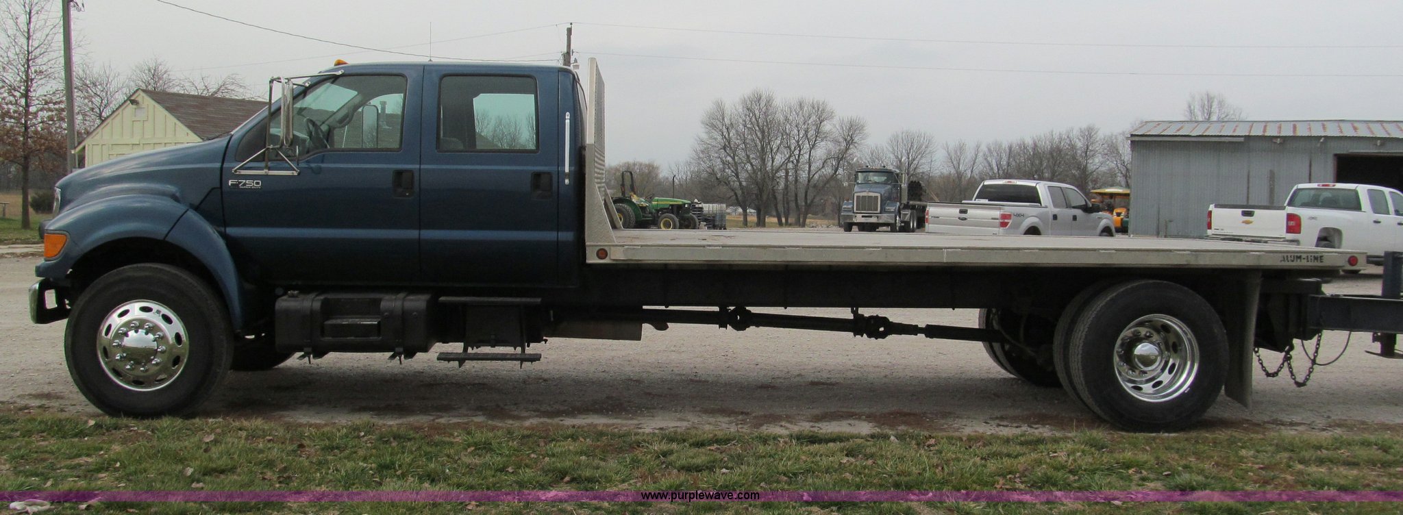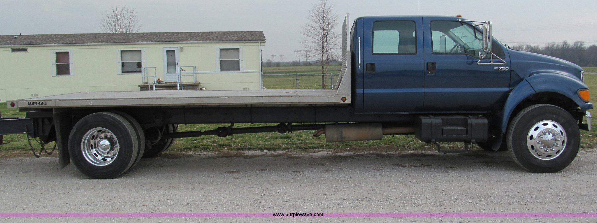 Purple Wave is selling a used Flat Bed Truck in Missouri. This item is a 2000 Ford F750 XLT quad cab flatbed truck with the following: 215,651 miles on odometer, Caterpillar 3126 turbo diesel engine, Allison automatic transmission, AC and heat, AM/FM/CD, Spring suspension seat, Power windows, CB radio, Electric brake controller, Six passenger capacity, Alum-Line flatbed, 17'L x 8'W, Aluminum headache rack, Rub rail, Chrome bumper, Block heater, Dual 50 gallon fuel tanks, Spring suspension, Aluminum wheels, Nut covers, Air brakes, Pintle hitch, Trailer air brakes, Rear receiver tubes for truck mounted forklift, 11R22.5 tires, 33,000 lbs GVWR, 12,000 lbs FAWR, 21,000 lbs RAWR
