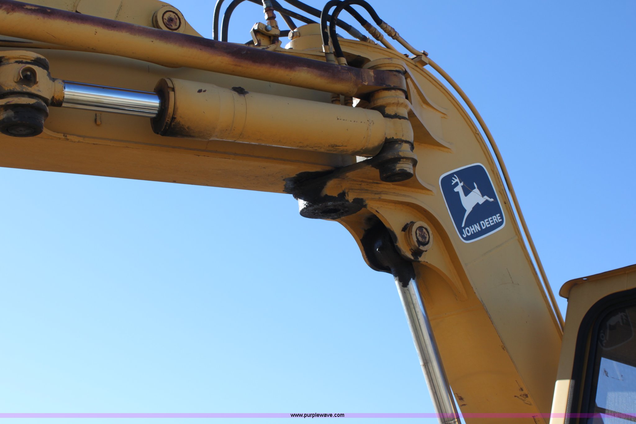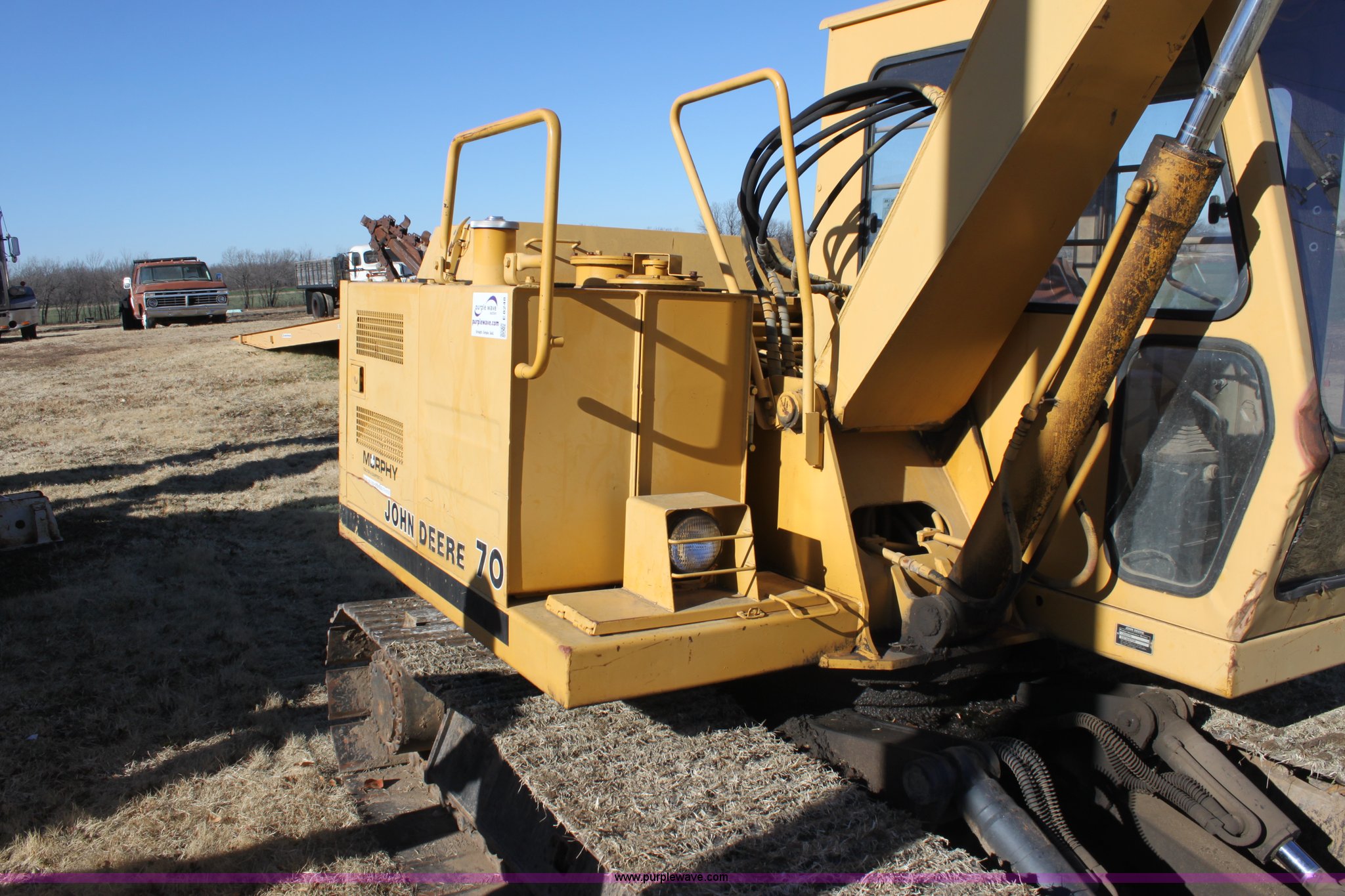 Purple Wave is selling a used Hydraulic Excavator in Kansas. This item is a 1987 John Deere 70 excavator with the following: 7,811 hours on meter, Four cylinder diesel engine, 89" back fill blade, 24" five tooth bucket, Articulating trench boom, One drive motor leaks hydraulic fluid, Back fill blade leaks down, Weak hydraulic pump, Serial CK0070D007038