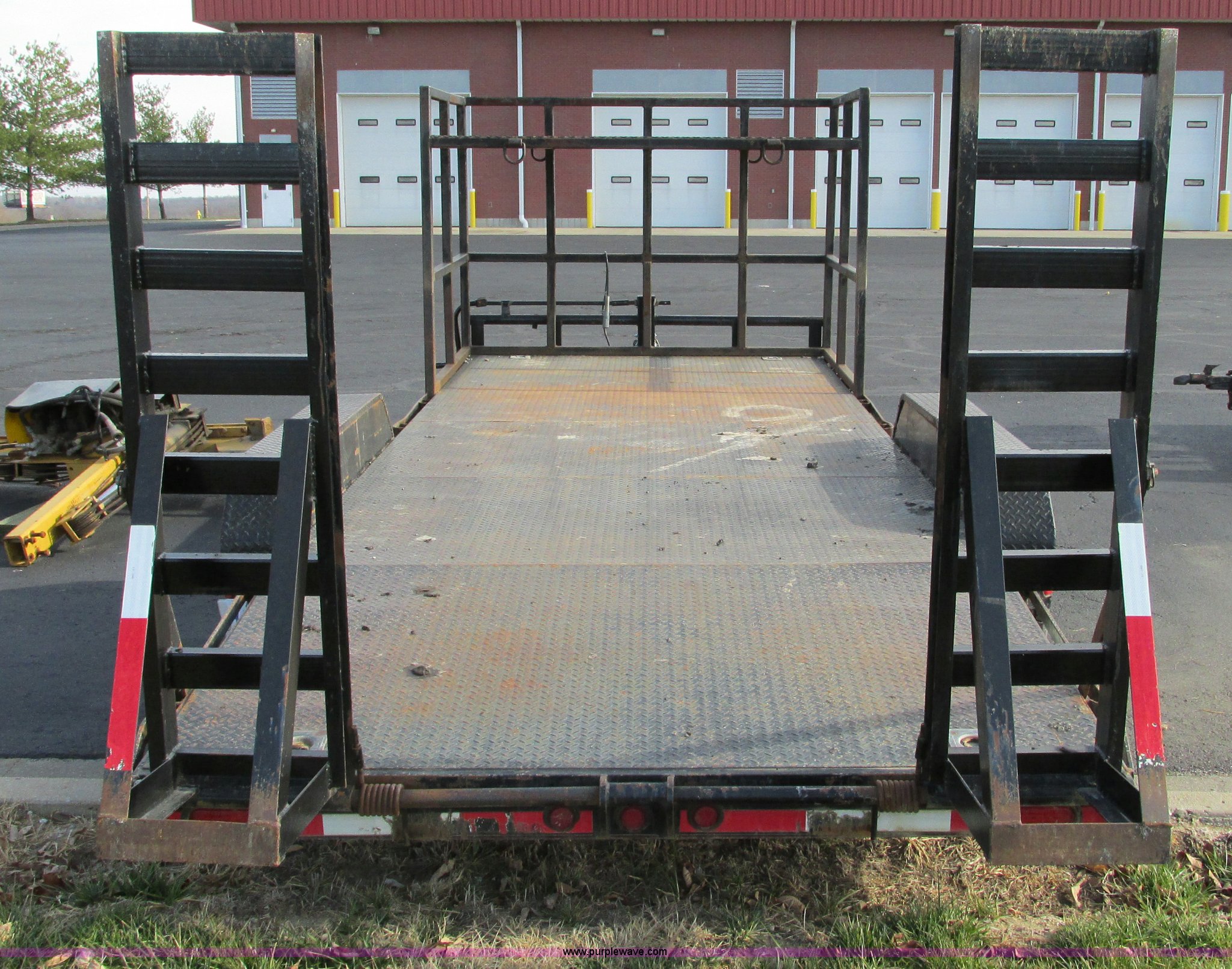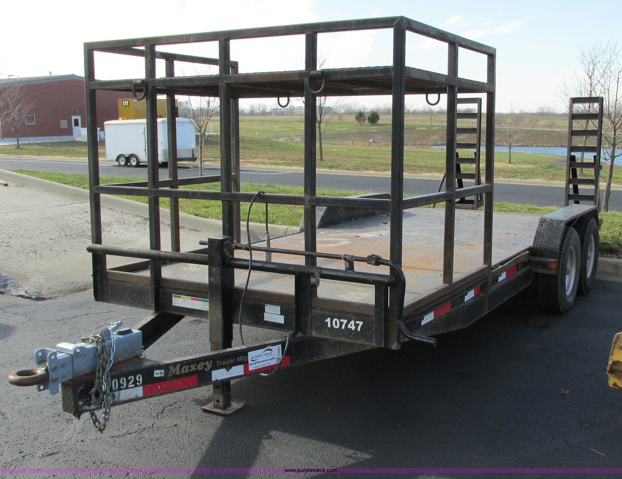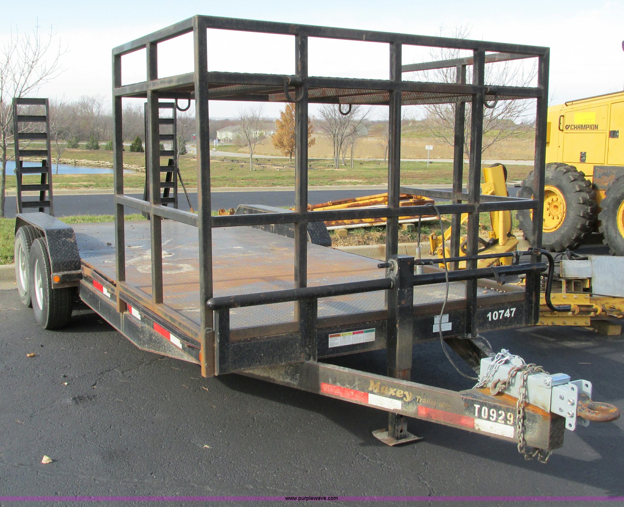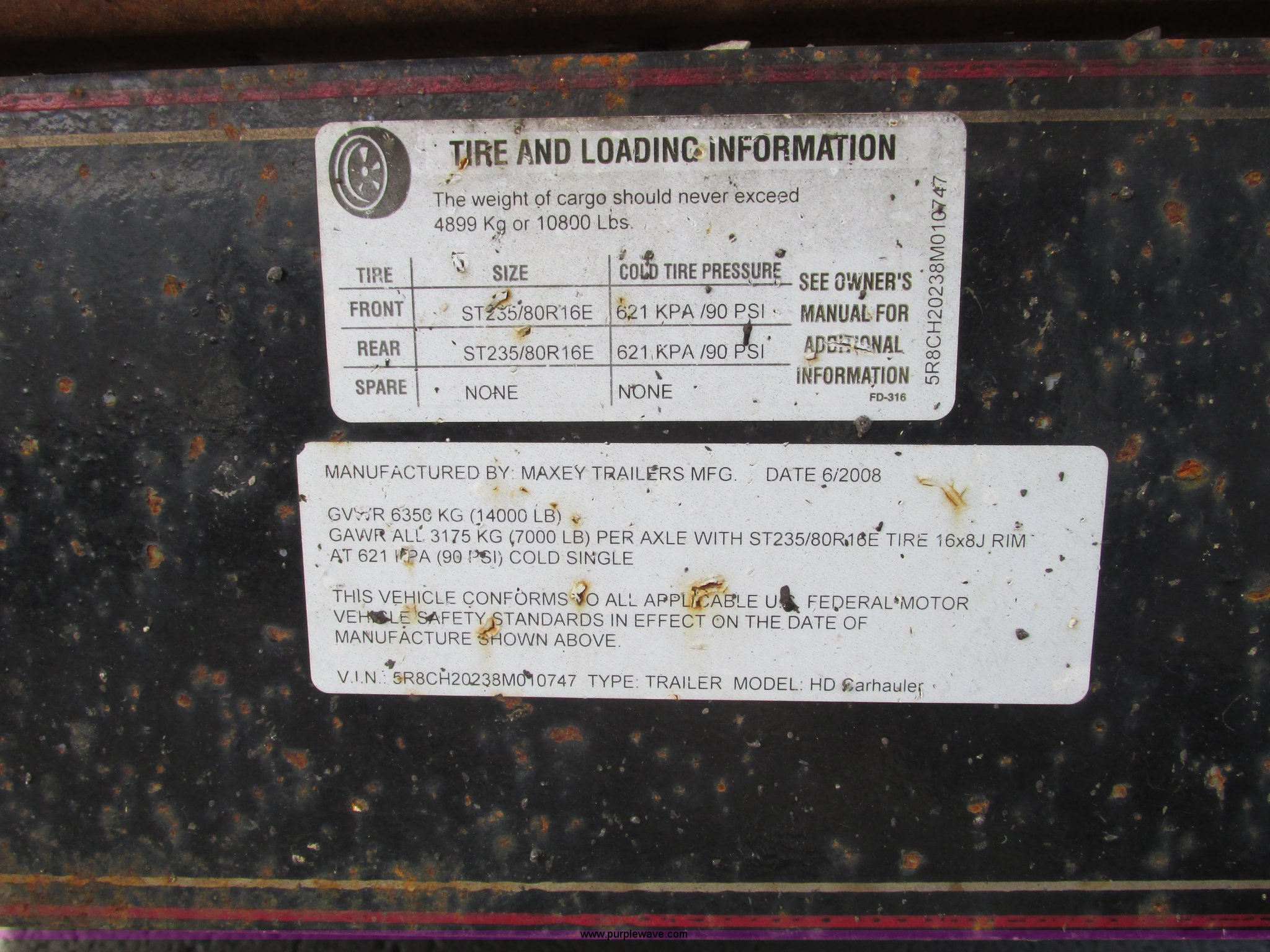 Purple Wave is selling a used Car or Utility Trailer in Missouri. This item is a 2008 Maxey 20' car hauler trailer with the following: 6'11"W, Front overhead storage rack, 5'L x 7'W x 9'H, Pintle hitch, Safety brake chain, 5'L x 16"W ramps, Spring assist hinges, Marker lights on sides, Heavy duty jack, Eight lug axles, 235/80R16 tires, Load Range E, GVWR 17,000 lbs, GAWR 7,000 lbs, MoDOT ID T0929