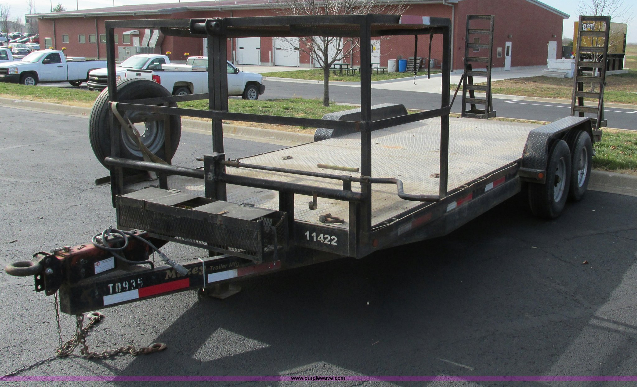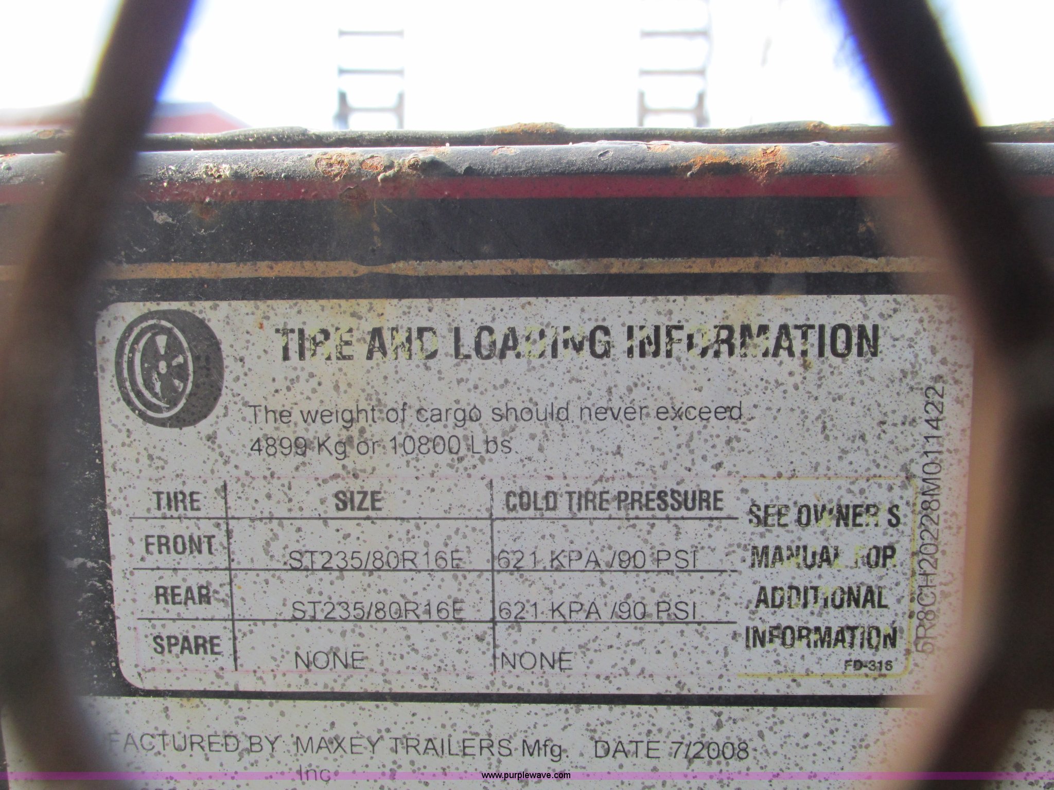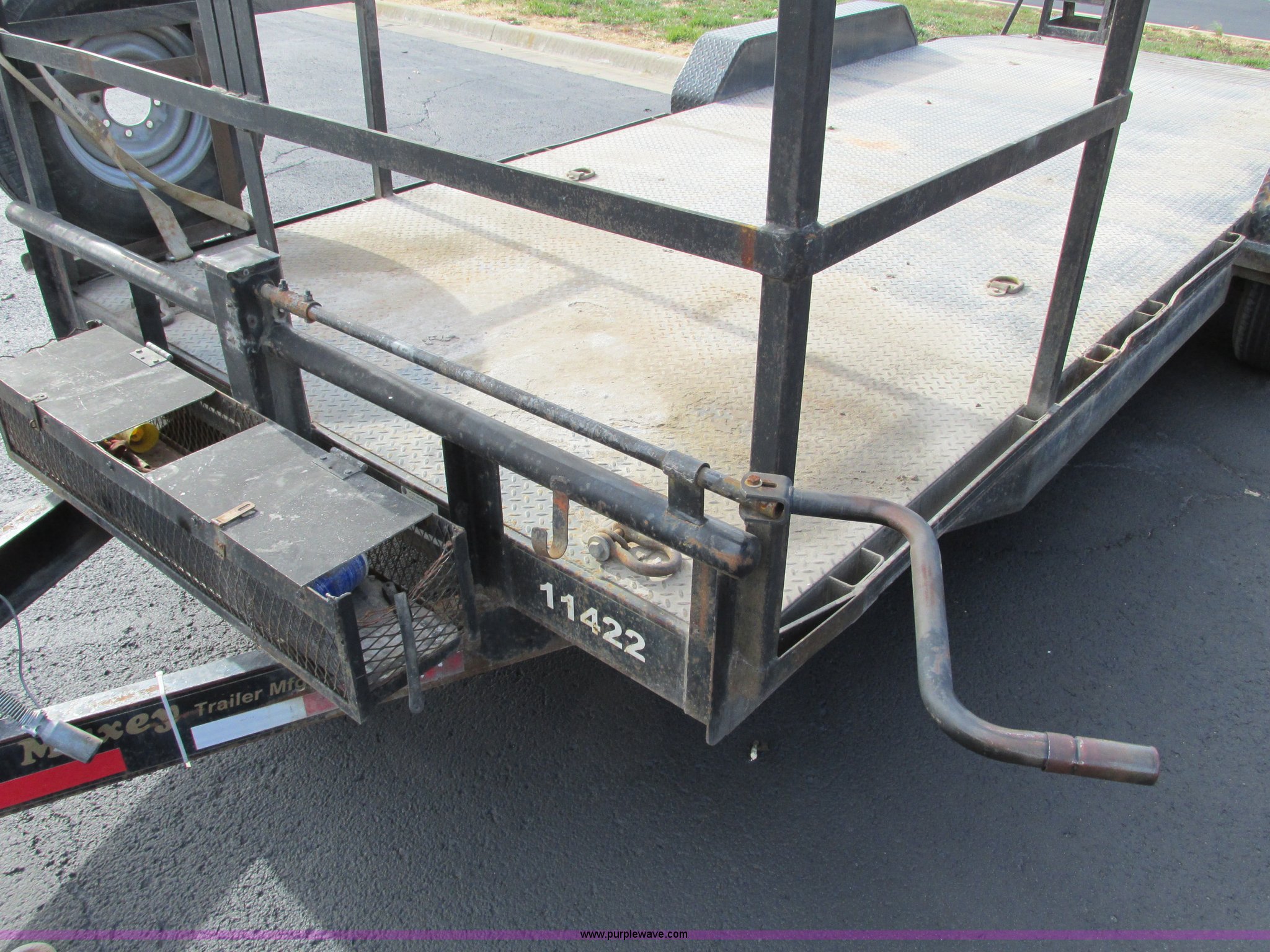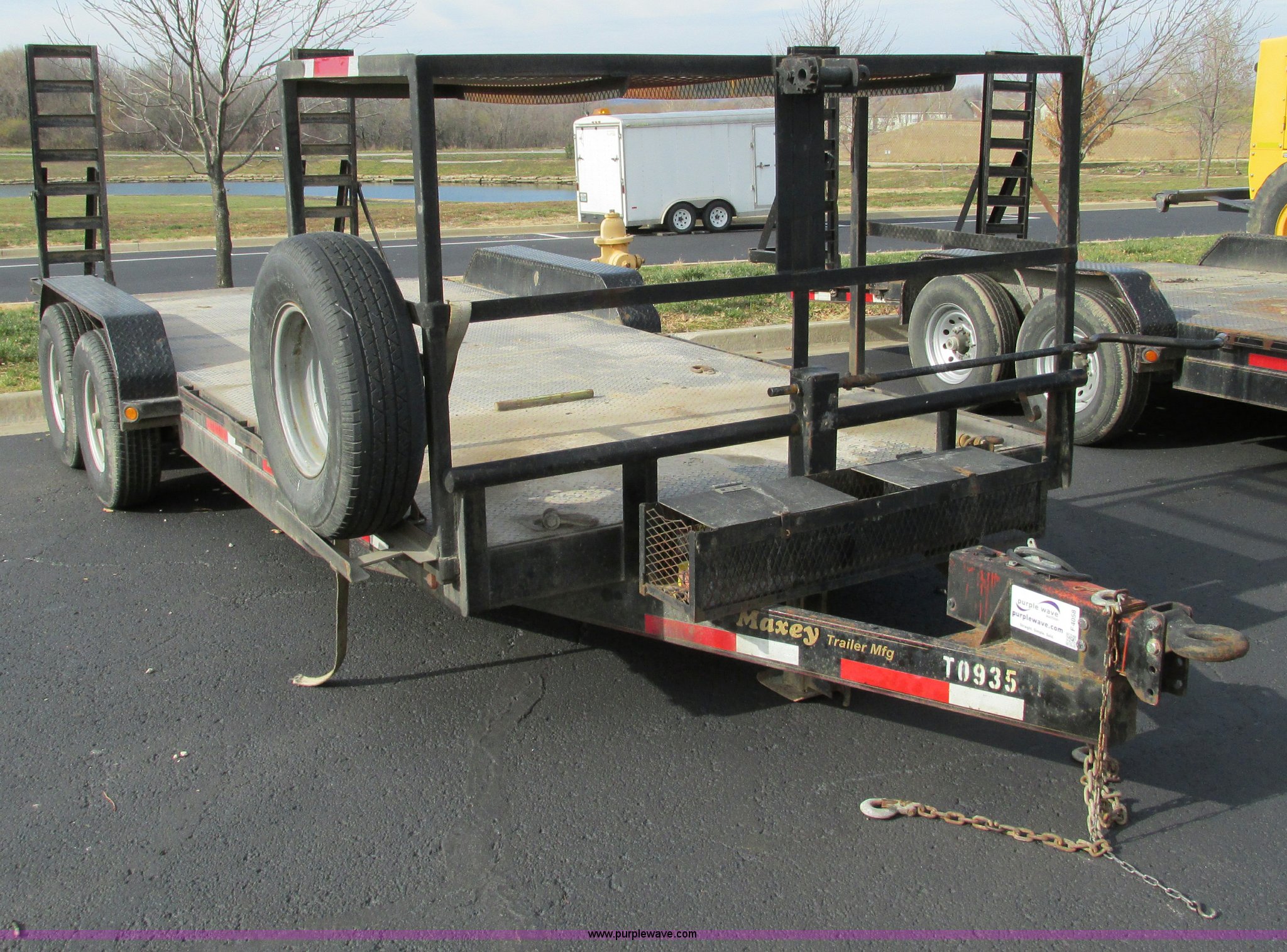 Purple Wave is selling a used Car or Utility Trailer in Missouri. This item is a 2008 Maxey 20' car hauler trailer with the following: 6'11"W, Safety break away system, Front storage box and overhead rack, 7'3"W x 3.5'D x 3'2"H rack, Side marker lights, 5'L x 16"W ramps, Spring assist hinges, Pintle hitch, Heavy duty jack, Eight lug axles, 235/80R16 tires, Load Range E, GVWR 14,000 lbs, GAWR 7,000 lbs, MoDOT ID T0935