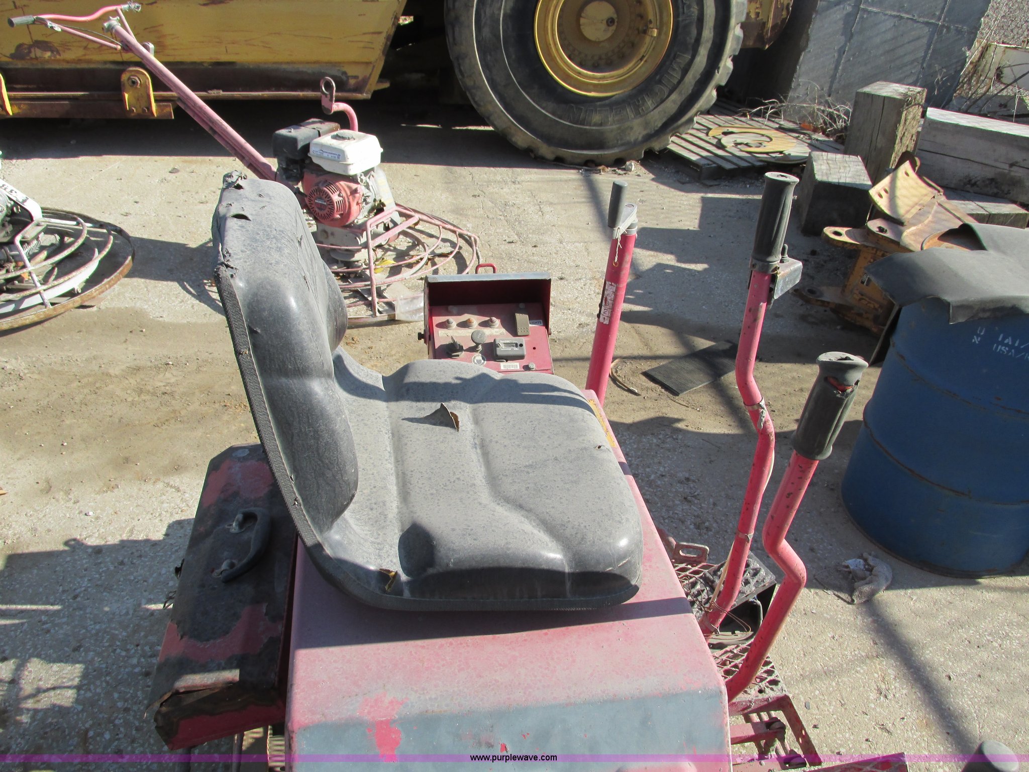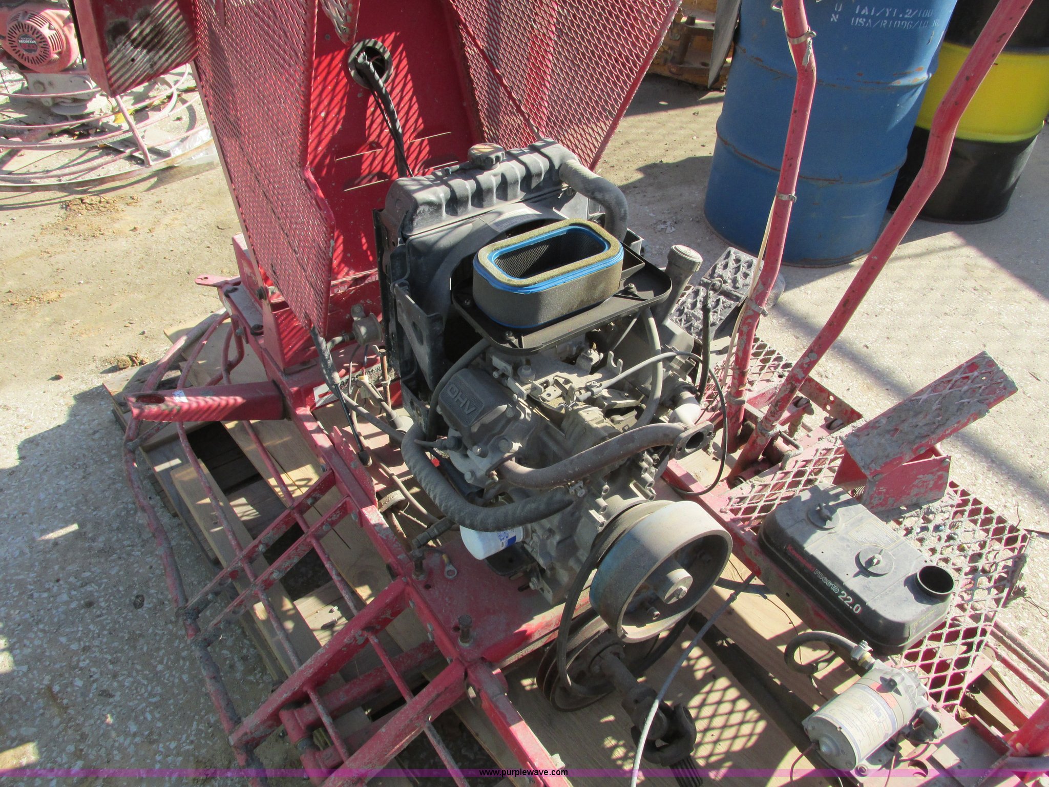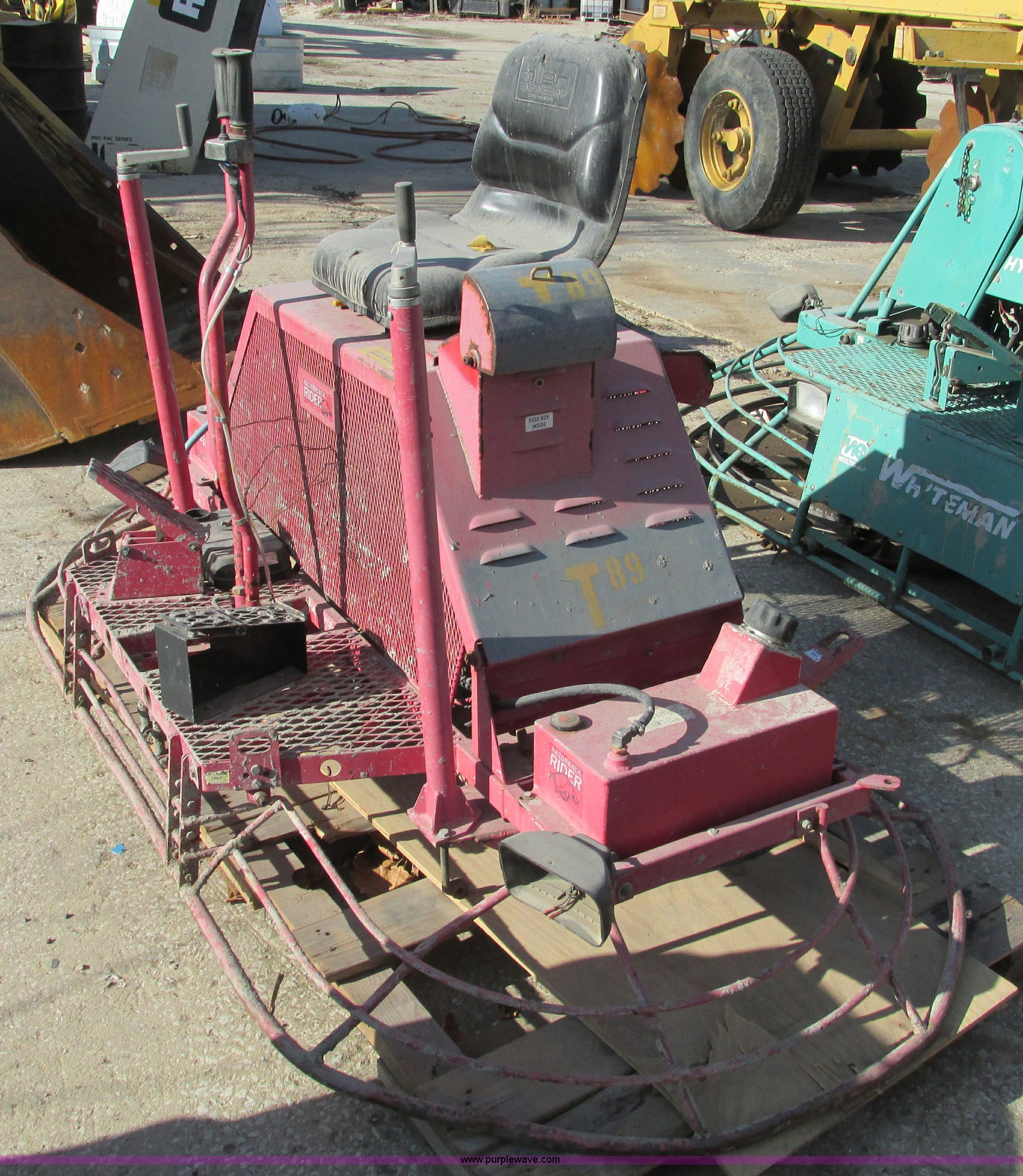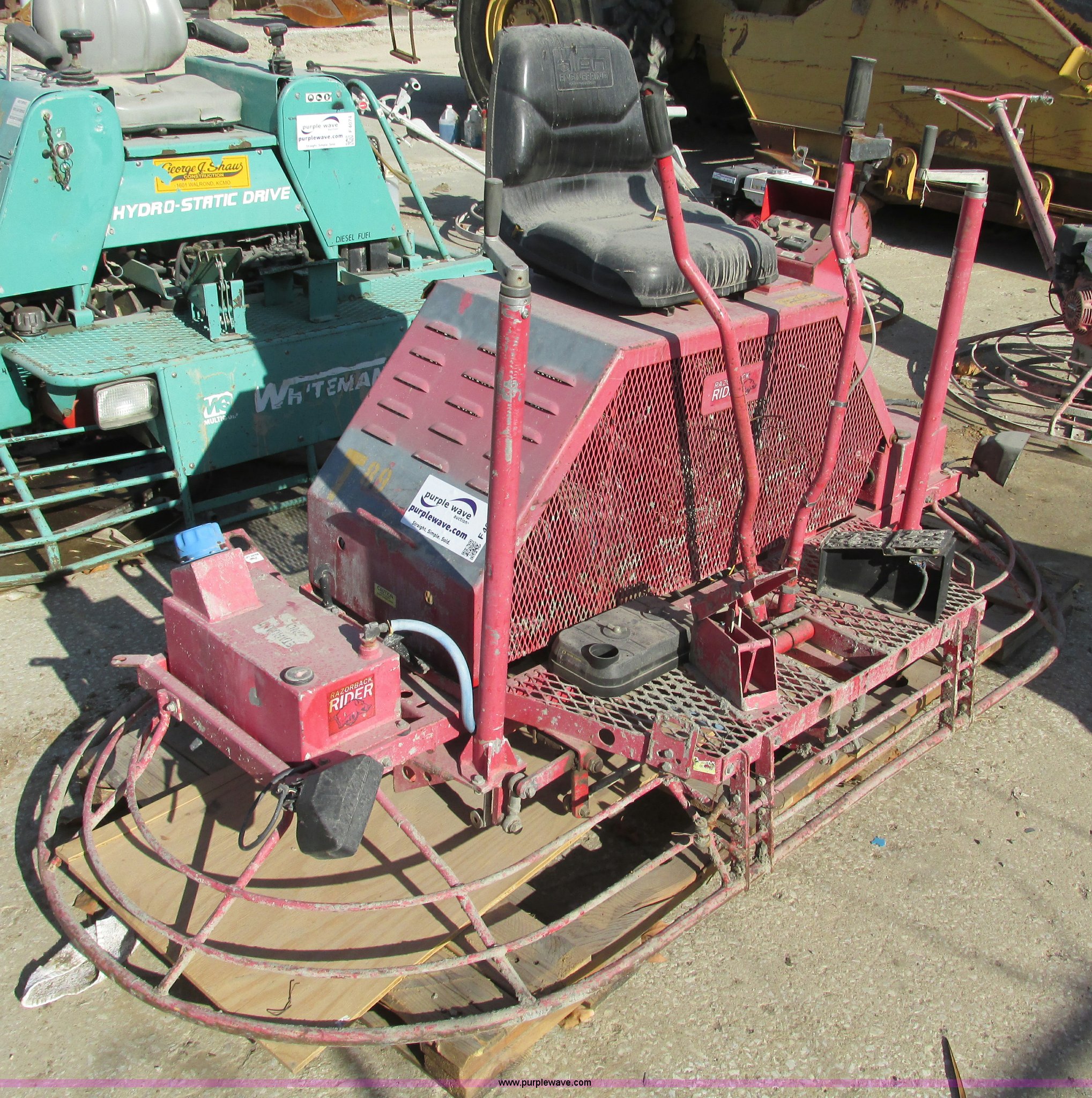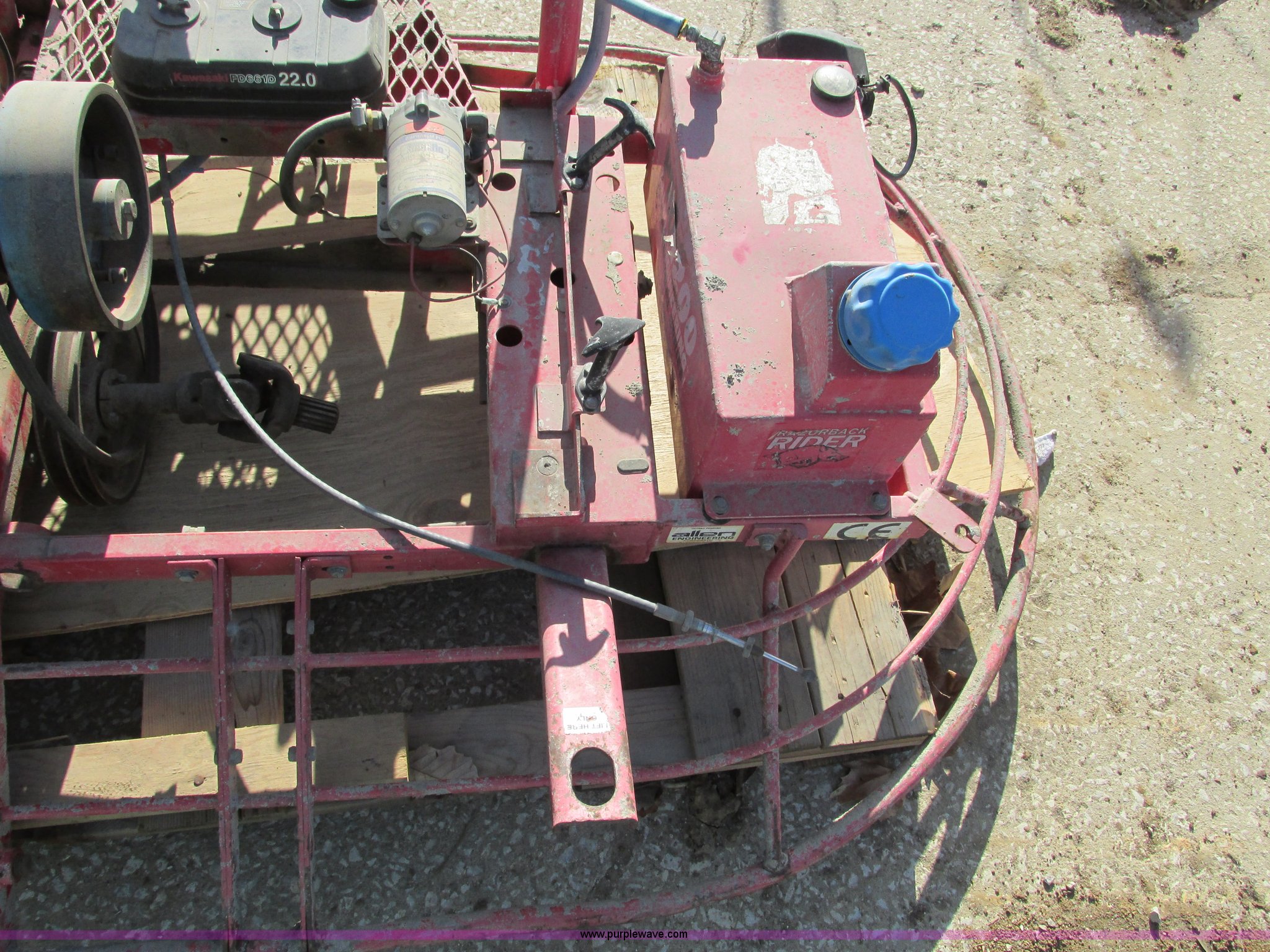 Purple Wave is selling a used Concrete Equip. or Acces. in Missouri. This item is a Allen Razorback PRO1200 ride-on power trowel with the following: Kawasaki FD661D V-twin engine, Model 1200-NF-5FC, 22 HP, Work lights, Non-operational, parts machine, Missing parts, Unit# T-89