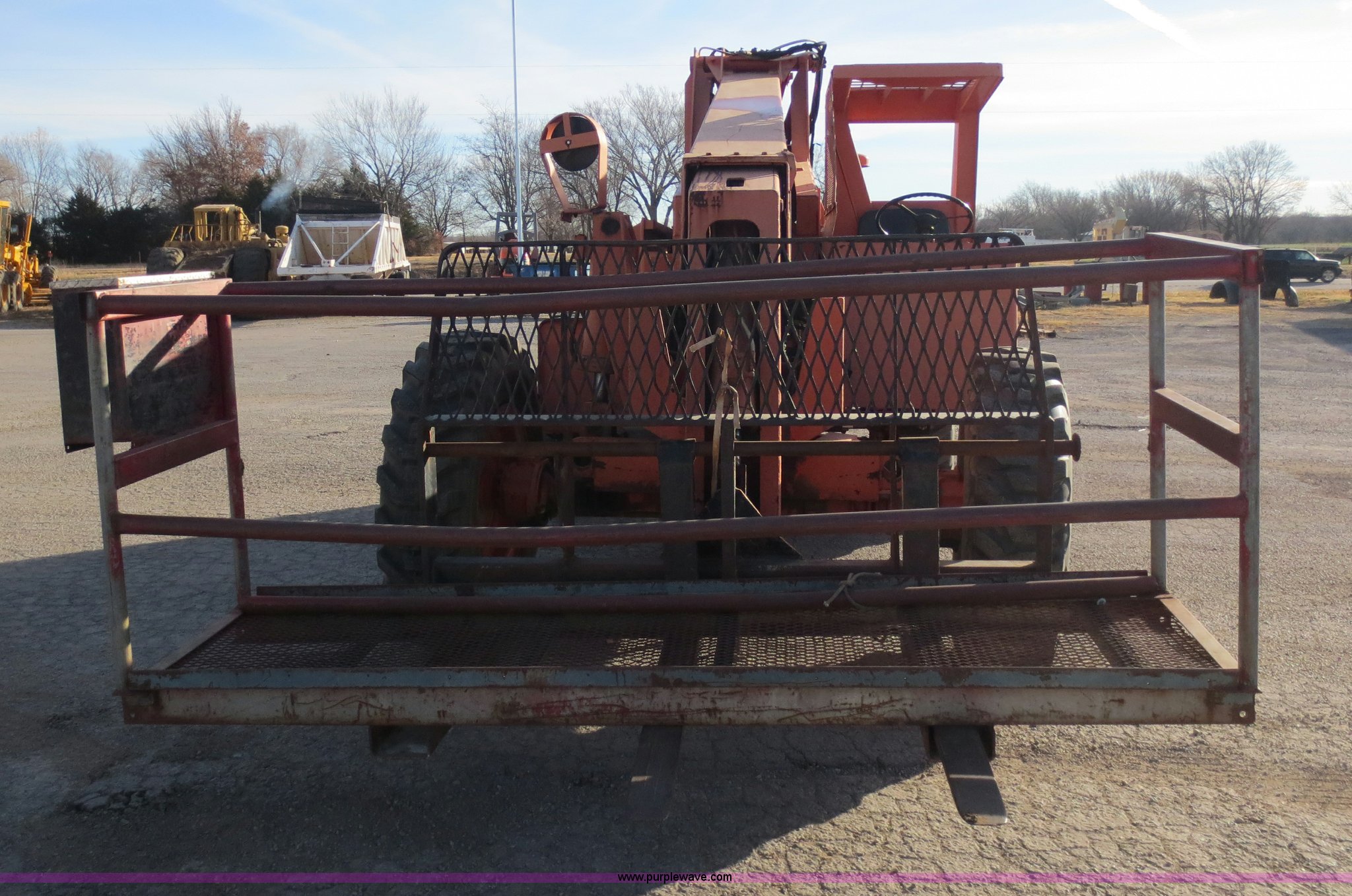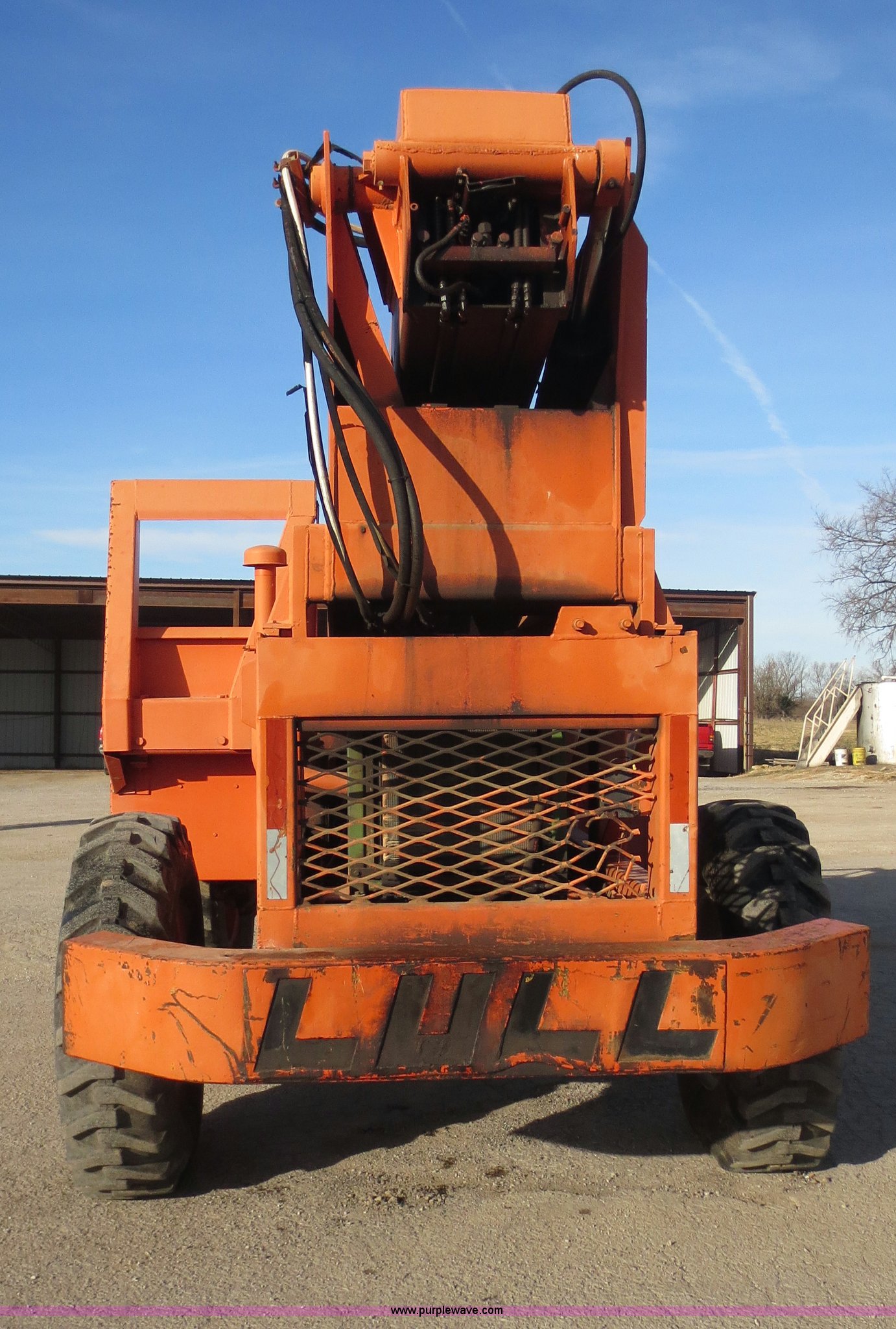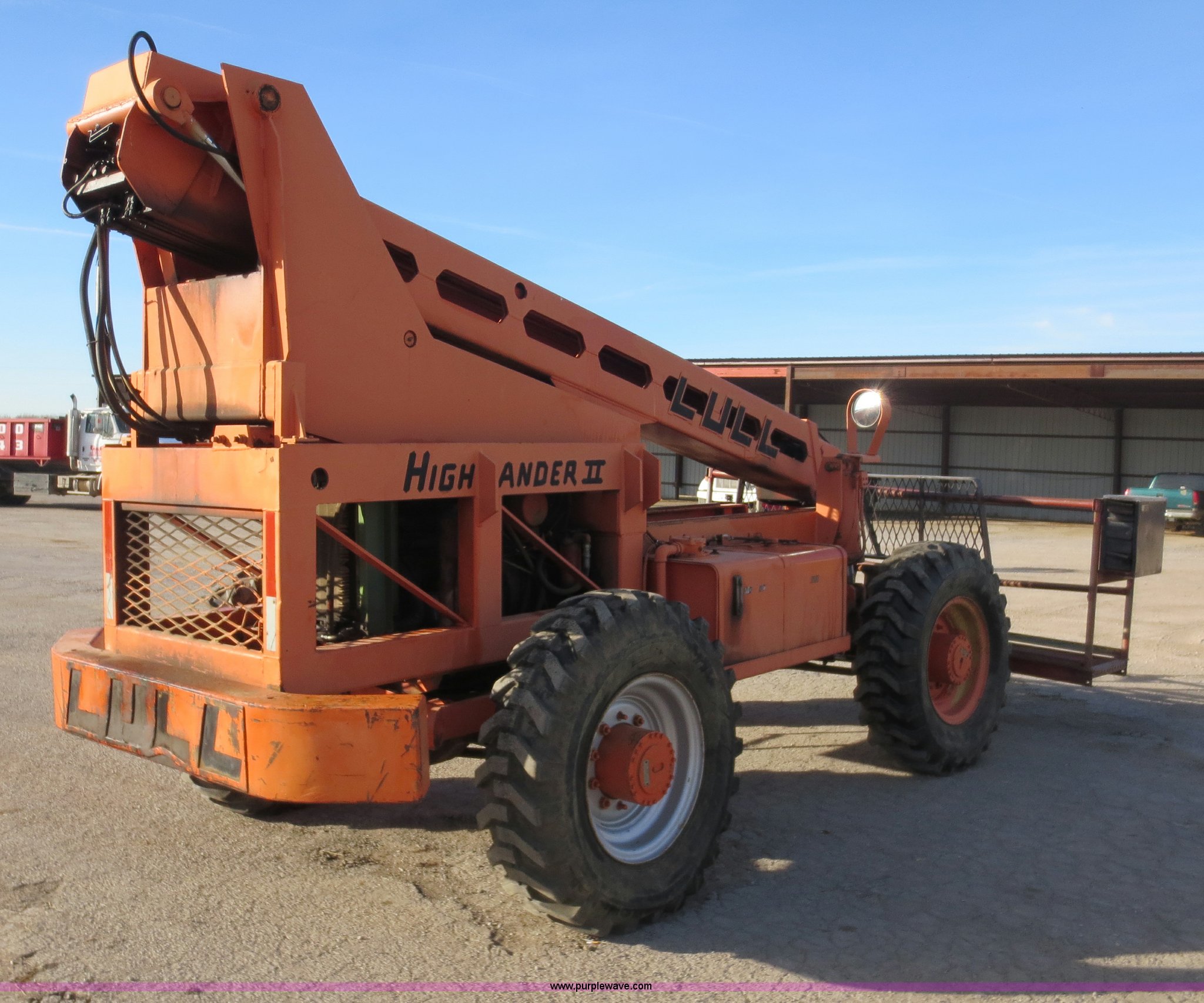 Purple Wave is selling a used Telehandler in Kansas. This item is a 1984 Lull Highlander II 644TT-34 telehandler with the following: 5,649 hours on meter, John Deere 4239 four cylinder diesel engine, Hydrostatic transmission, 3F-3R gears, Crab and circle steer, Four wheel drive, ROPS, 6,000 lb lift capacity, 44' max reach, 48"L forks, Hydraulic leveling, Transverse slide, 9' man lift, 13.00-24 tires, Water pump leak, Oil leaks, Serial JD1322LN