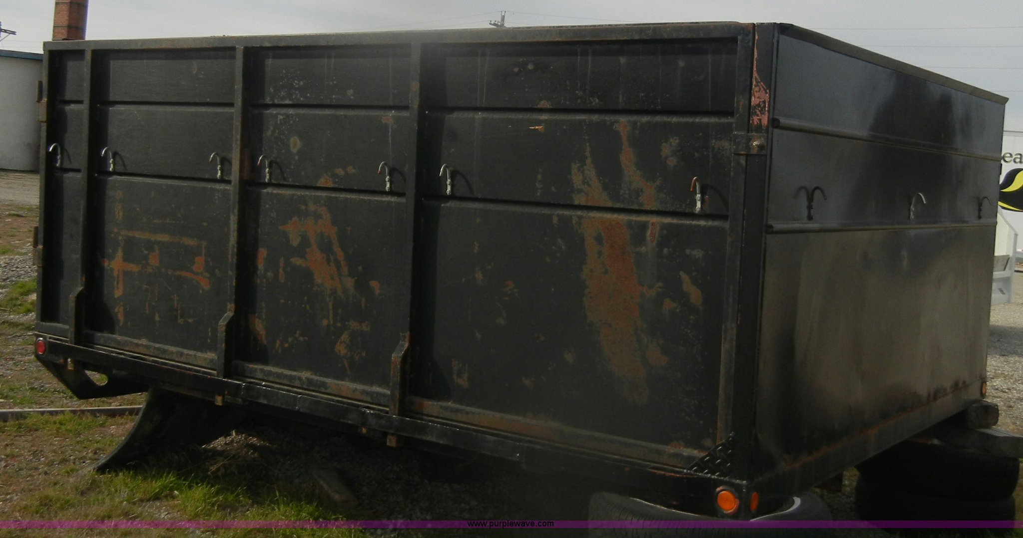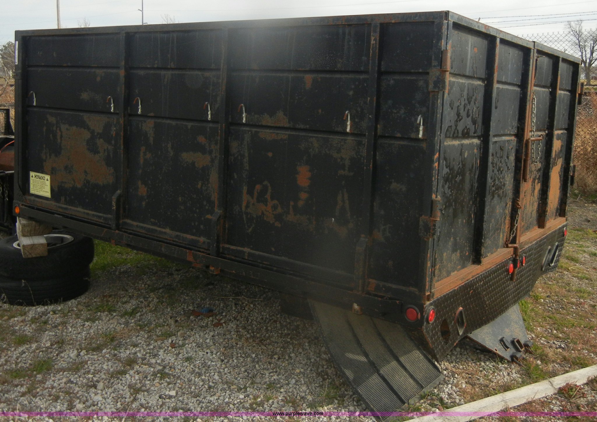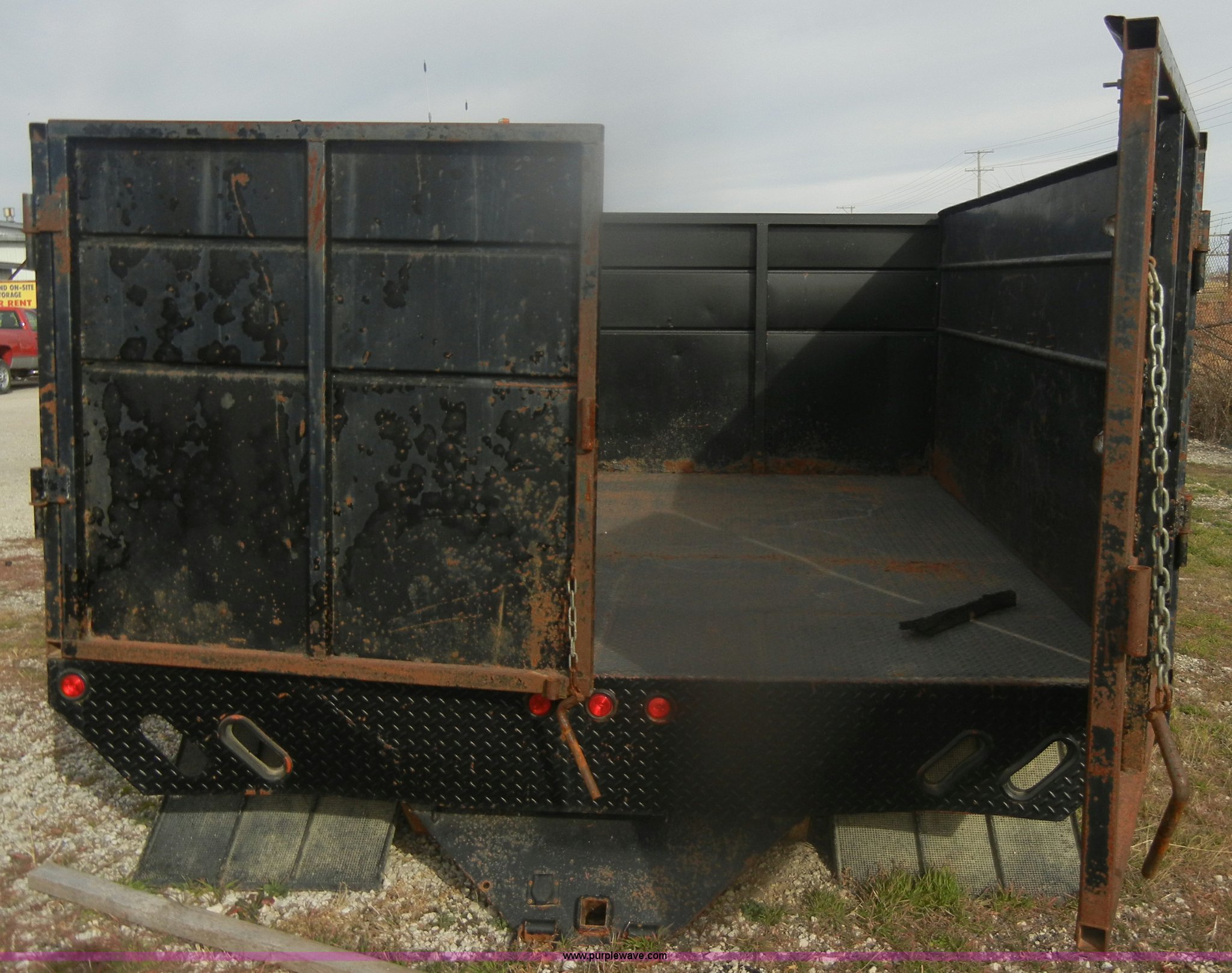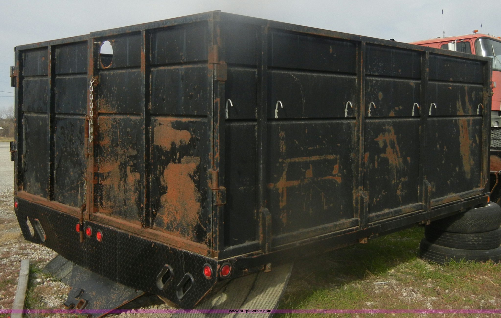 Purple Wave is selling a used Automotive Parts or Acces. in Kansas. This item is a Shop built 10' dump bed with the following: 8'W, 4'H side boards, Monarch power unit, Model M-319-0352, Remote, Colt hoist, Steel flooring, Dual swing doors, Stake pockets for rails, Receiver hitch, Trailer wiring, Angled slots for taillights