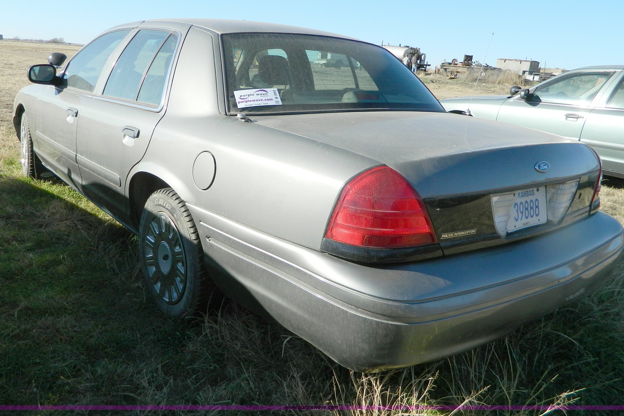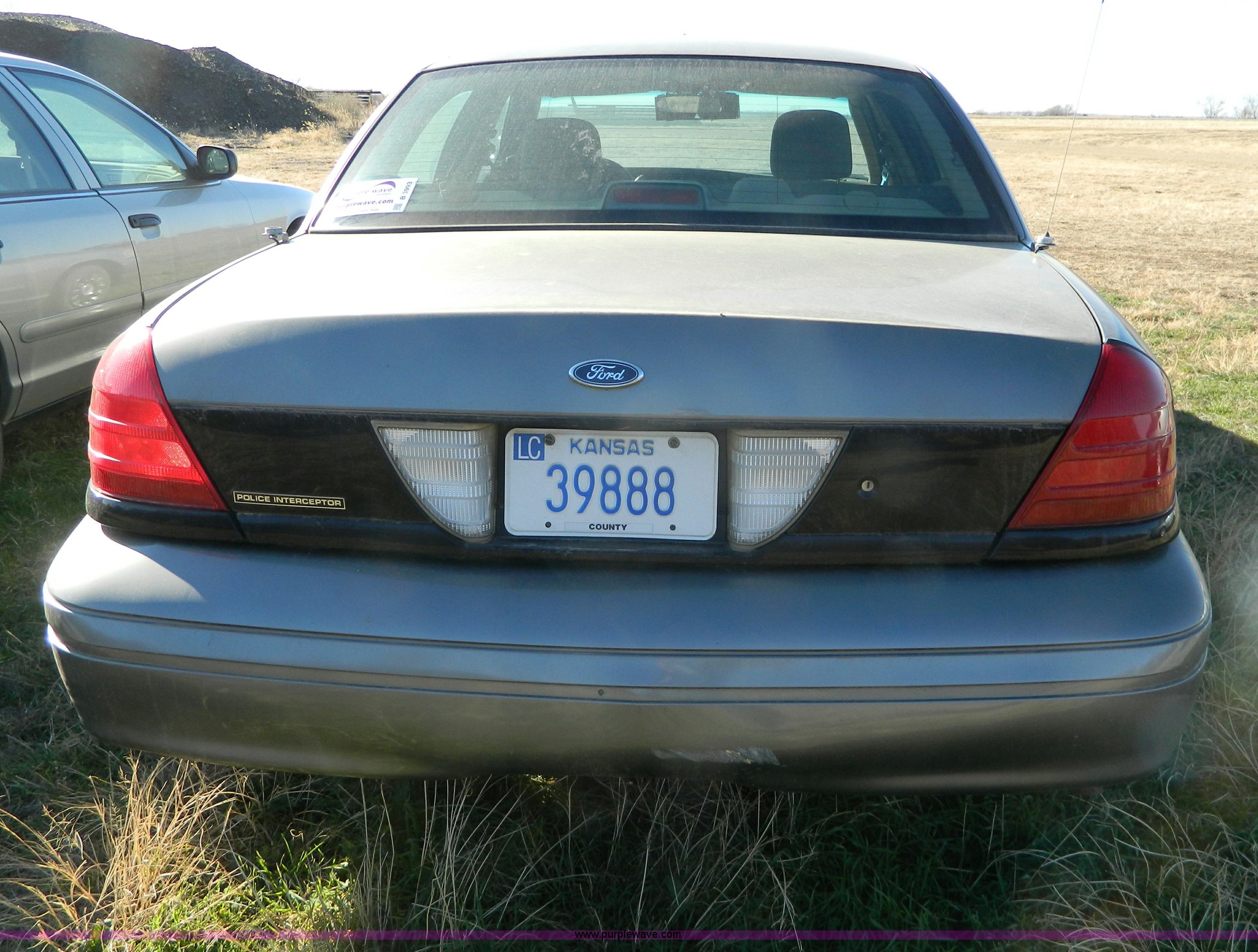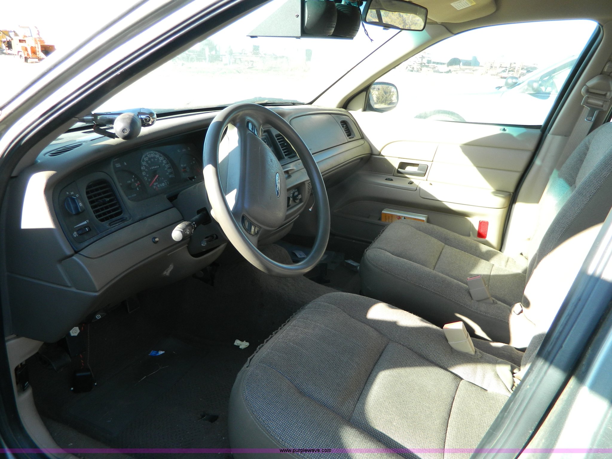 Purple Wave is selling a used Passenger Vehicle in Kansas. This item is a 2003 Ford Crown Victoria Police Interceptor with the following: 139,438 miles on odometer, 4.6L V8 EFI gas engine, Automatic transmission, AC and heat, Tilt, Cruise, AM/FM, Power windows, locks, mirrors, and seats, Cloth interior, P225/60R16 tires, Interior/exterior cosmetic damage, Door panel missing control on driver's side, Roof plugs, Front emergency lights may be removed