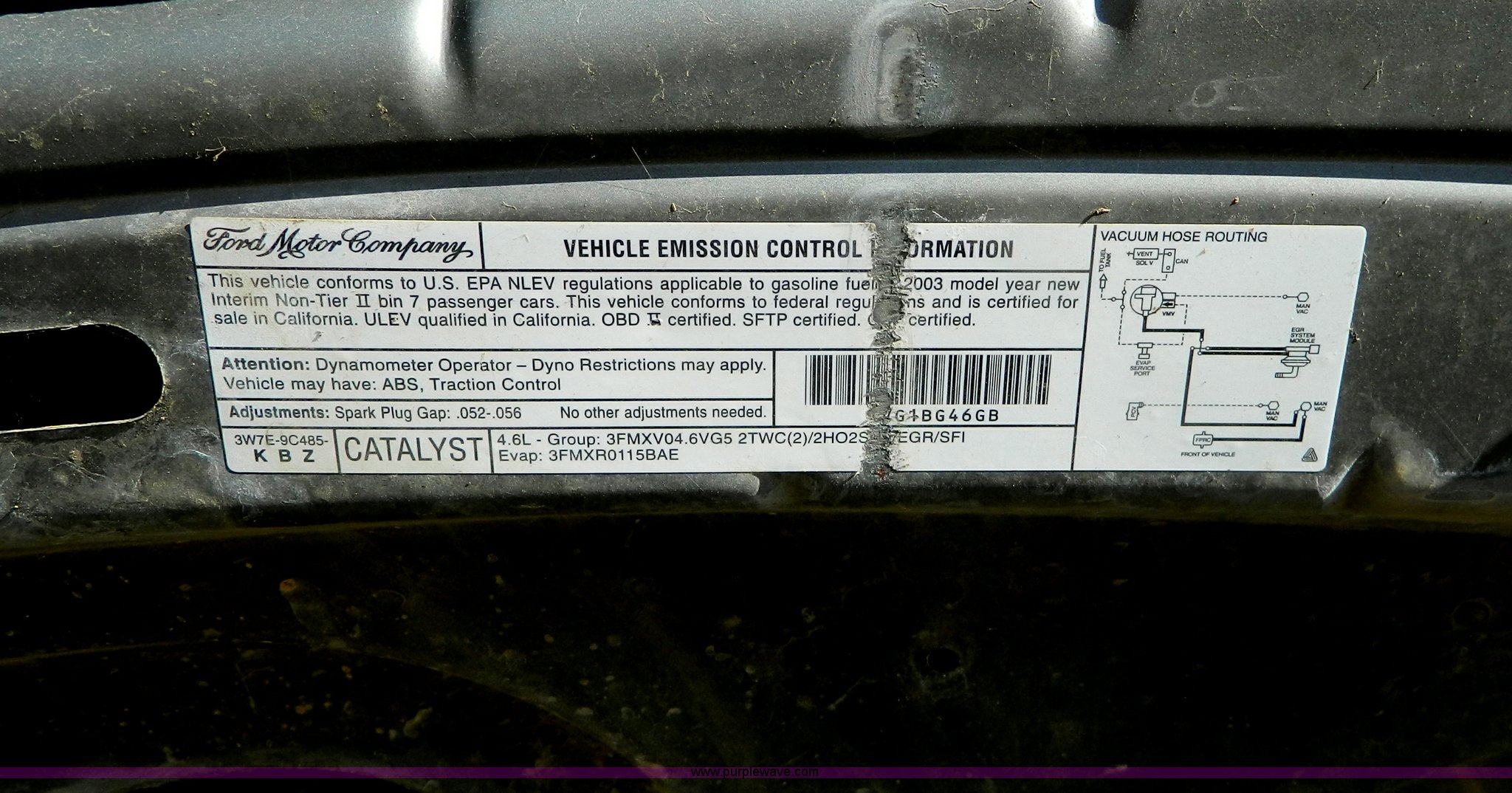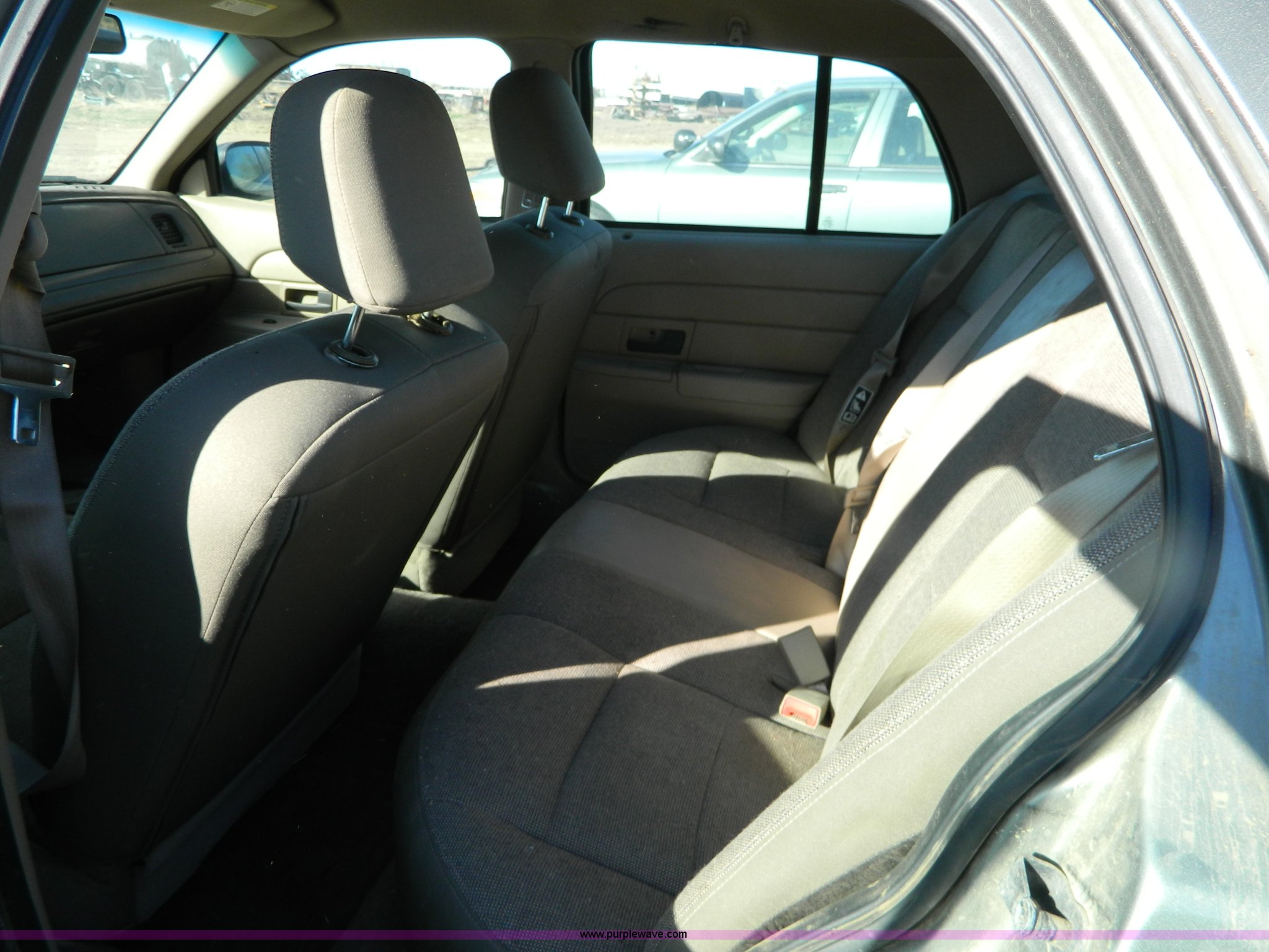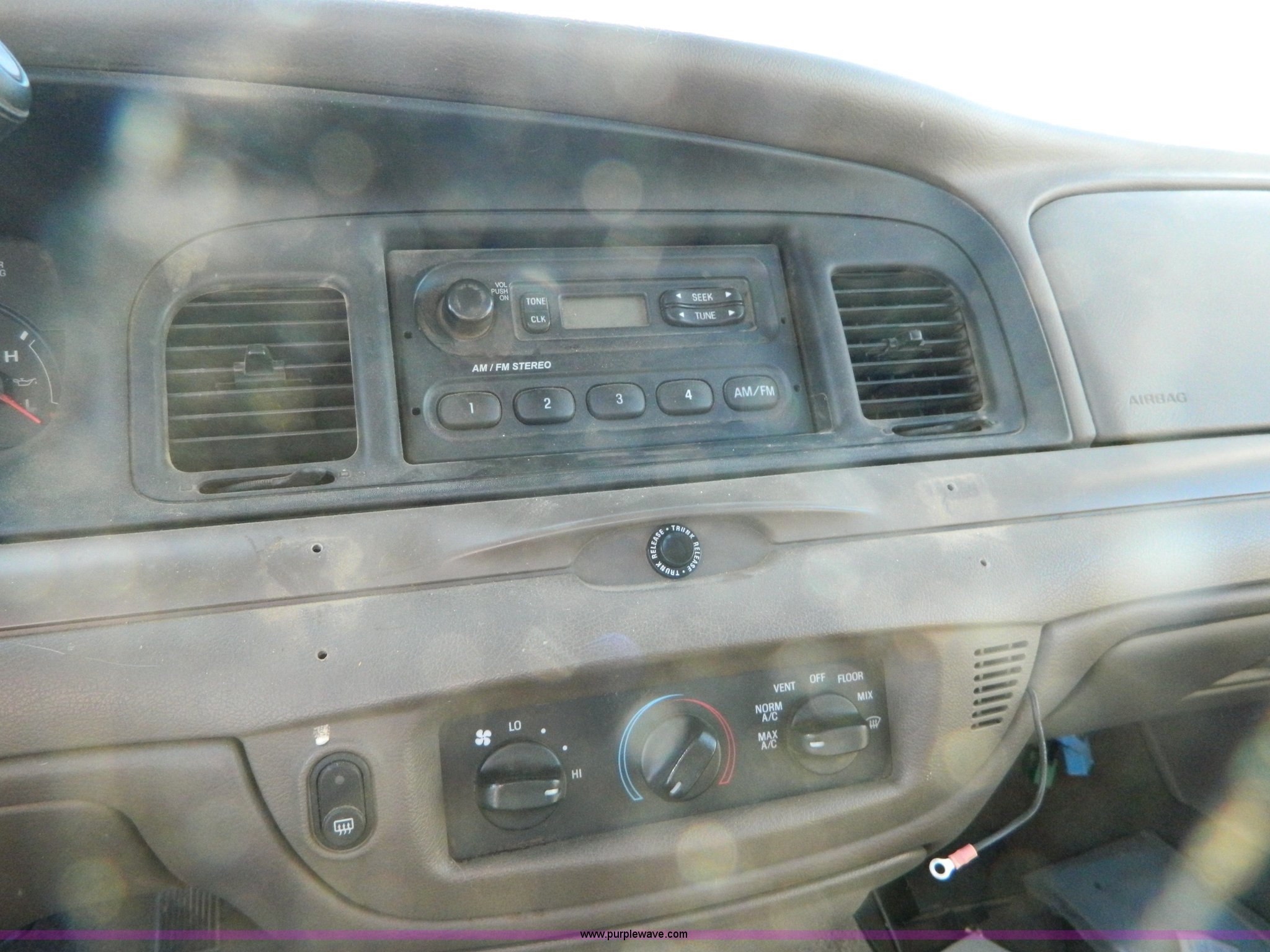 Purple Wave is selling a used Passenger Vehicle in Kansas. This item is a 2003 Ford Crown Victoria Police Interceptor with the following: 139,438 miles on odometer, 4.6L V8 EFI gas engine, Automatic transmission, AC and heat, Tilt, Cruise, AM/FM, Power windows, locks, mirrors, and seats, Cloth interior, P225/60R16 tires, Interior/exterior cosmetic damage, Door panel missing control on driver's side, Roof plugs, Front emergency lights may be removed
