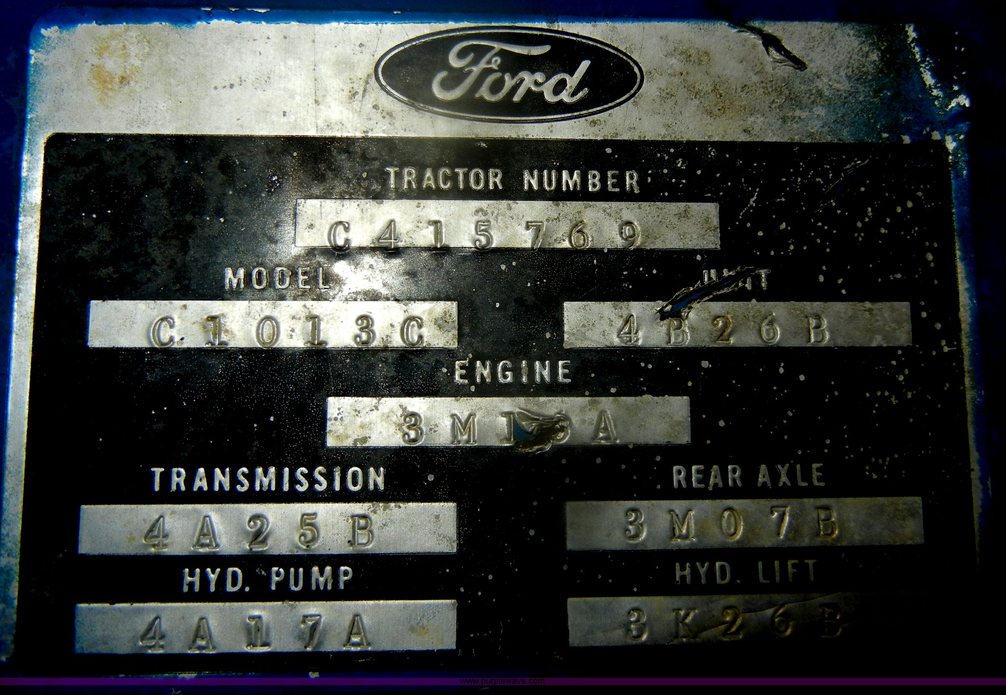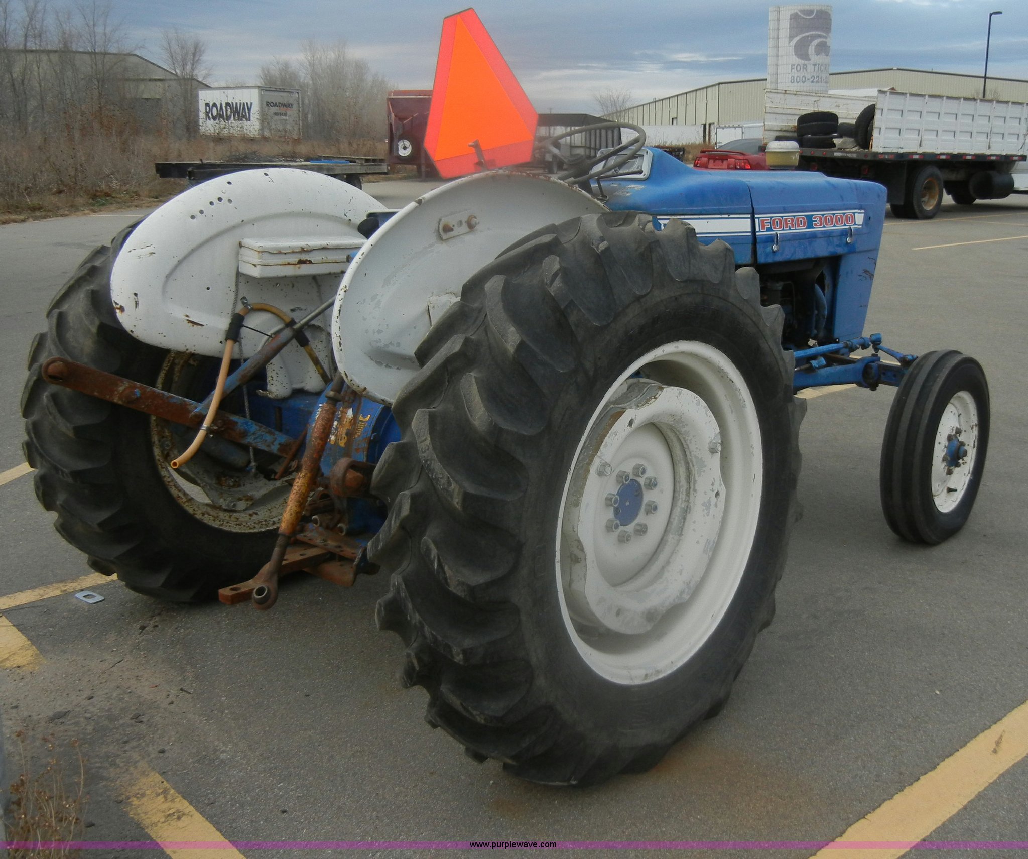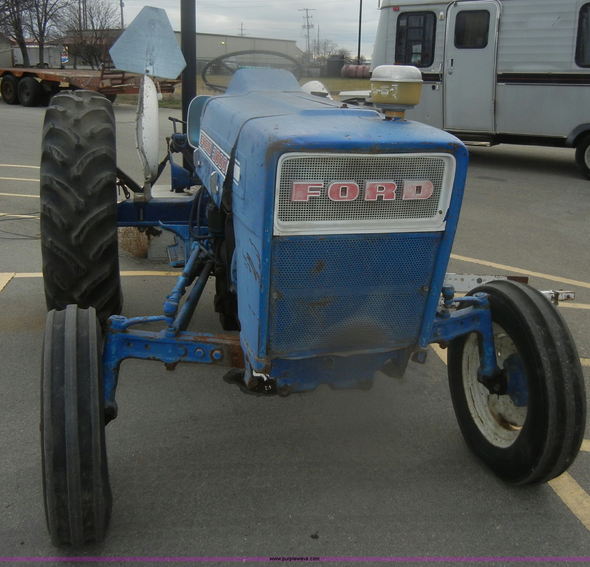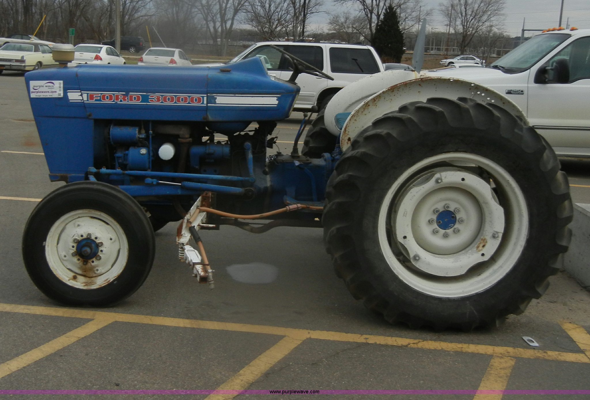 Purple Wave is selling a used Tractor in Kansas. This item is a 1974 Ford 3000 tractor with the following: 3,916 hours on meter, Model C1013C, Manual transmission, 8F-2R gears, Three point, Draw bar, 540 PTO, Side arm for sprayer, 6.00-16 front tires, 13.6-28 rear tires, Wheel weights, Dead battery, Steering column leaking fluid, Power steering adapter to gear box is broken, Paint faded and scratched, Serial C415769