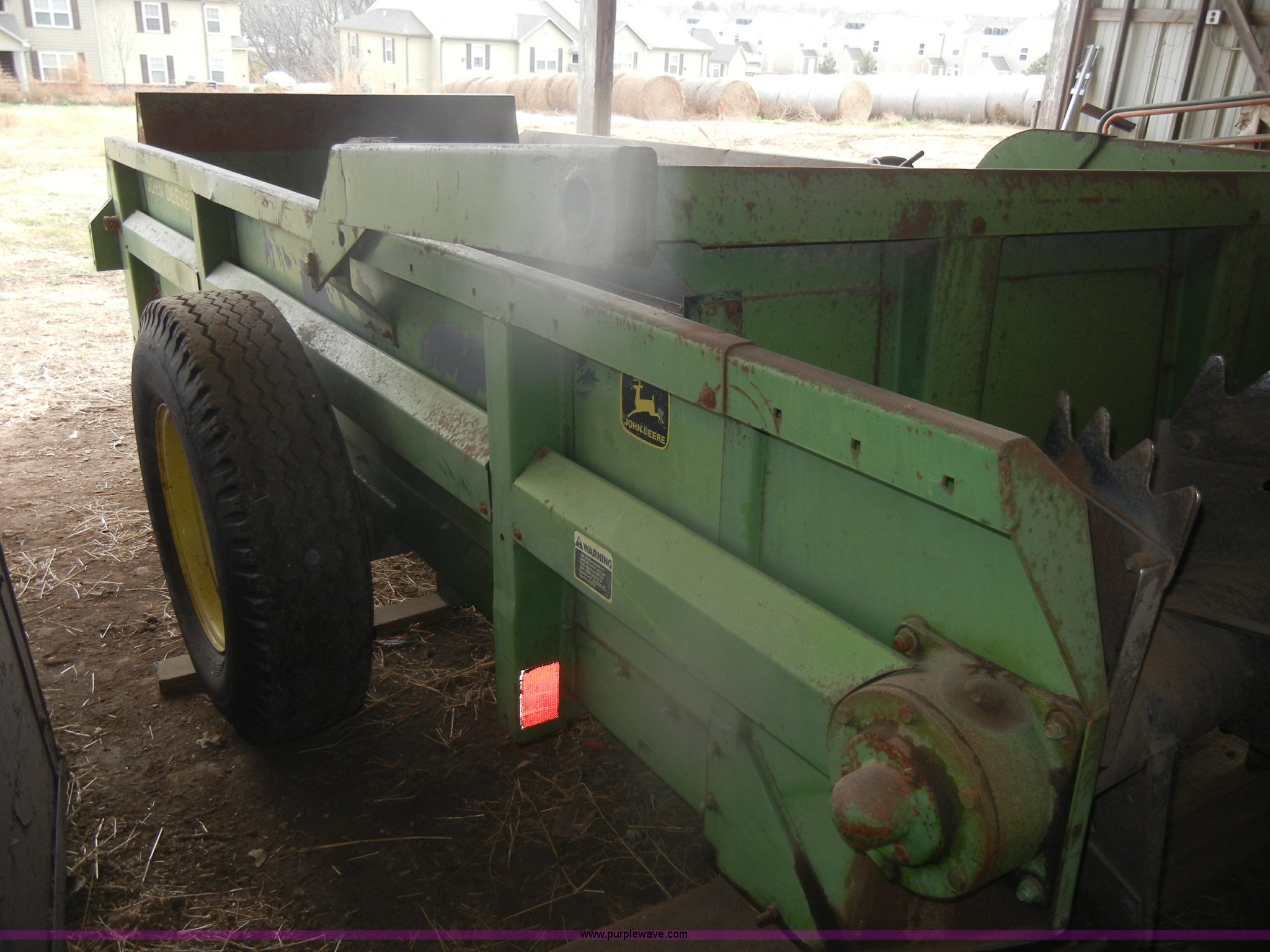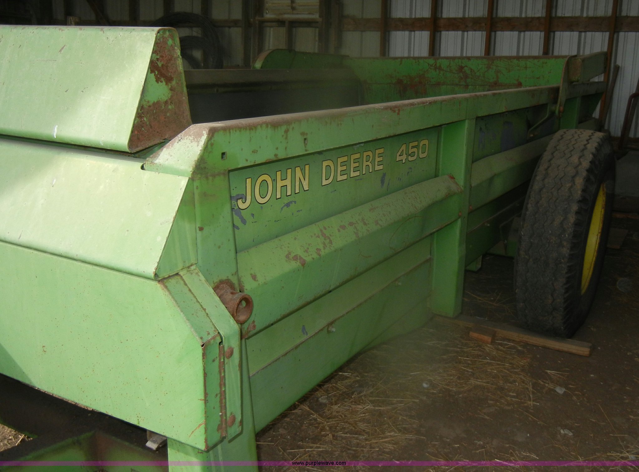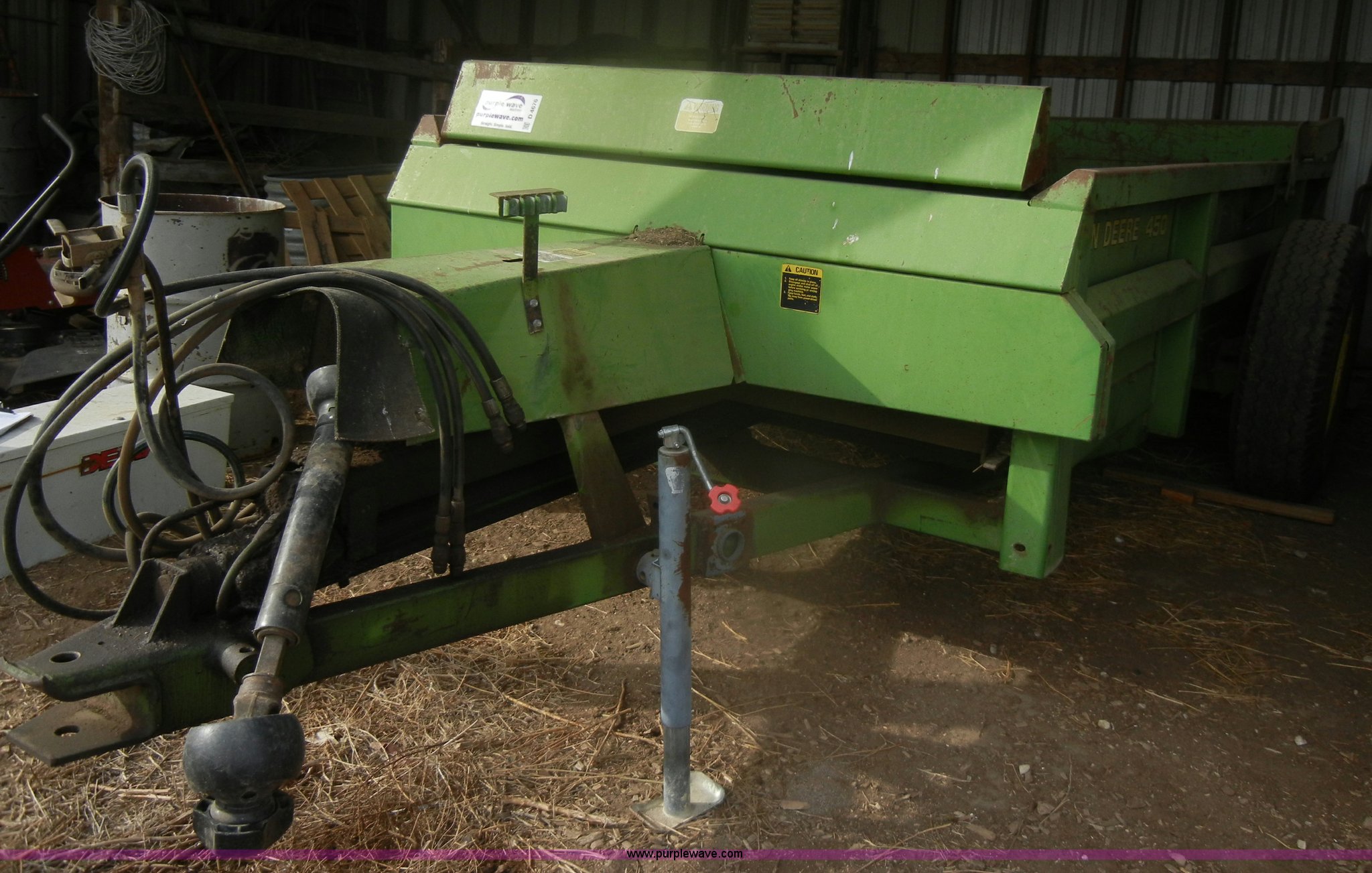 Purple Wave is selling a used Manure Spreader in Kansas. This item is a John Deere 450 Hydra-Push manure spreader with the following: 540 PTO, Hydraulic hookups, 14'L x 6'W, Pin hitch, 9.00R20 tires