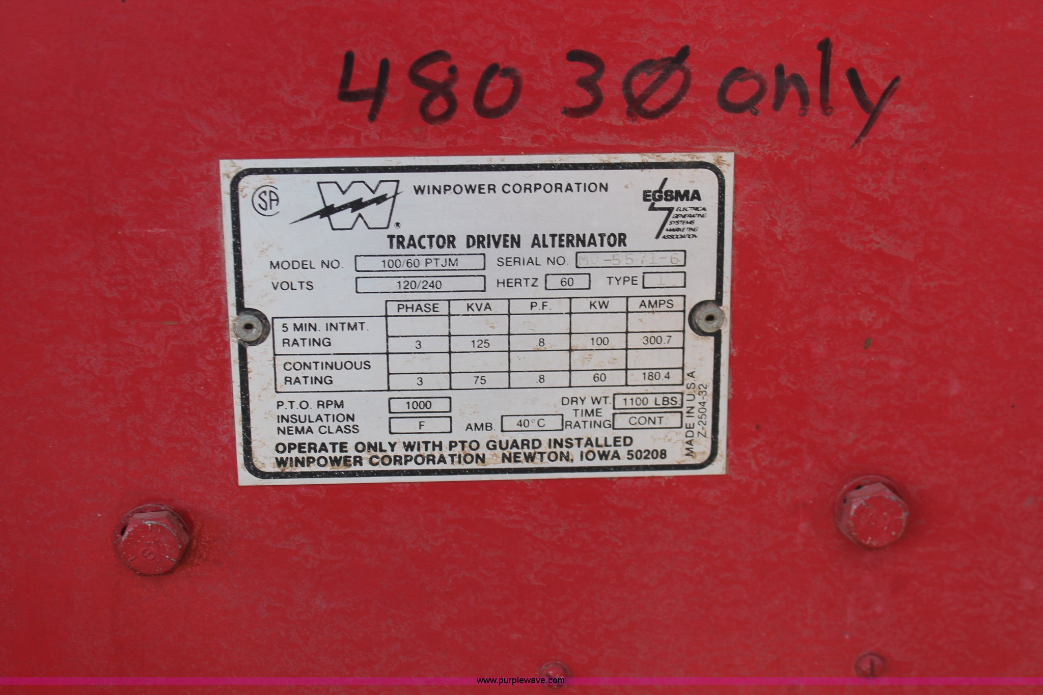 Purple Wave is selling a used Generator Set in Kansas. This item is a Winpower 100/60 PTJM generator with the following: 469 hours on meter, Ford 391 CID V8 gas engine, 60 kW, 480 volts, Three phase, 40 gallon fuel tank, Pin hitch, Assorted tires, Maintenance records available, Serial M0-5571-6