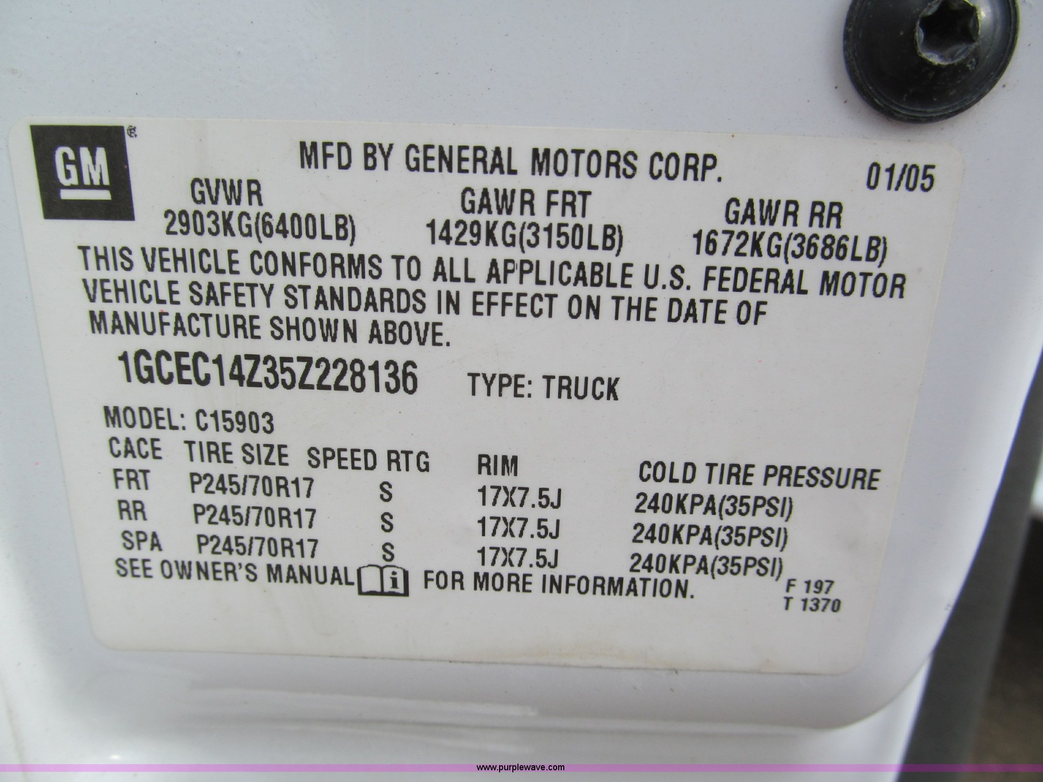 2005 Chevrolet Silverado 1500 pickup truck. 199,400 actual miles, 5.3L V8 SFI gas engine, Automatic transmission, AC and heat, Tilt, AM/FM, Manual windows and locks, Cloth interior, Rubber floor, Spray-in bed liner, Amber beacon light, Receiver hitch, Trailer wiring, 245/70R17 tires, CB radio will be removed, Unit# B-5831. 1GCEC14Z35Z228136. Shipping quotes available. Missouri Department of Transportation (MODOT). 600 North East. Lee's Summit, MO 64086