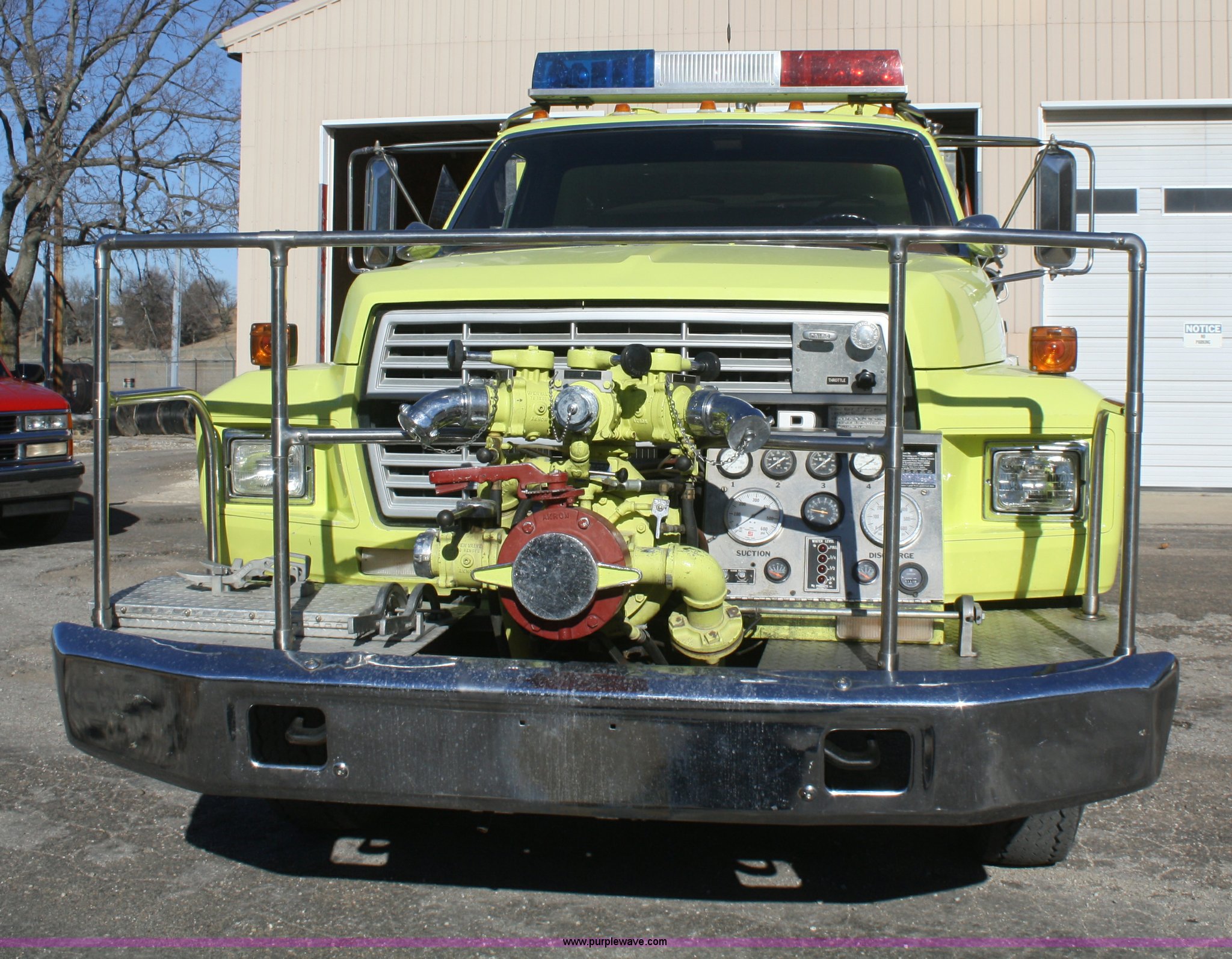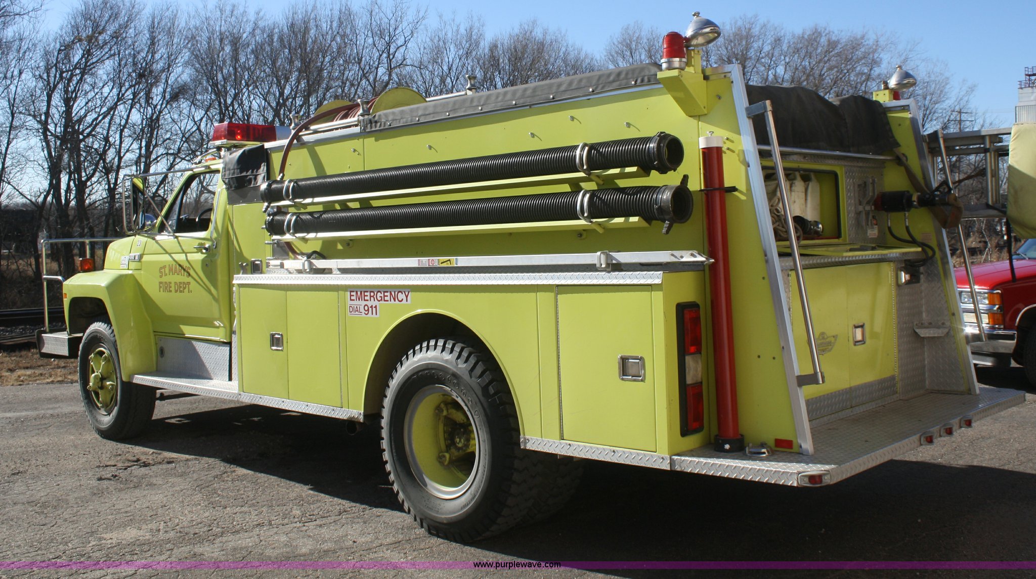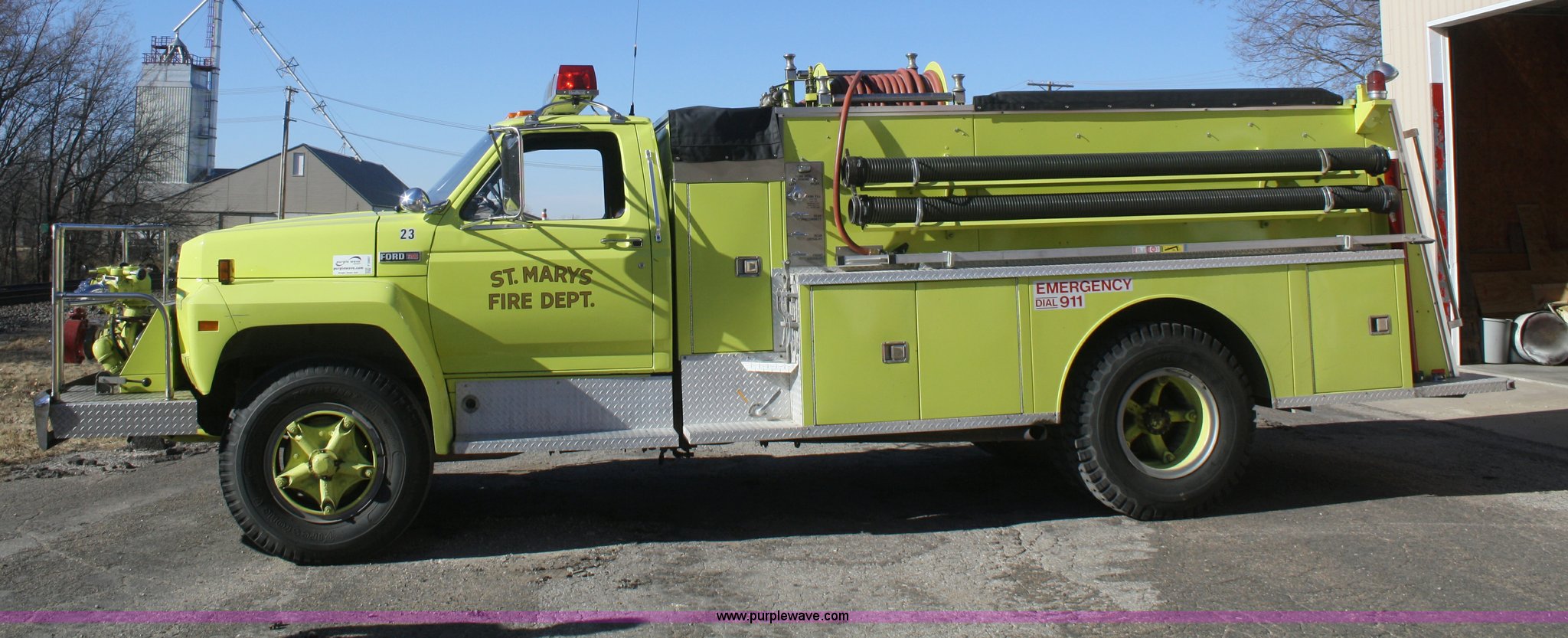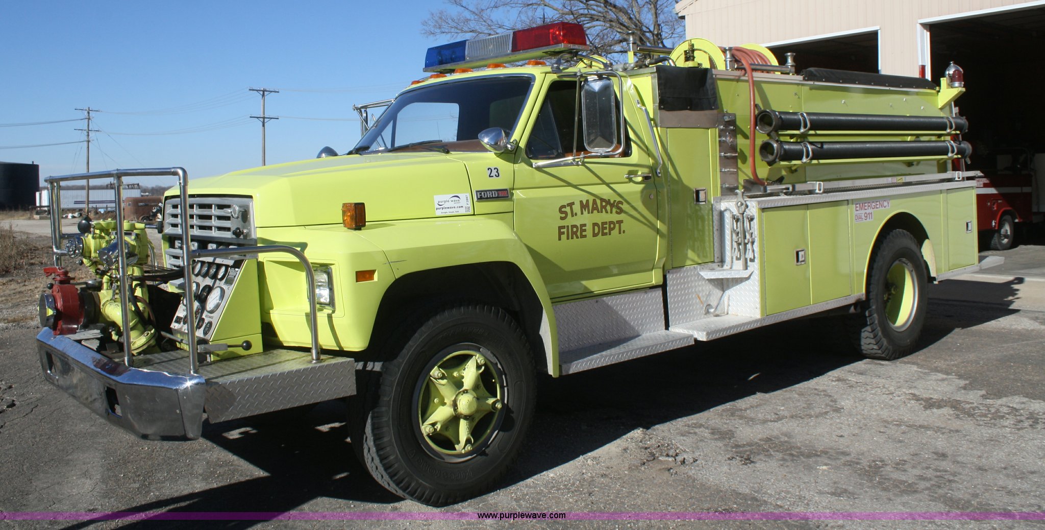 Purple Wave is selling a used Fire Truck or Emergency Vehicle in Kansas. This item is a 1981 Ford F700 firetruck with the following: 9,682 miles on odometer, Miles may vary, Will be in service until the end of the year, 7.0L V8 gas engine, Five speed manual transmission, Two speed axle, Heat, Manual windows and locks, Spotlight, 50 gallon fuel tank, American pump, 750 gpm, 157 hours on meter, Hose reels with hose included, (2) hard hose sections, Ladders, One section of hydrant hose, Extension roof ladder, Hose covers, Light bar included, 700 gallon tank, 10.00-20 tires, GVWR 27,500 lbs, Valve on front of pump not included, Radio not included