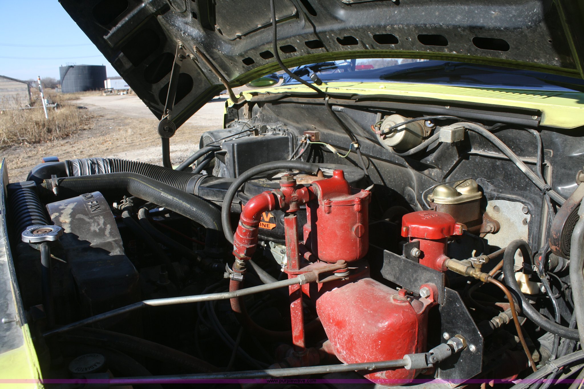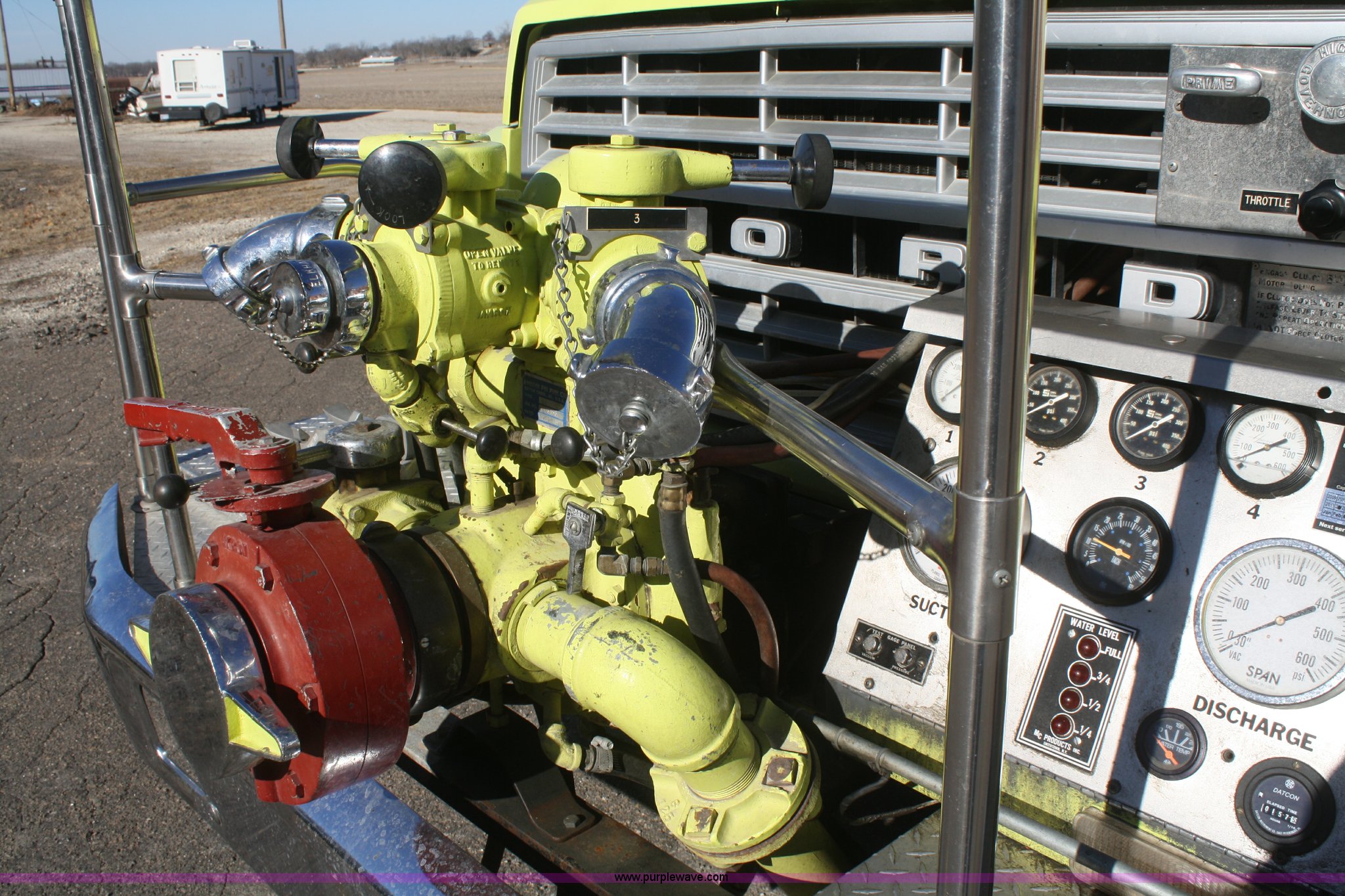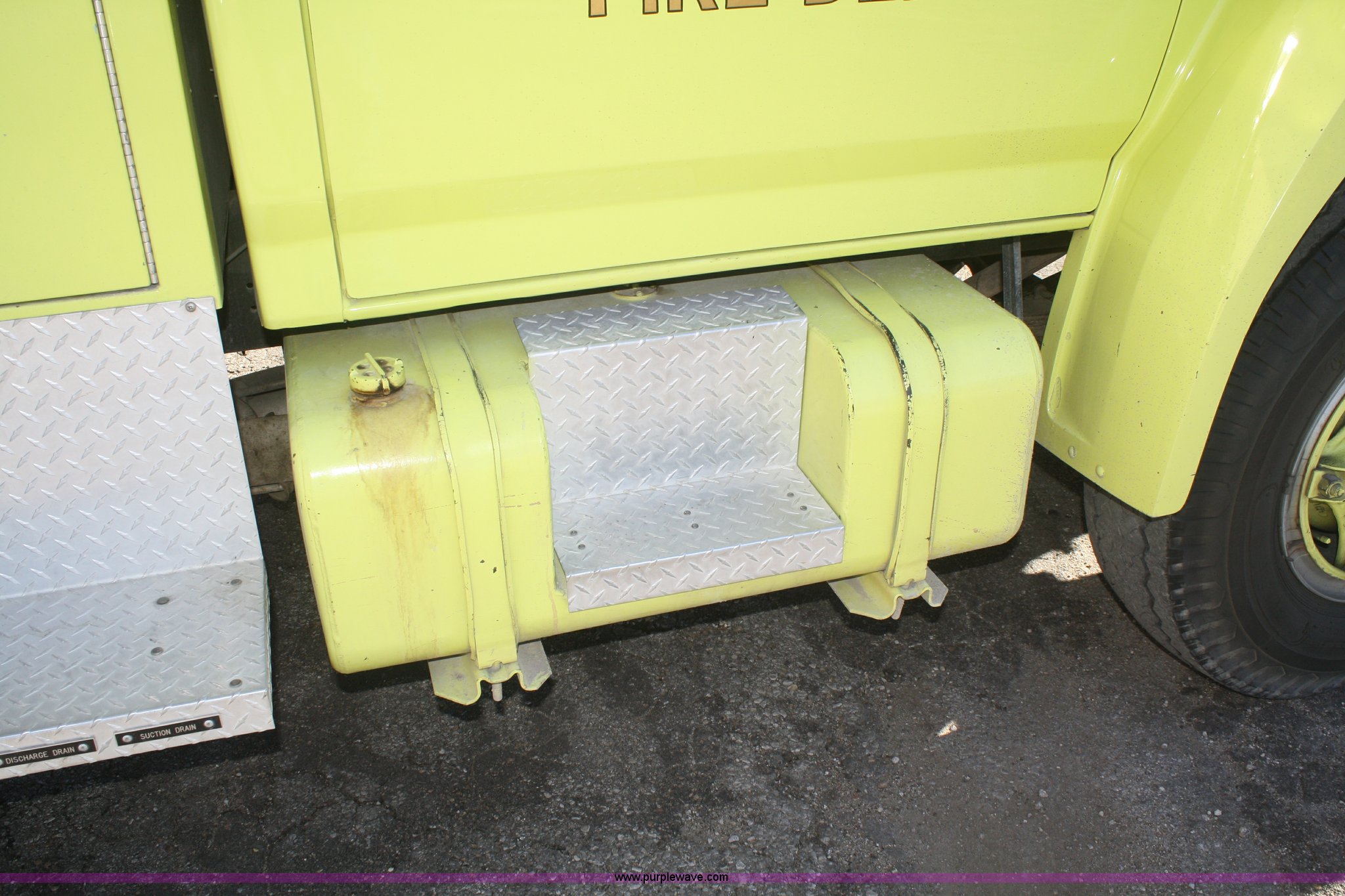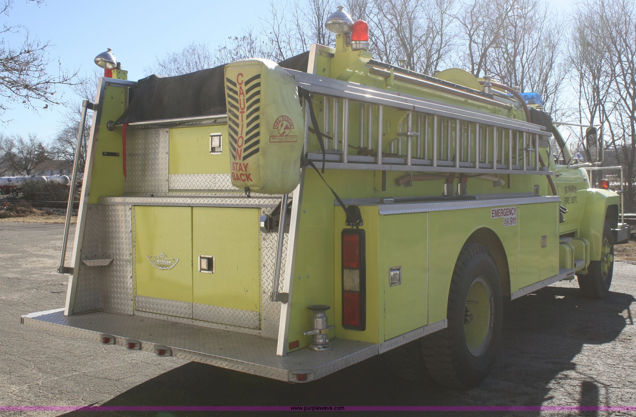 Purple Wave is selling a used Fire Truck or Emergency Vehicle in Kansas. This item is a 1981 Ford F700 firetruck with the following: 9,682 miles on odometer, Miles may vary, Will be in service until the end of the year, 7.0L V8 gas engine, Five speed manual transmission, Two speed axle, Heat, Manual windows and locks, Spotlight, 50 gallon fuel tank, American pump, 750 gpm, 157 hours on meter, Hose reels with hose included, (2) hard hose sections, Ladders, One section of hydrant hose, Extension roof ladder, Hose covers, Light bar included, 700 gallon tank, 10.00-20 tires, GVWR 27,500 lbs, Valve on front of pump not included, Radio not included
