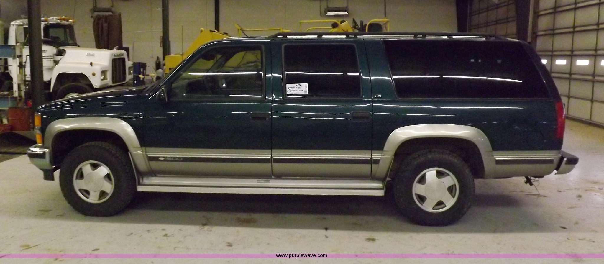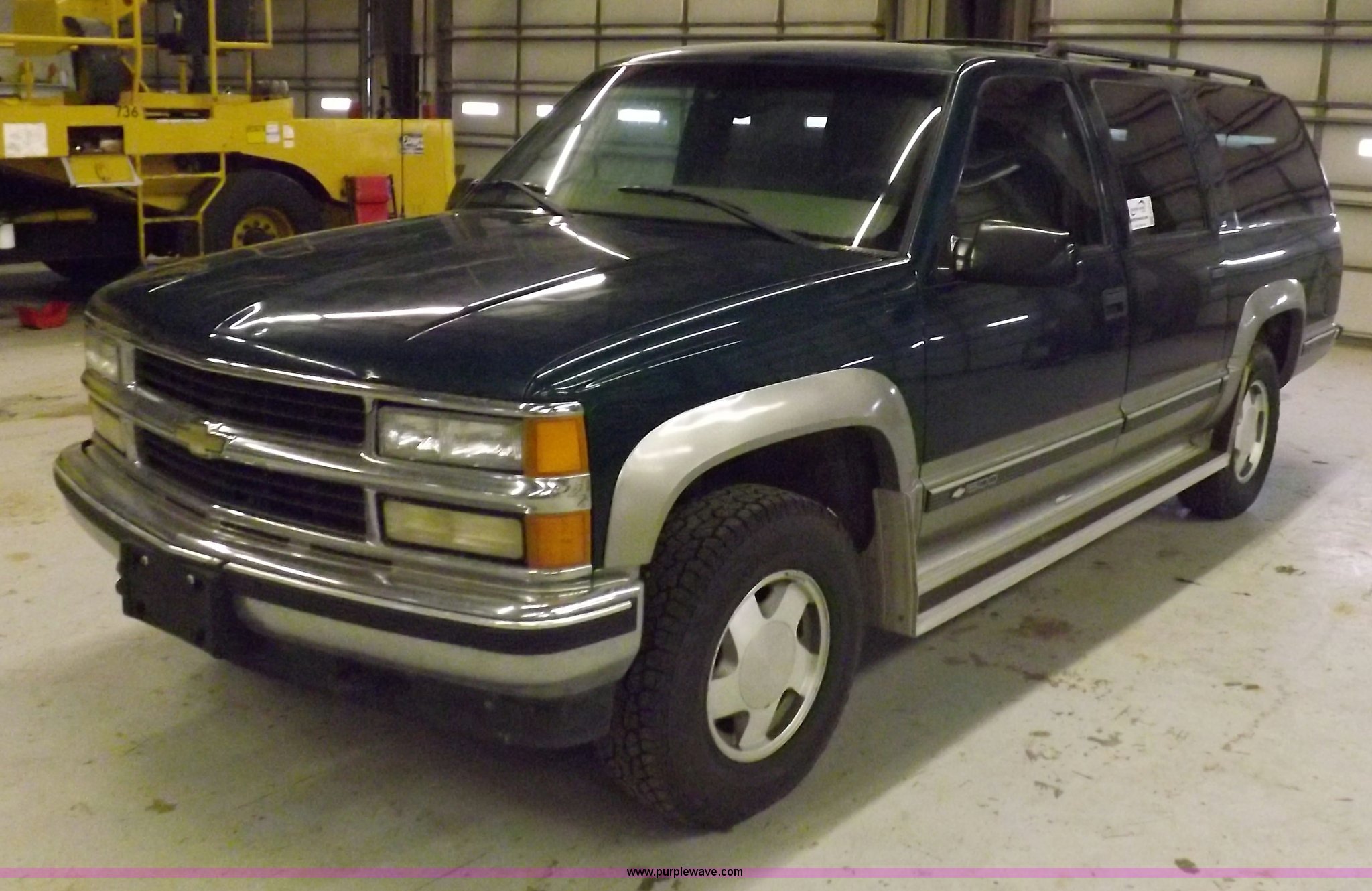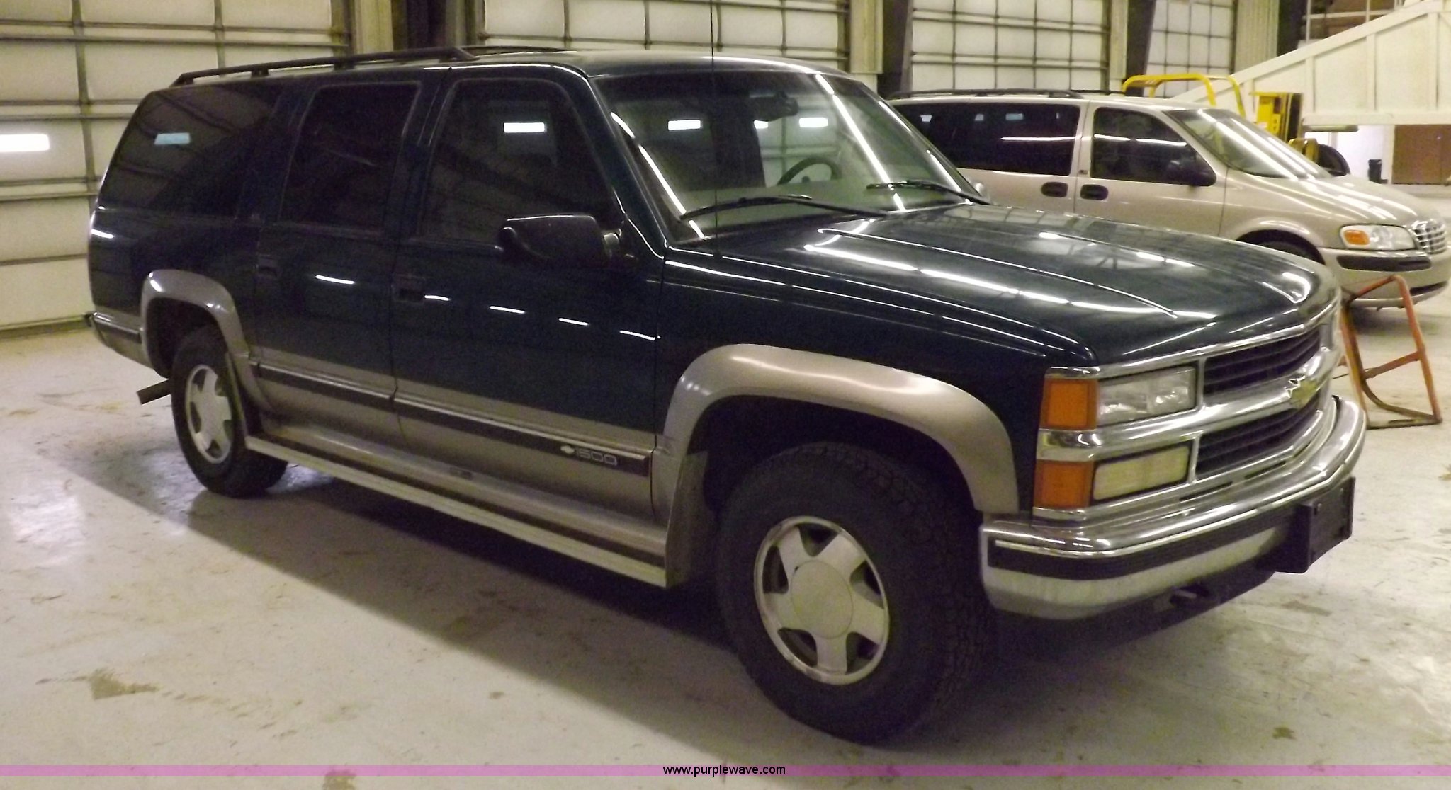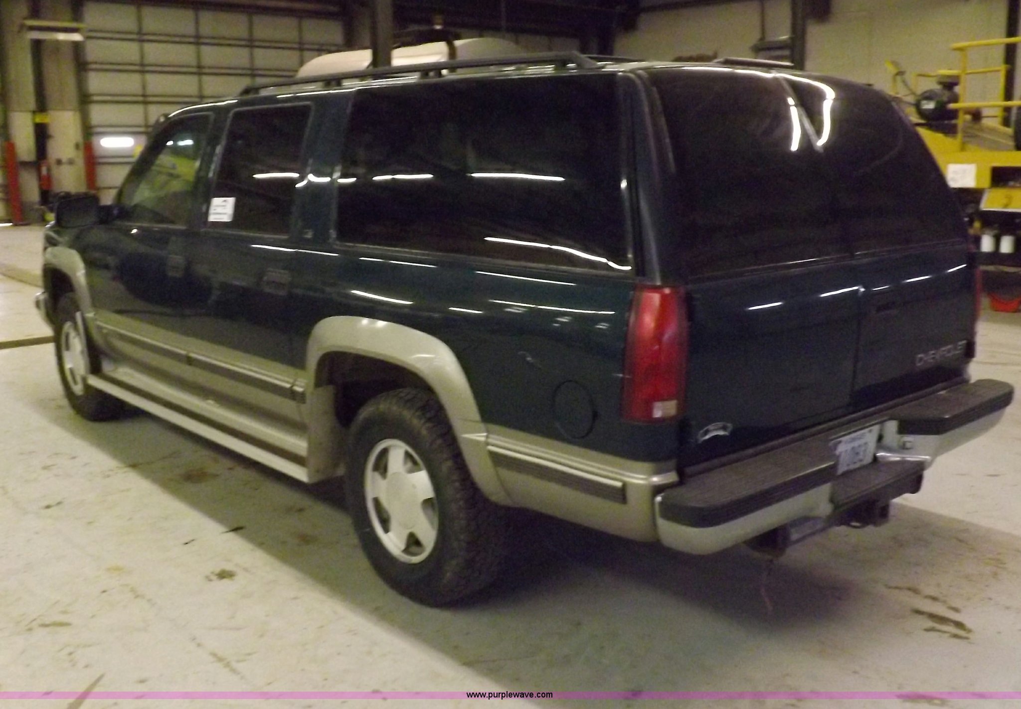 Purple Wave is selling a used Passenger Vehicle in Kansas. This item is a 1999 Chevrolet Suburban 1500 LS SUV with the following: 178,402 miles on odometer, 5.7L V8 CPI gas engine, Automatic transmission, Four wheel drive, AC and heat, Tilt, Cruise, AM/FM/CD/cassette, Power windows, locks, mirrors, and seats, Cloth interior, Luggage rack, Running boards, Receiver hitch, Trailer wiring, 245/75R16 tires, Battery is week, Front end needs repair work