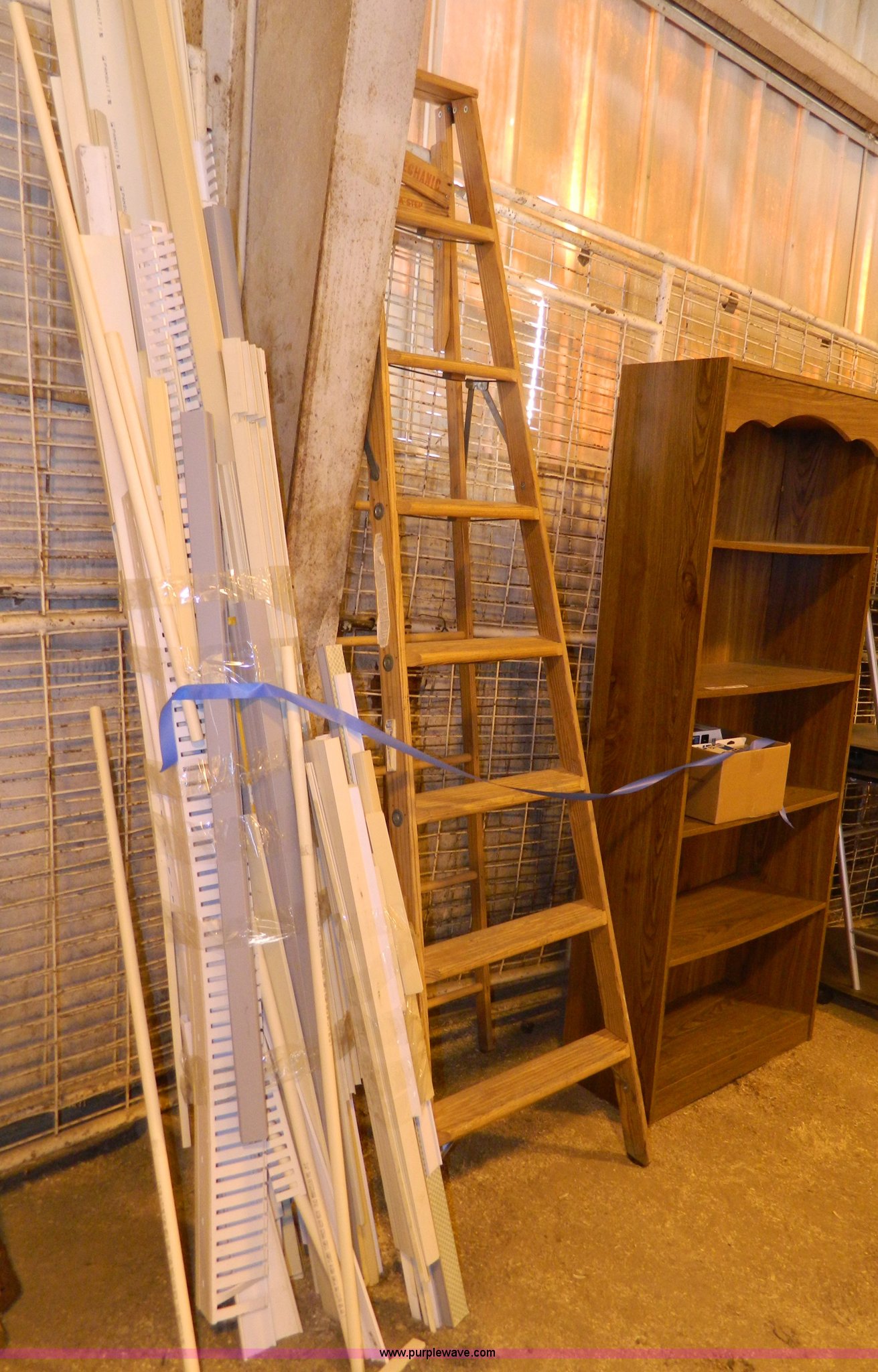 Purple Wave is selling a used Tools in Kansas. This item is a Assorted items with the following: Pressed wood book shelf, Wood step ladder, Assorted trim materials