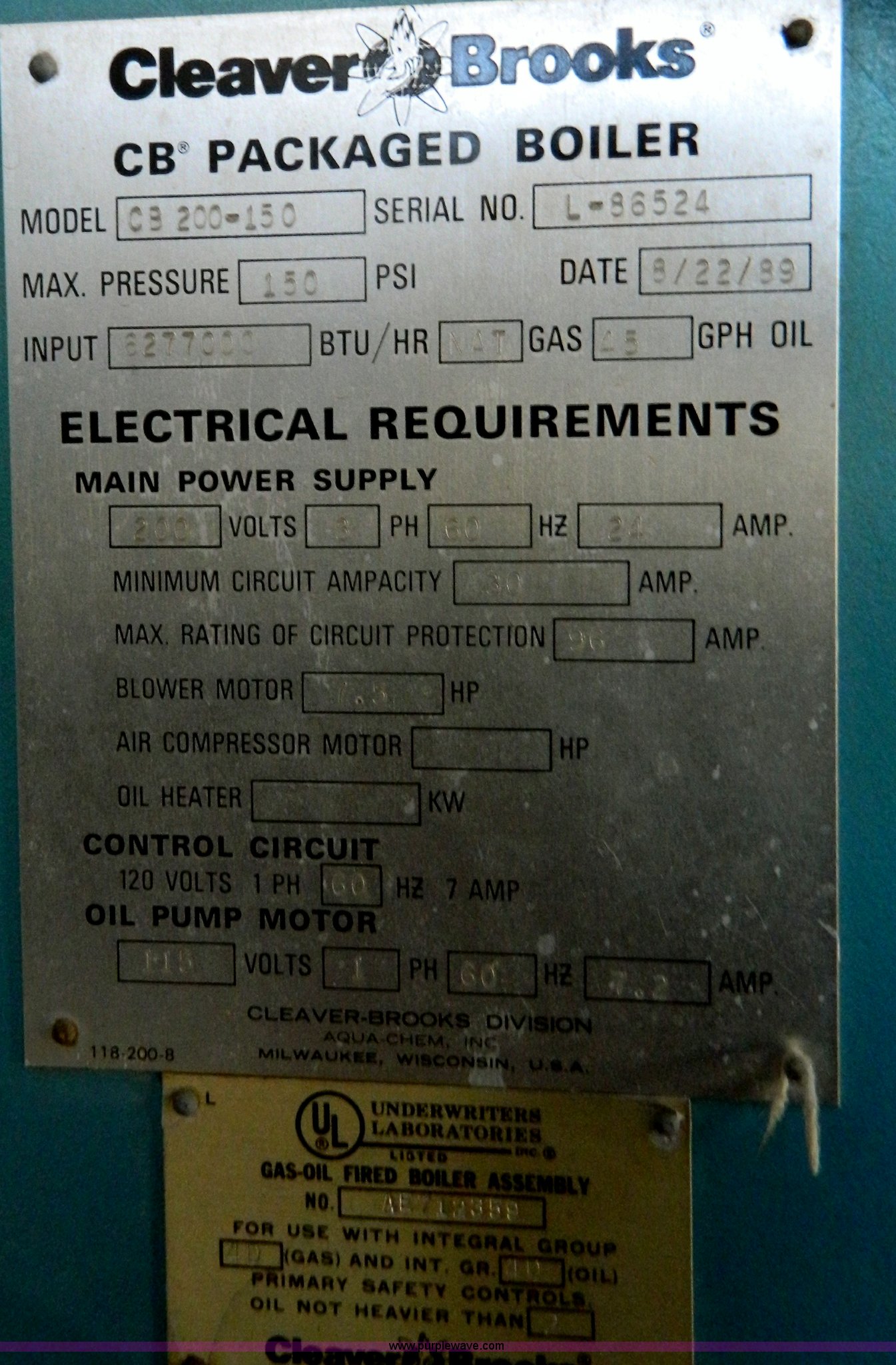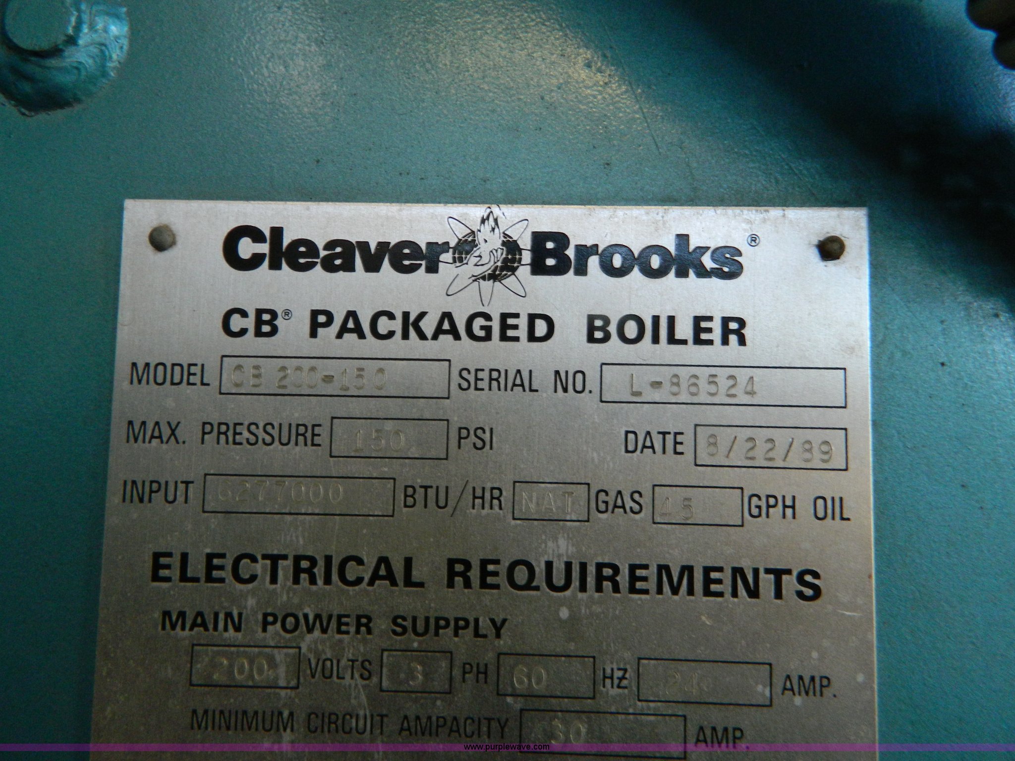 Purple Wave is selling a used Appliances in Kansas. This item is a Cleaver/Brooks boiler unit with the following: Model CB200-150, Natural gas, Three phase, 6,277,000 BTU, Flu pipe included to roof cap, No valving, Some components may be missin, Serial L-86524