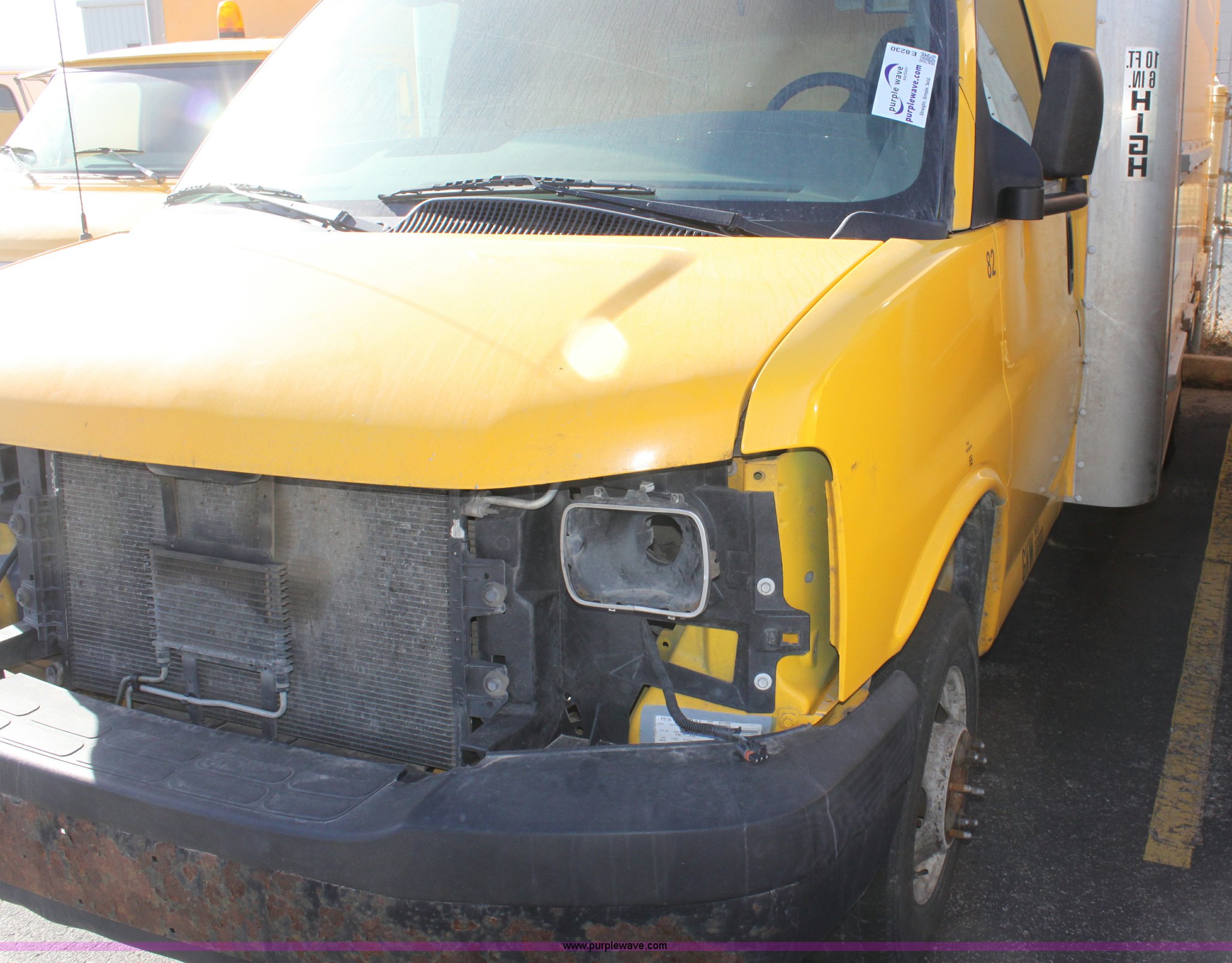 Purple Wave is selling a used Box Truck in Kansas. This item is a 2005 GMC Savana G3500 cargo van with the following: 340,696 miles on odometer, 6.0L V8 OHV 16V gas engine, Automatic transmission, AC and heat, Tilt, Manual windows and locks, Vinyl interior, 16'L box, 16" tires, Interior/exterior cosmetic damage, One cylinder in engine is bad, Needs a battery, Missing grill, Missing one side mirror, Missing gas cap, Missing one inside dual tire, Unit# 82