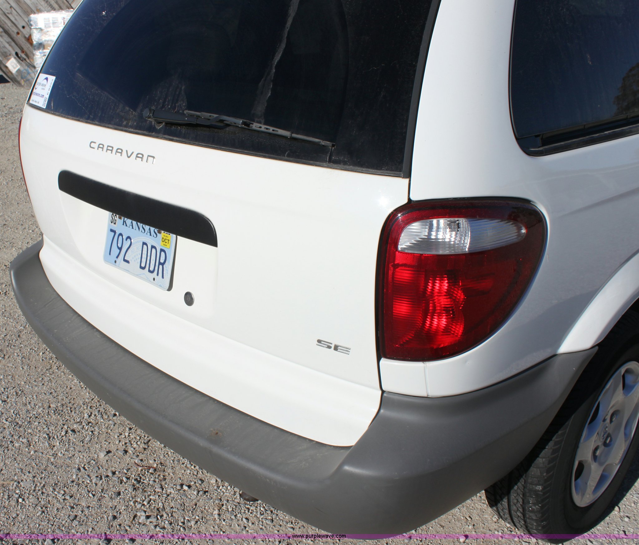 Purple Wave is selling a used Passenger Vehicle in Kansas. This item is a 2001 Dodge Caravan SE van with the following: 154,907 miles on odometer, 3.3L V6 OHV 12V FFV gas engine, Automatic transmission, AC and heat, Tilt, Cruise, AM/FM/cassette, Power windows, locks, and mirrors, Cloth interior, Dual sliding doors, 215/70R15 tires, Interior/exterior cosmetic damage, Hail damage