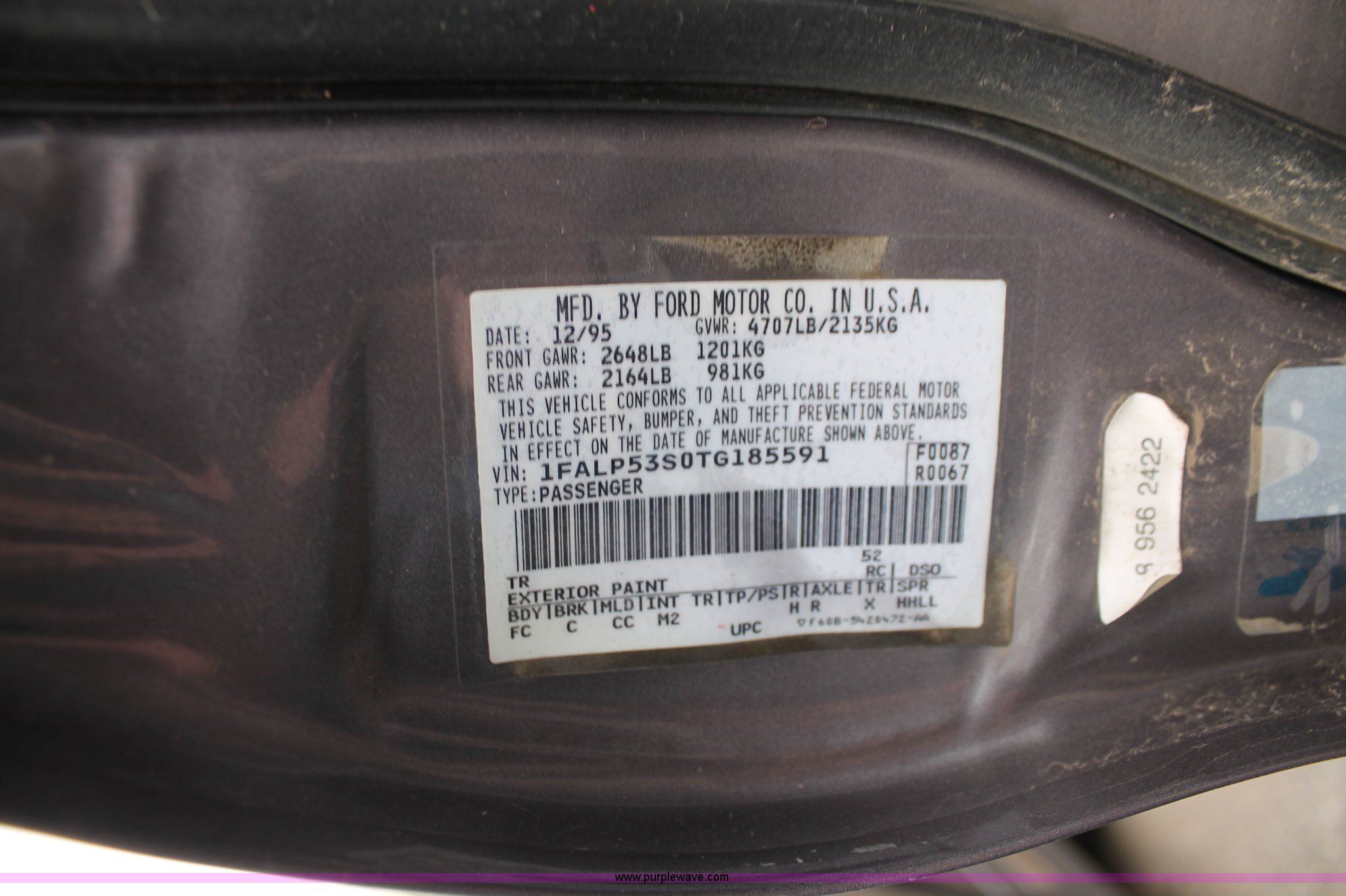 1996 Ford Taurus. 155,640 miles on odometer, 3.0L V6 DOHC 24V gas engine, Automatic transmission, AC and heat, Tilt, Cruise, AM/FM/cassette, Power windows, locks, and mirrors, Leather interior, Keyless entry, Sunroof, 205/65R15 tires, Interior/exterior cosmetic damage, Cracked windshield, Unknown running condition, Case# 12C54181. Previously titled with a rebuilt salvage brand. Vehicle is abandoned. No additional information is available. Vehicle does not have keys unless notated otherwise in the item listing.. Buyer will receive paperwork indicating the abandoned status of the vehicle and which is sufficient to receive a title.. Items must be removed within 7 days following the close of the auction. Failure to do so will result in a $20 per day storage fee payable to the tow company. 1FALP53S0TG185591. Shipping quotes available. Ken's Auto Tow. 3730 S Broadway. Wichita, KS 67216