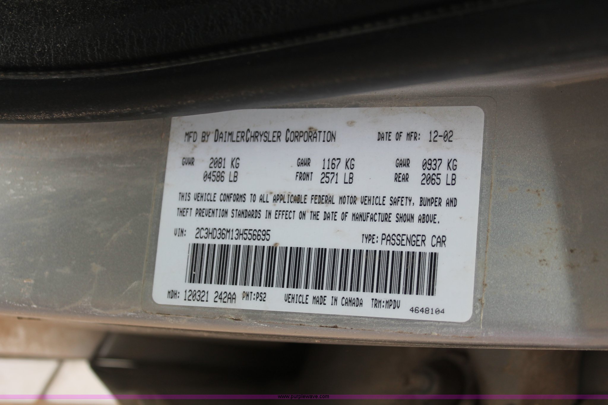 Purple Wave is selling a used Wrecked and Abandoned in Kansas. This item is a 2003 Chrysler Concrde Lxi with the following: Mileage unknown, 3.5L V6 SOHC 24V gas engine, Automatic transmission, AC and heat, Tilt, Cruise, AM/FM/CD, Power windows, locks, mirrors, and seats, Leather interior, Digital temperature and compass, Keys, P225/60R16 tires, Flat tires, Interior/exterior cosmetic damage, Dead battery, Dents, Unknown running condition, Case# 12C57956