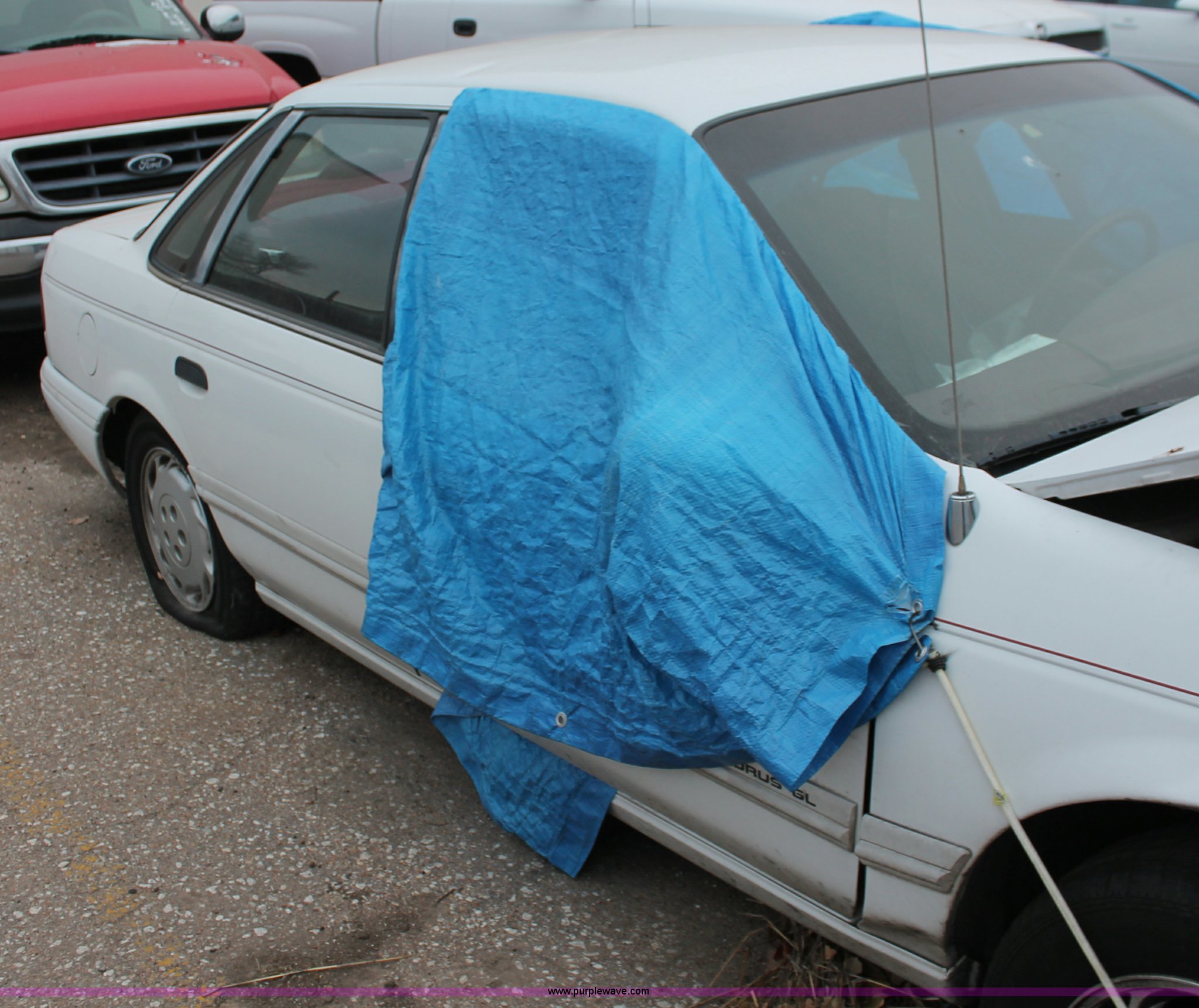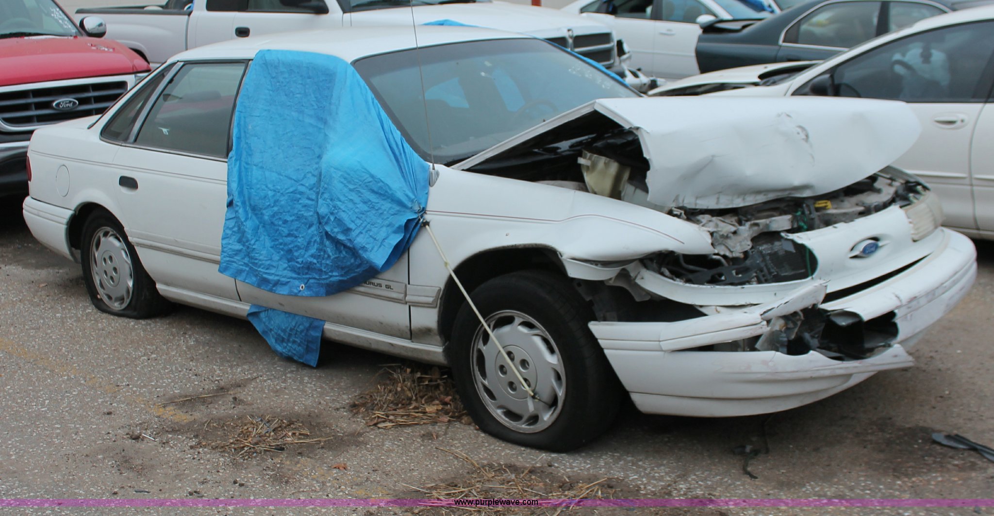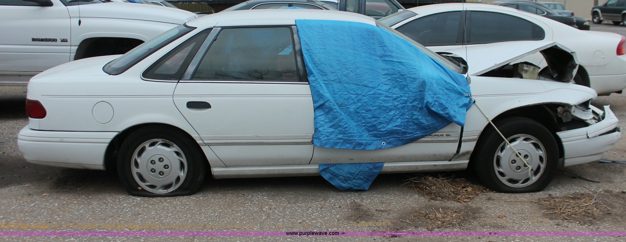 Purple Wave is selling a used Wrecked and Abandoned in Kansas. This item is a 1993 Ford Taurus GL with the following: 57,884 miles on odometer, 3.8L V6 OHV 12V gas engine, Automatic transmission, AC and heat, Tilt, Cruise, Pioneer AM/FM/CD, Power windows, locks, and mirrors, Cloth interior, Interior/exterior cosmetic damage, Front end damage, Cracked windshield, Windows missing, Flat tires, Air bags deployed, Unknown running condition, Case# 12C058754