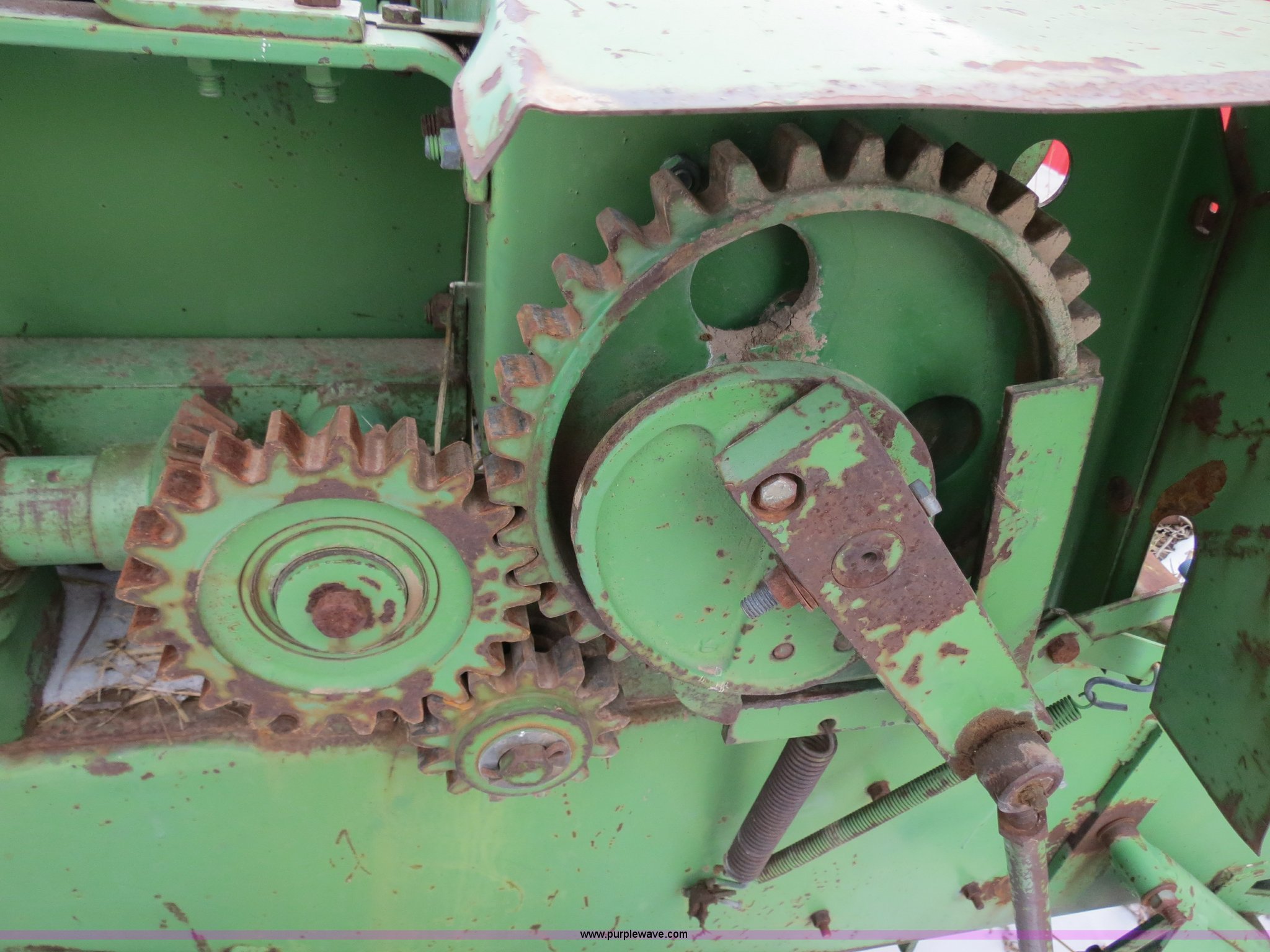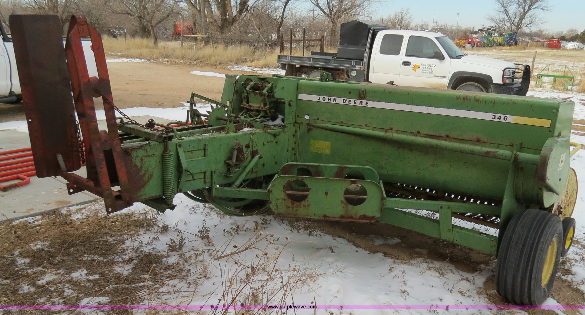 Purple Wave is selling a used Square Baler in Oklahoma. This item is a John Deere 346 small square baler with the following: Wire tie, 540 PTO, Pin hitch, Rear side turn chute, 11L-14 tires, 26x12.00-12 tires, Plunger shaft broken
