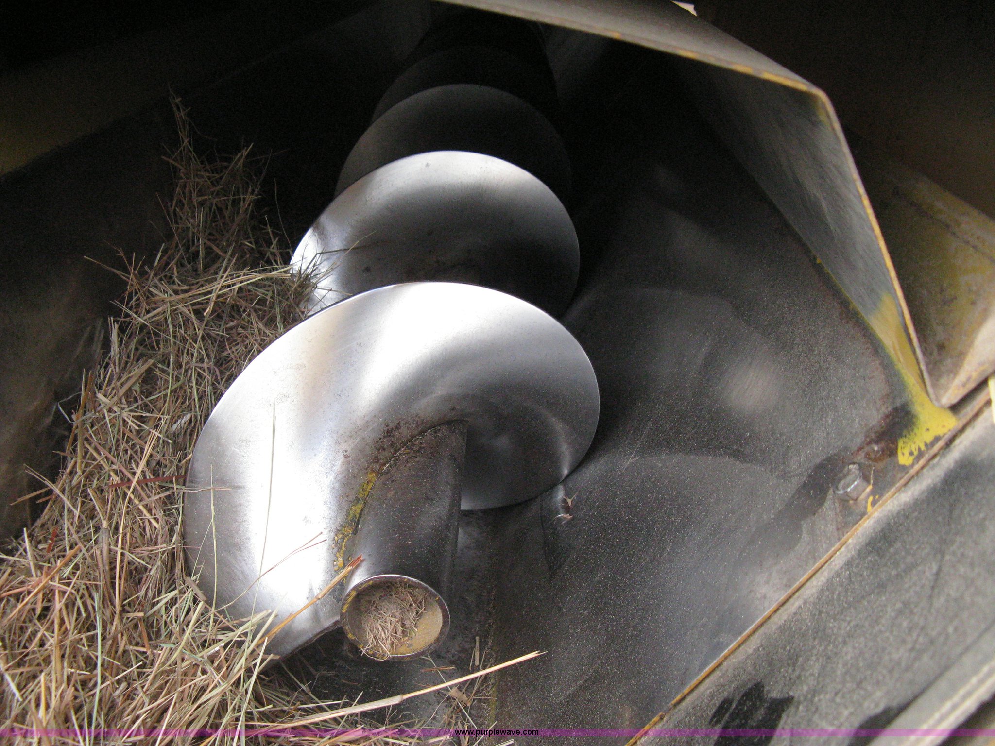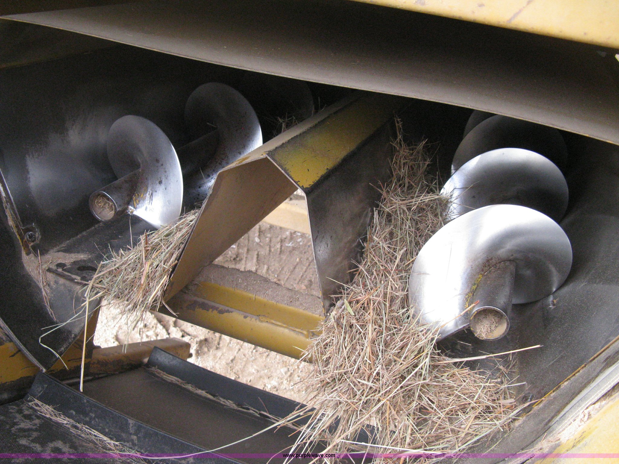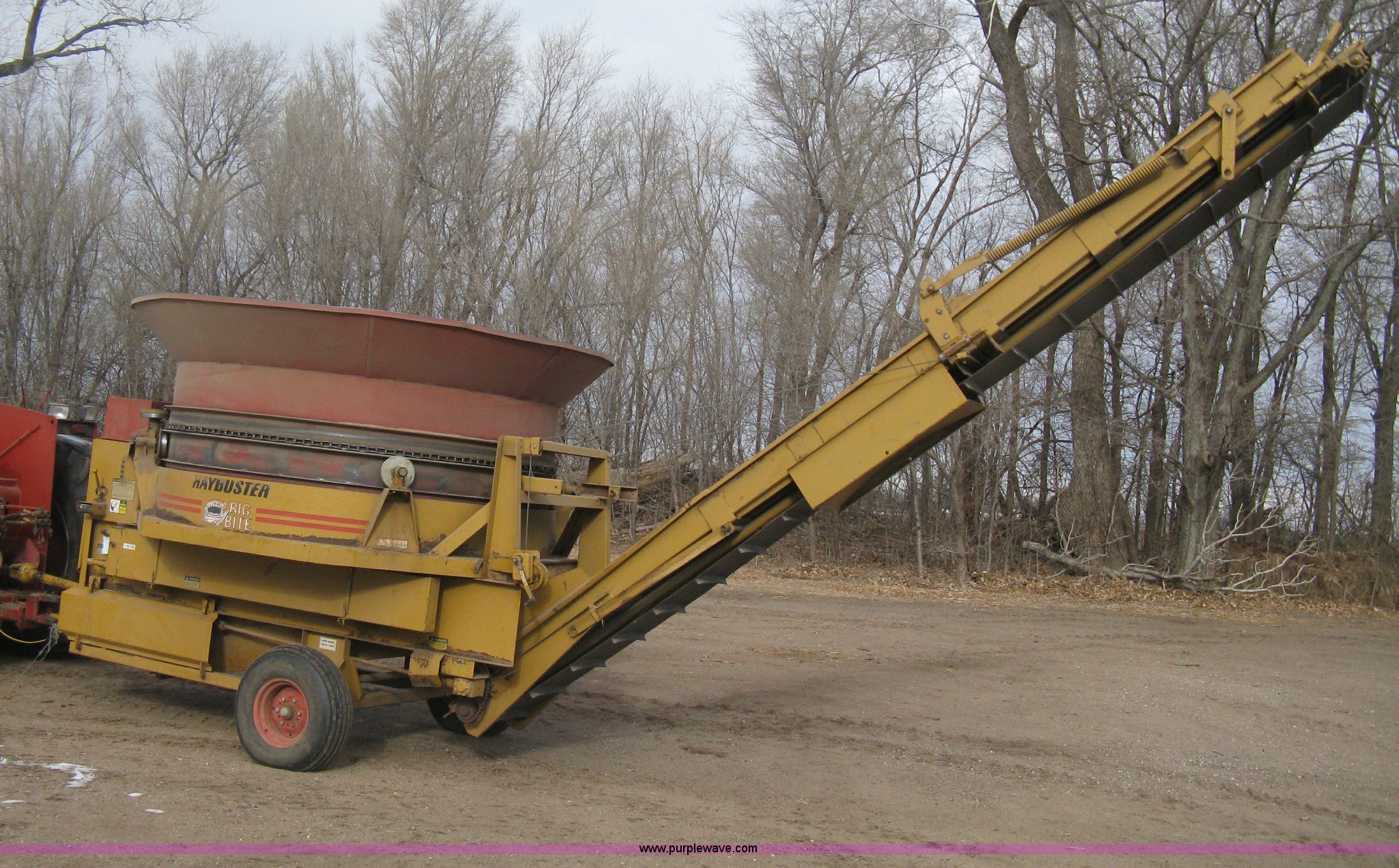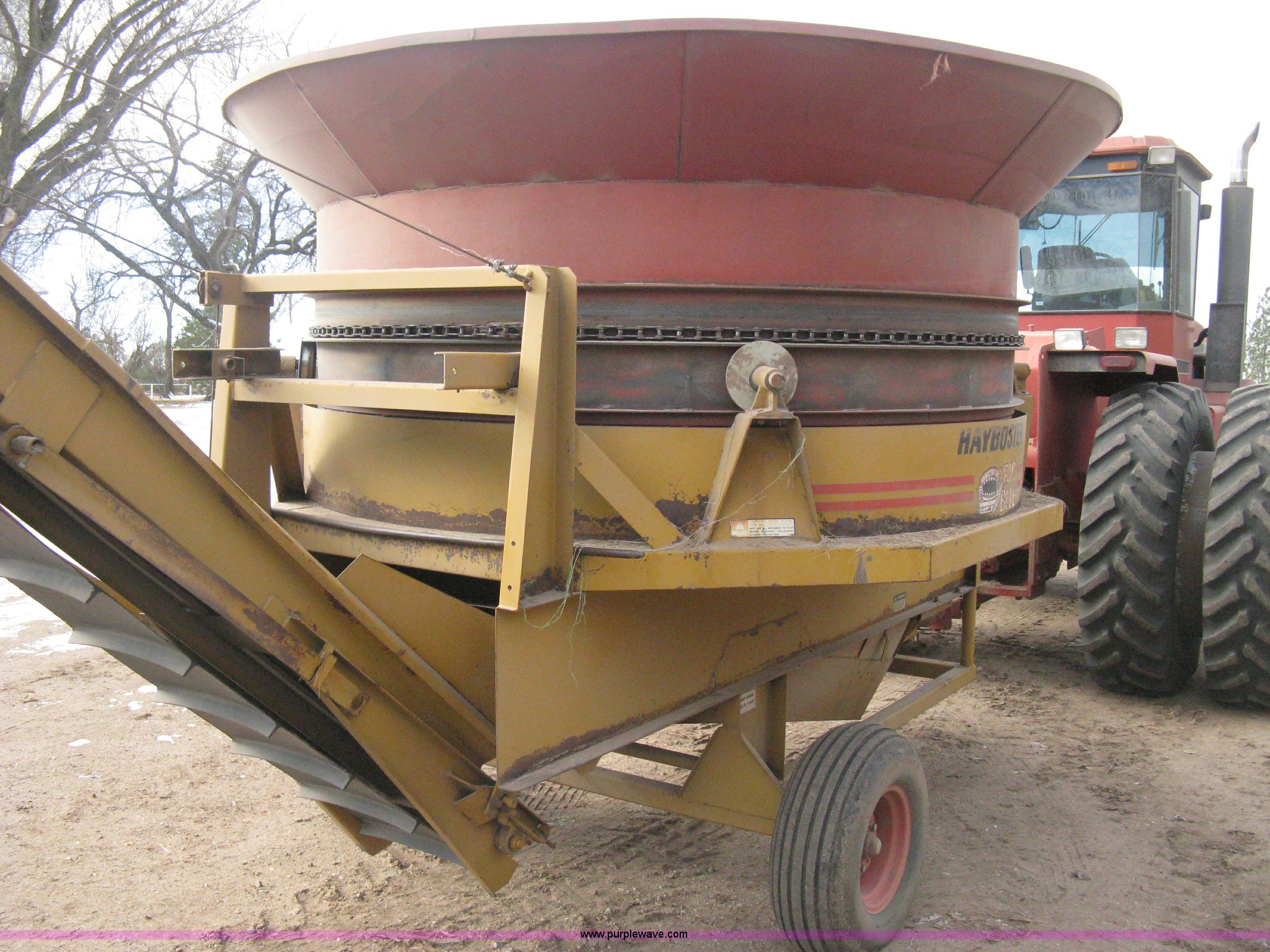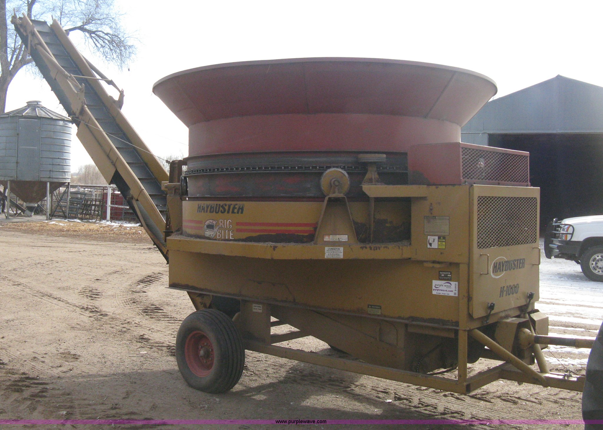 Purple Wave is selling a used Feed Mixer or Bale Processor in Kansas. This item is a 1992 HayBuster H1000 Big Bite tub grinder with the following: 1000 PTO, Adjustable height conveyor, Hand winch, 18" conveyor belt, Tier at belt splicing, Twin auger discharge, Calibration remote, Pin hitch, Jack stand, 9.5L-14SL tires, Recently replaced two auger belts, Unused auger, Unused discharge pan insert, Serial 9203098