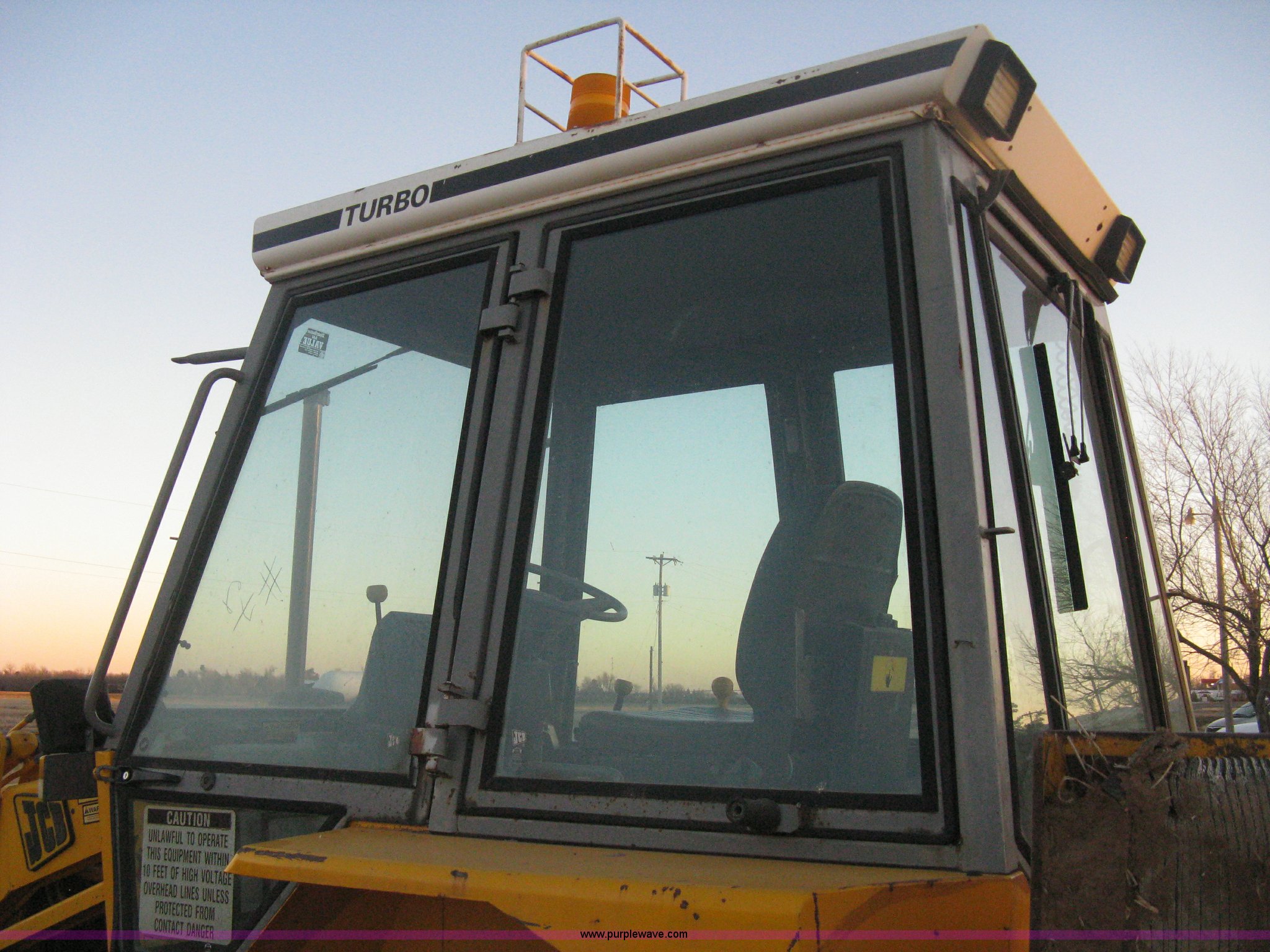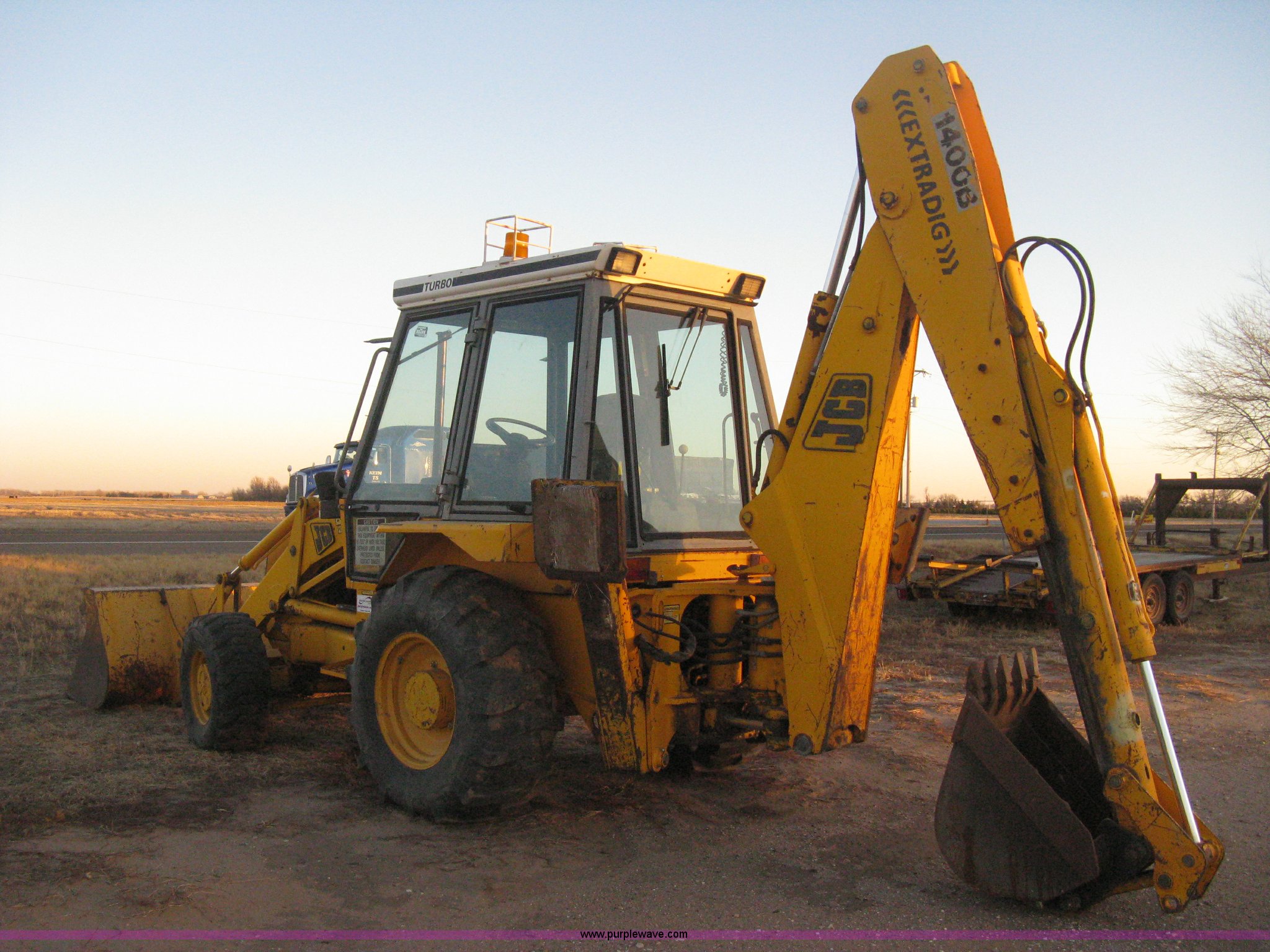 Purple Wave is selling a used Tractor Loader Backhoe in Kansas. This item is a 1990 JCB 1400B Extradig backhoe with the following: 2,515 hours on meter, Four cylinder turbo diesel engine, Serial AC557500U, Four speed shuttle shift transmission, Four wheel drive, Enclosed cab, Suspension seat, Tip-out windows, Front and rear windshield wipers, Work lights, Joystick loader control, Foot feed throttle, Block heater, 88"W loader bucket, Bolt-on edge, Extend-A-Hoe backhoe, 24" toothed bucket, Outriggers with street pads, 14-17.5 front tires, 19.5L-24 rear tires, Serial 14BT4011/362095/7