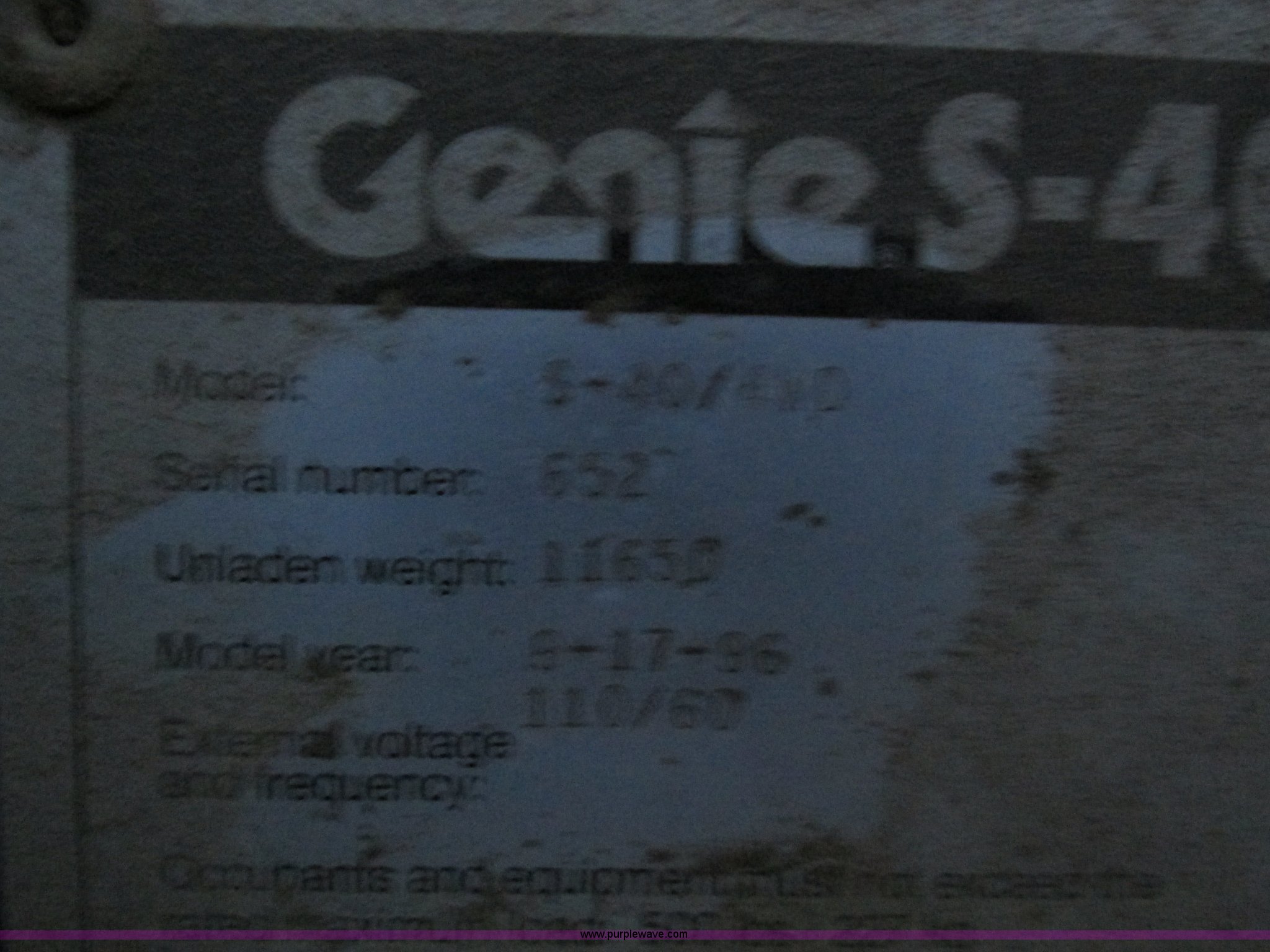 1996 Genie S40 boom lift. Ford four cylinder gas engine Model LRG-4231-6007-8, Serial 24164-T-26-RK, Hydrostatic transmission, Four wheel drive, 40' maximum platform height, 31'8" maximum reach, Ground and basket controls, 94"L x 33"W platform, 12-16.5 tires, Turn table rebuilt in 2010, Starts but does not want to stay running, Serial 652. Shipping quotes available. Propaint LLC.. 5410 NE 49th Street. Kansas City, MO 64119