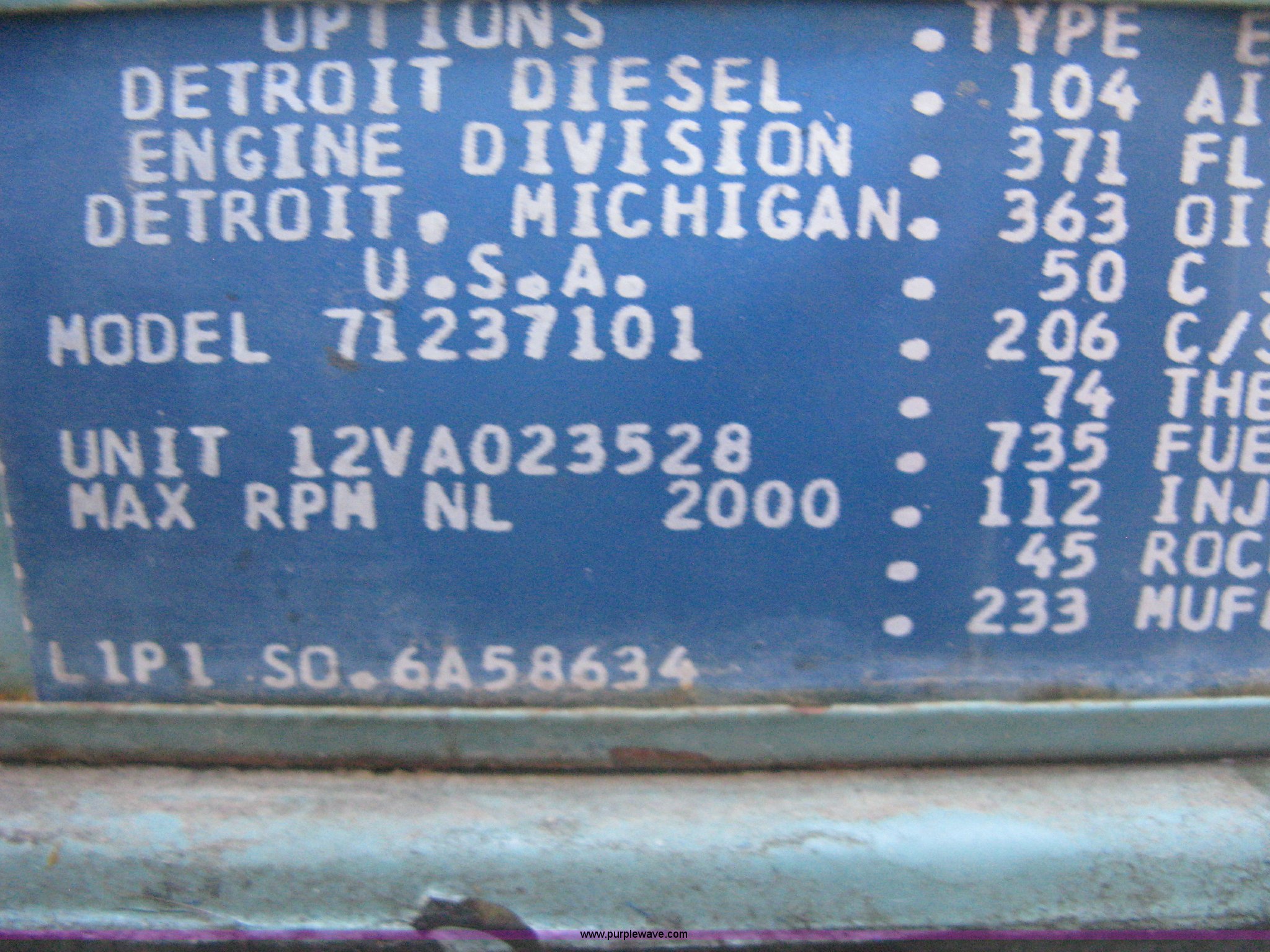 Purple Wave is selling a used Generator Set in Kansas. This item is a Detroit diesel powered generator with the following: 65 hours on meter, Detroit 12V-71 diesel engine, Model 71237101, 1,800 RPM, Three phase, 120/208V, 230 kW, Murphy MGC100 cascade control monitor, Skid mounted, Serial E5970M3