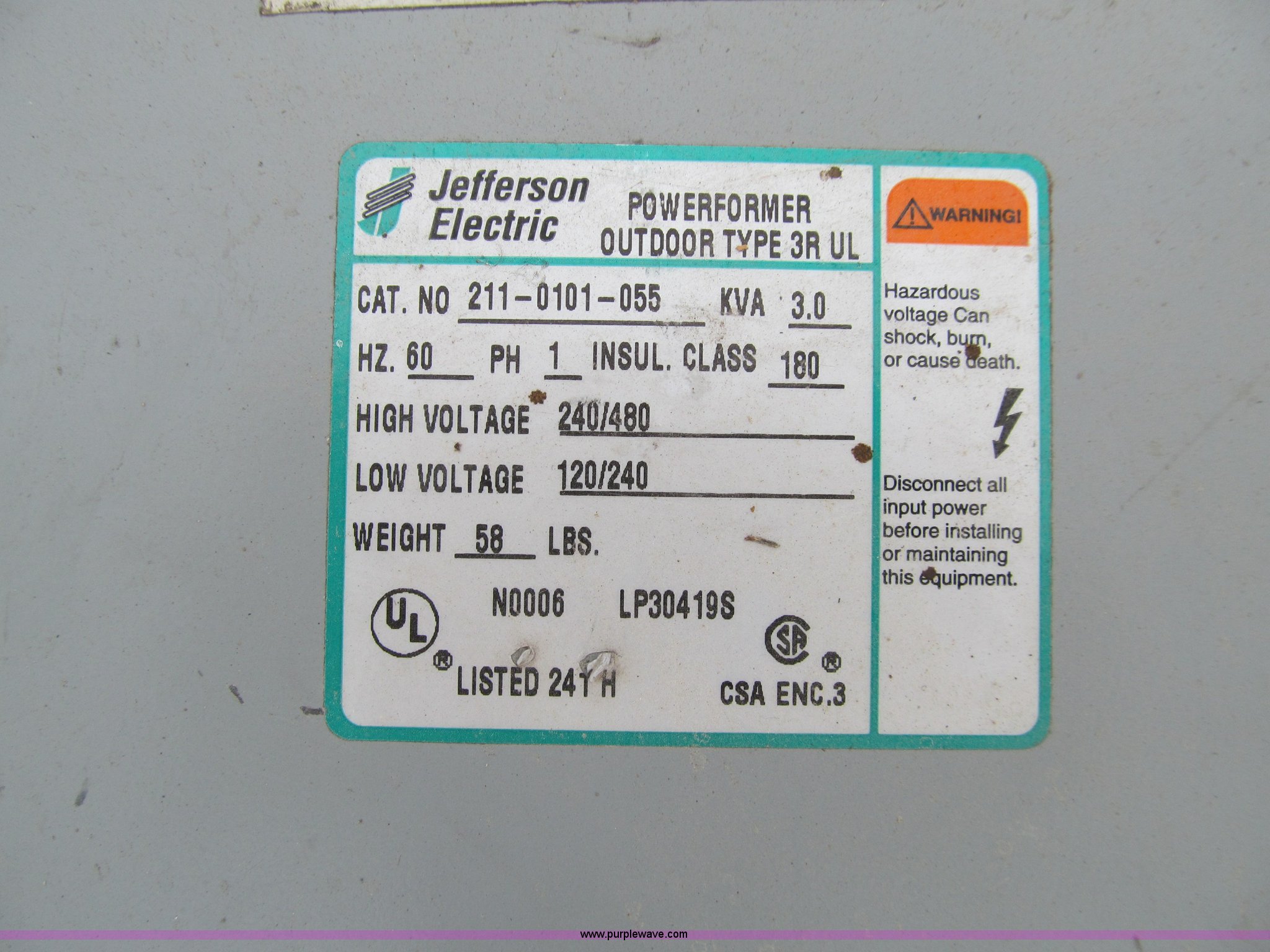 Jefferson Electric dry transformers. Catalog No. 211-161 15 kVA, 240/480V high voltage, 120/480V low voltage, Single phase, Catalog No. 211-0101-055 3 kVA, 240/480V high voltage, 120/240V low voltage, Single phase. Shipping quotes available. Hensley Trailer Sales. 1304 W South St. Mount Ayr, IA 50854