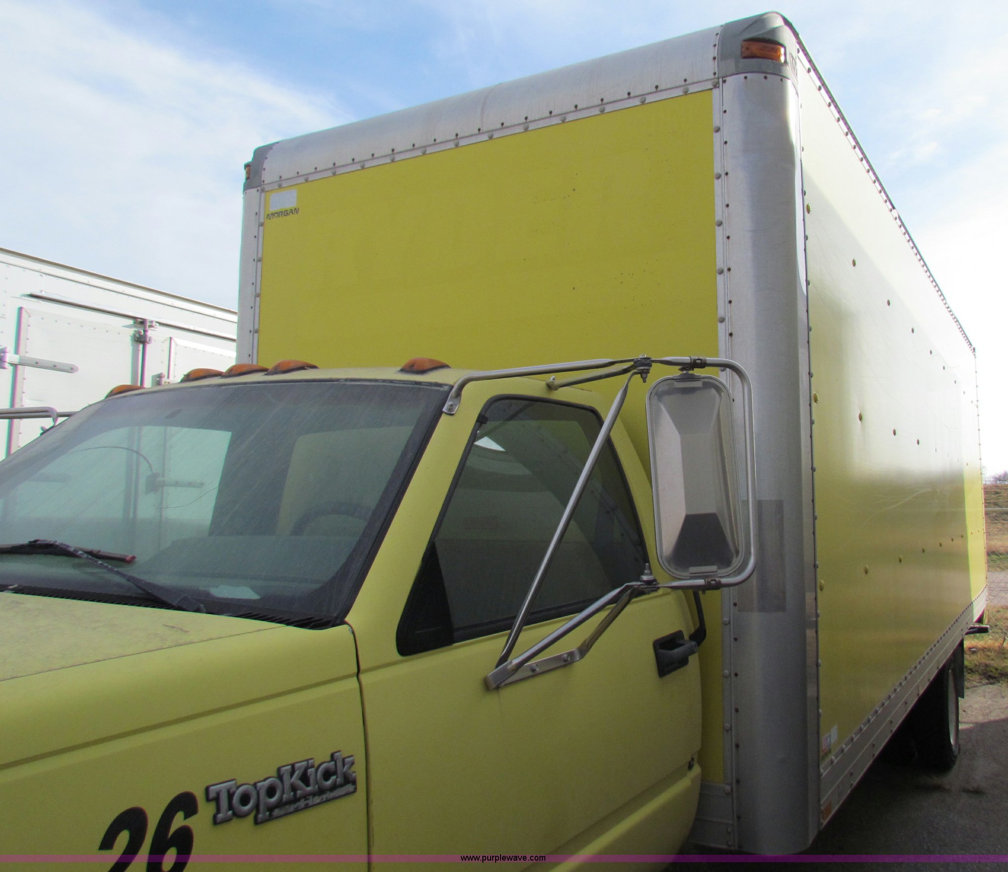 Purple Wave is selling a used Box Truck in Kansas. This item is a 1995 Chevrolet TopKick box truck with the following: 220,701 miles on odometer, Caterpillar 3116 diesel engine, Automatic transmission, AC and heat, Manual windows and locks, Vinyl interior, 245/70R19.5 tires, Interior/exterior cosmetic damage, Parking brake is inoperable, Door latches are broken, Unit# 26Yellow