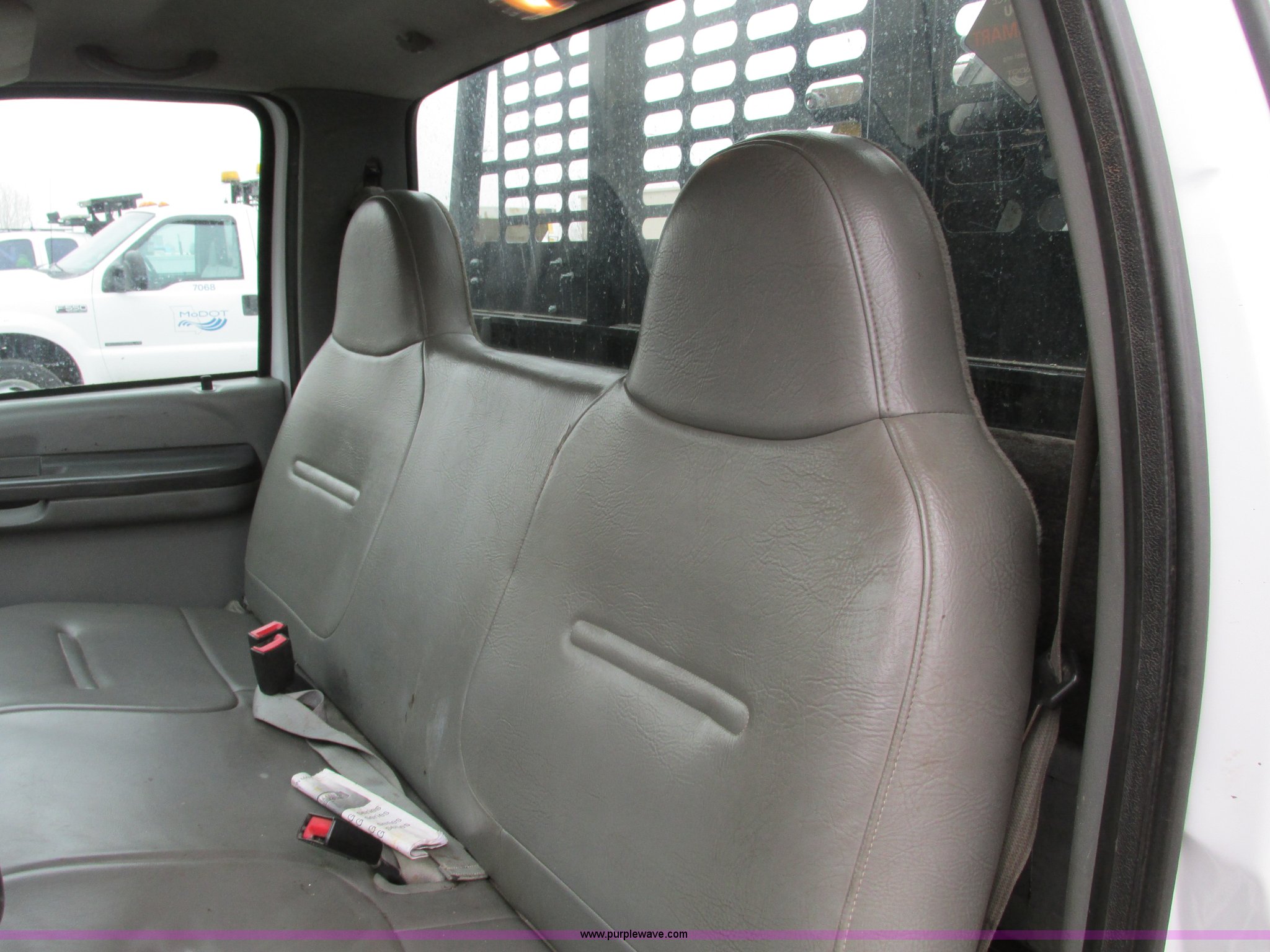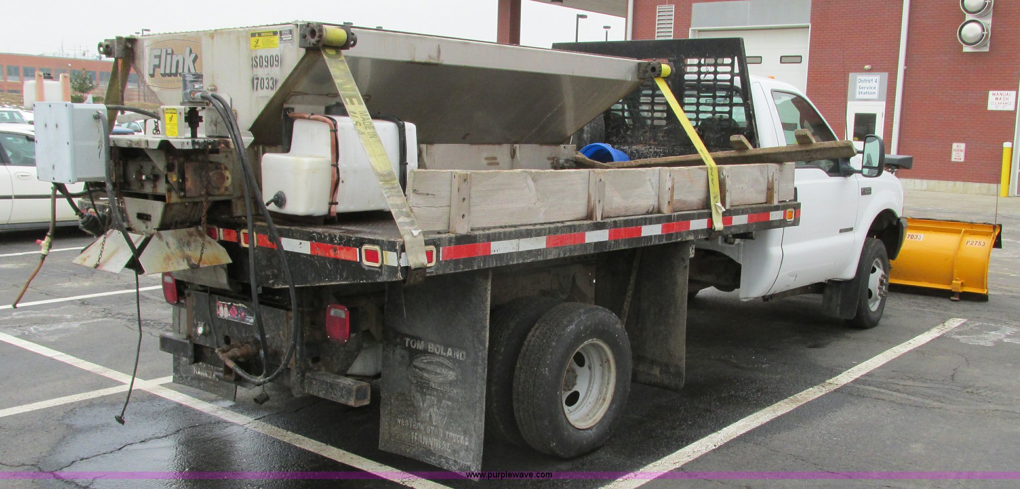 2002 Ford F350 Super Duty pickup truck. 166,491 miles on odometer, 7.3L V8 OHV 16V turbo diesel engine, Automatic transmission, AC and heat, AM/FM, Manual windows and locks, Vinyl interior, Long bed, 9' four-way pivot snow plow Smooth cutting edge and break-away springs, Work lights, Flink salt spreader with calcium tanks Model 8HSU, 8'L x 4.5'W Grate over top, Hydraulic operated, Serial 1152, Receiver hitch, Trailer wiring, 215/85R16 tires, CB radio not included, Unit# 7033. 1FDWF36F32EC07179. Shipping quotes available. Missouri Department of Transportation (MODOT). 600 NE Colbern Rd. Lees Summit, MO 64086
