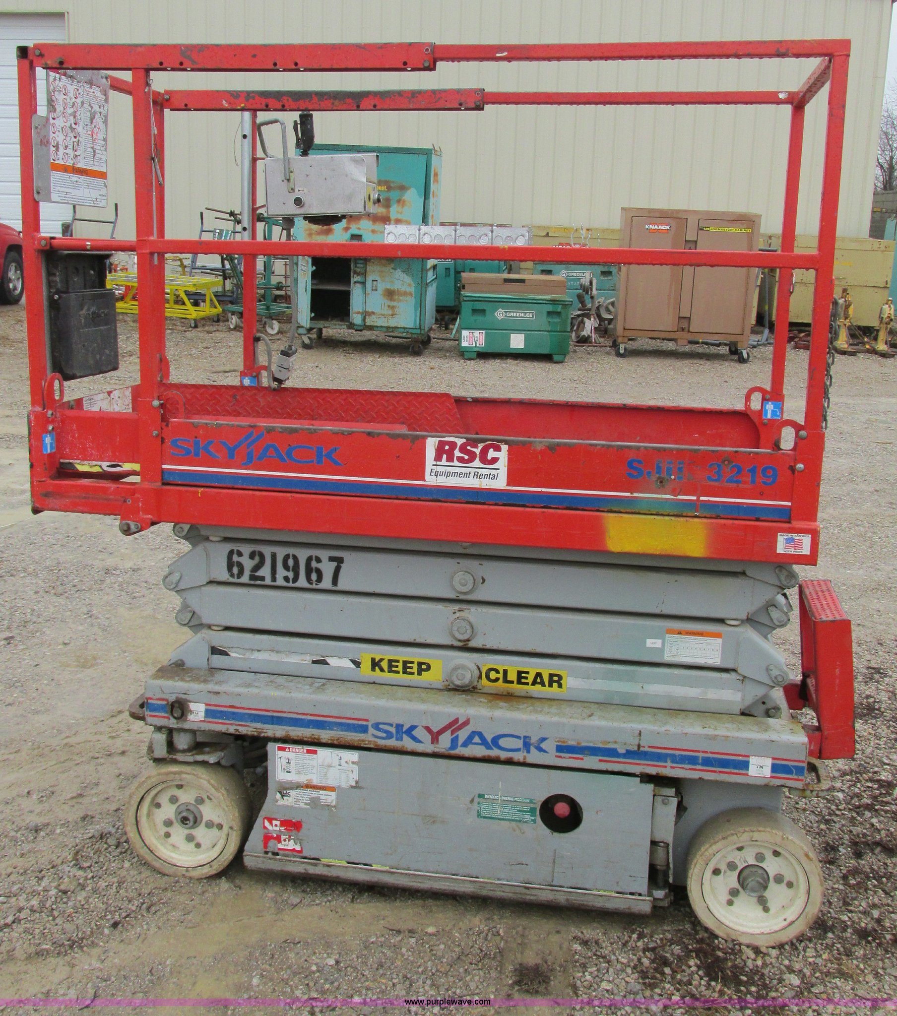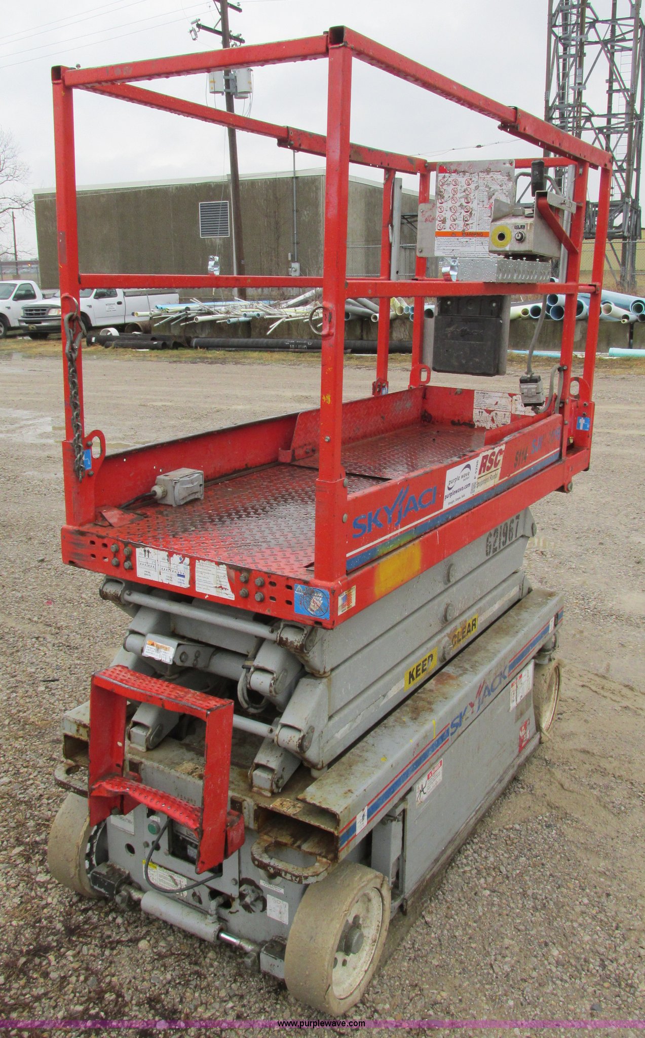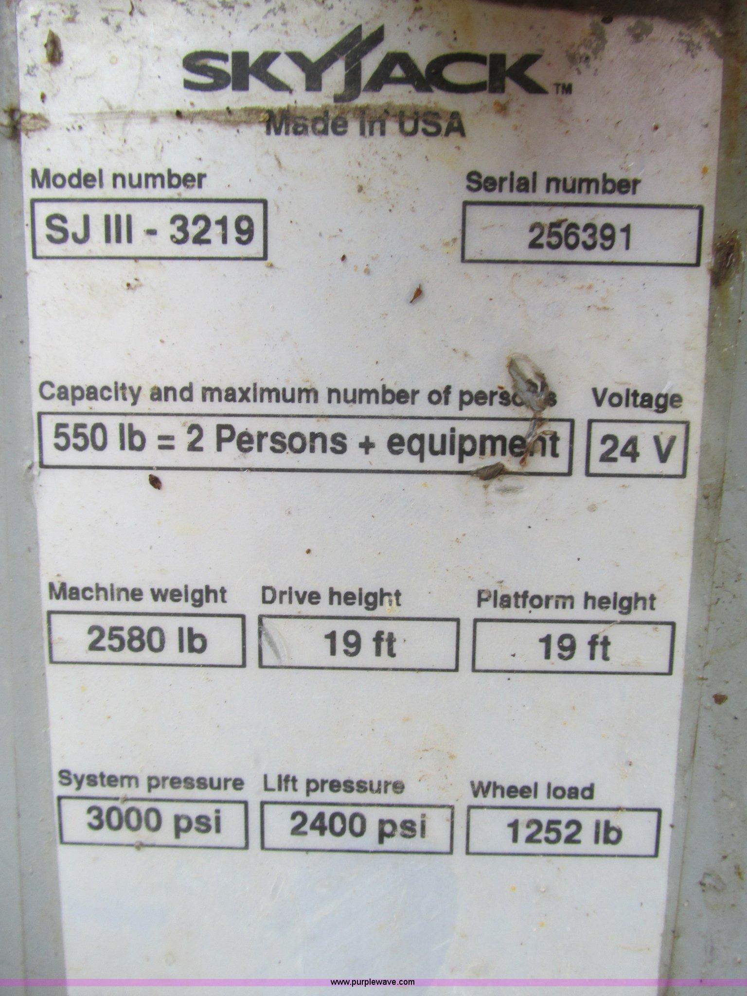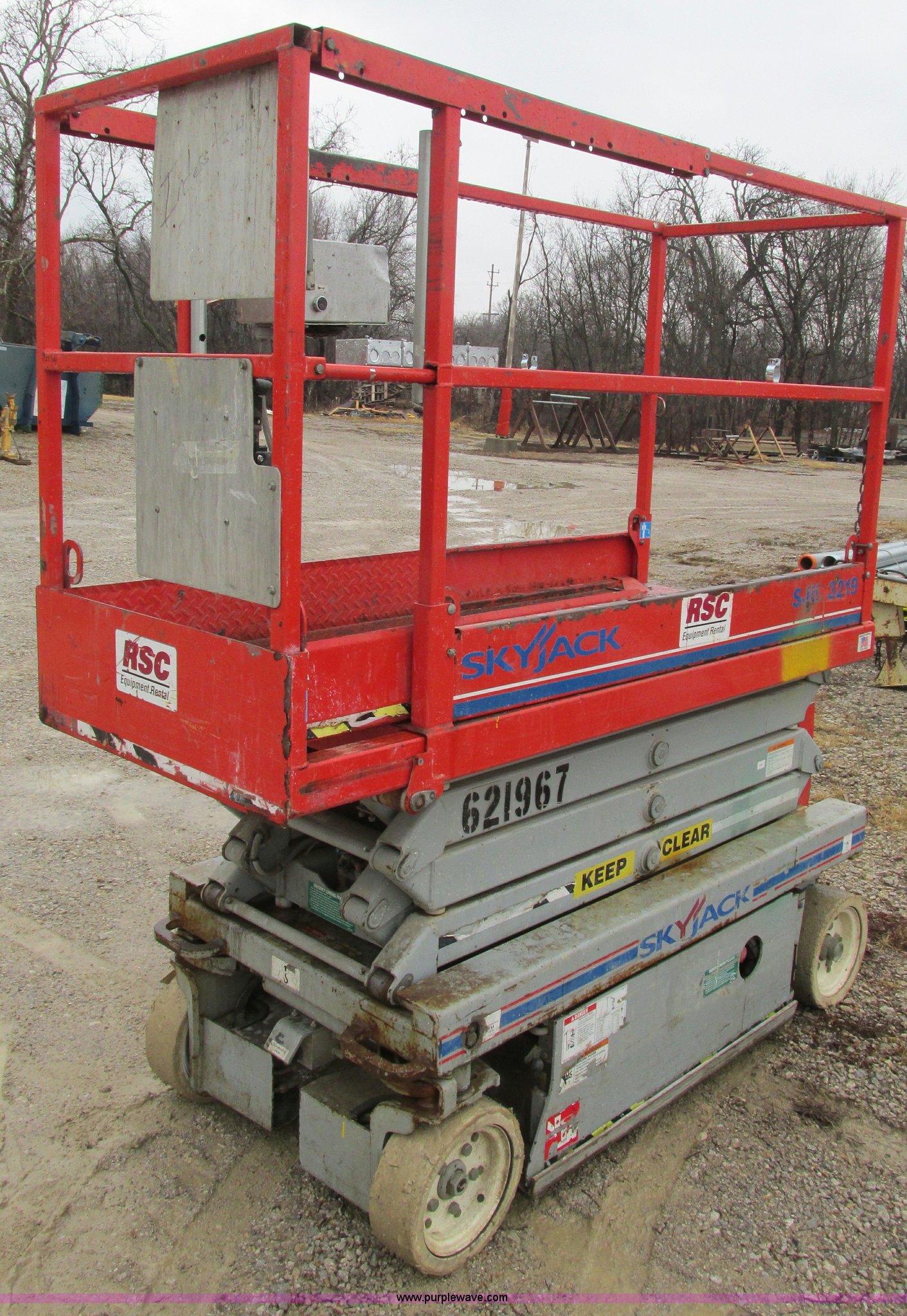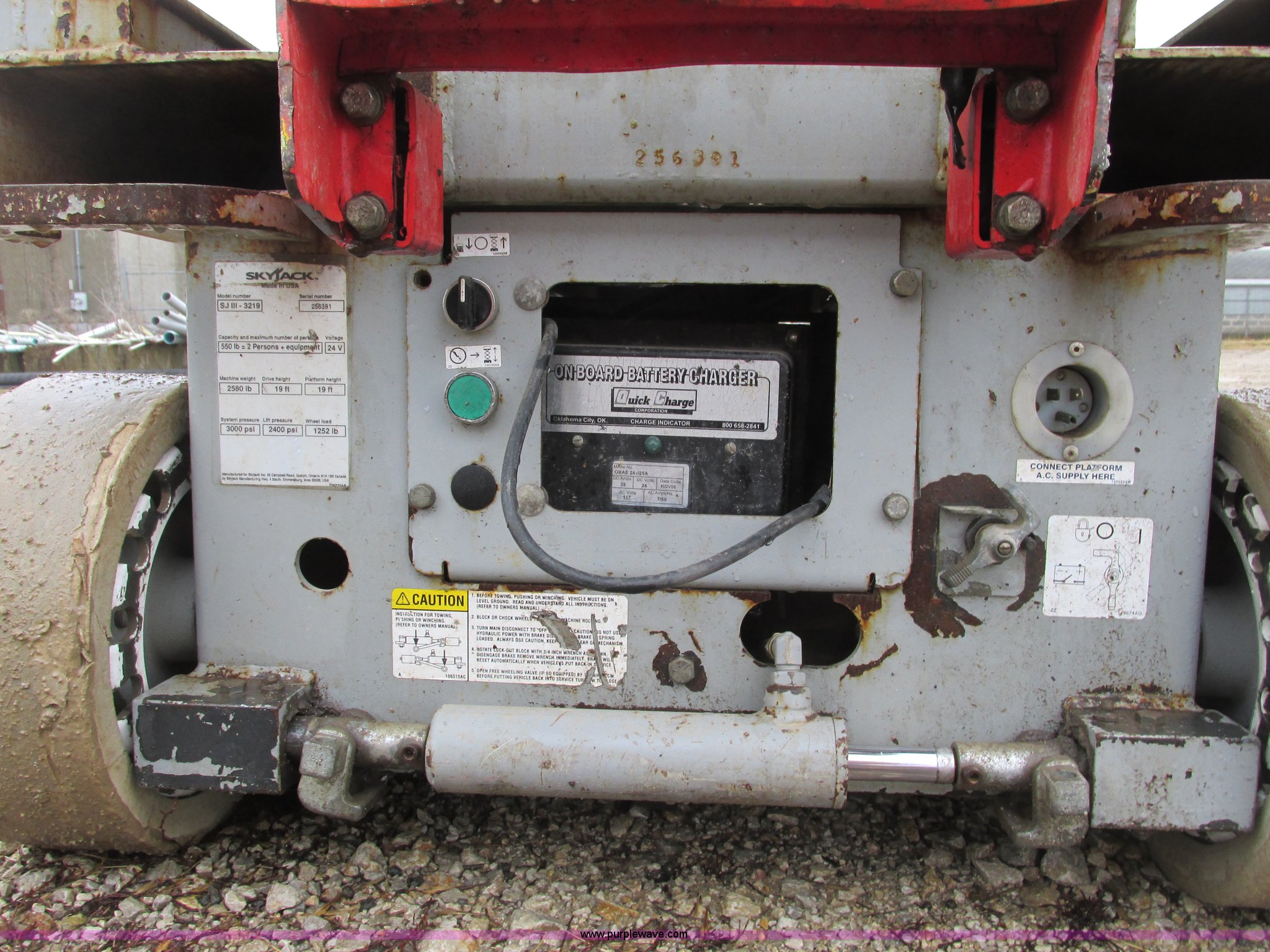 Purple Wave is selling a used Scissor or Vertical Lift in Kansas. This item is a Skyjack SJ111 3219 scissor lift with the following: 64"L x 28"W platform, 19' max platform height, 24V, 39"H rails, 3' slide-out, On-board battery charger, 550 lb max capacity, Power to platform, 2,580 lbs. base operating weight, Serial 256391, Unit# S114