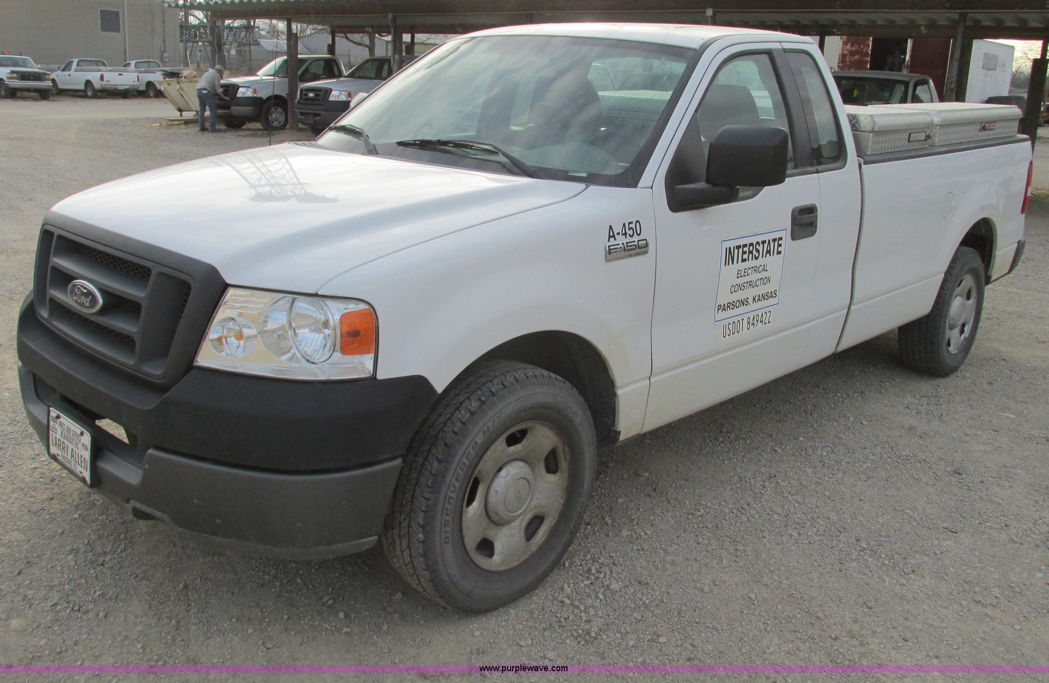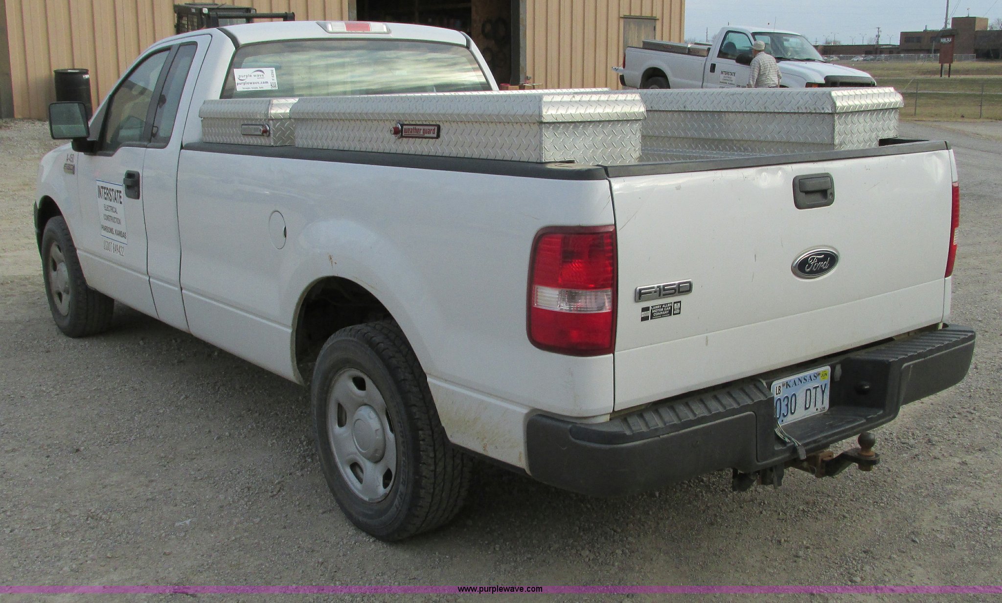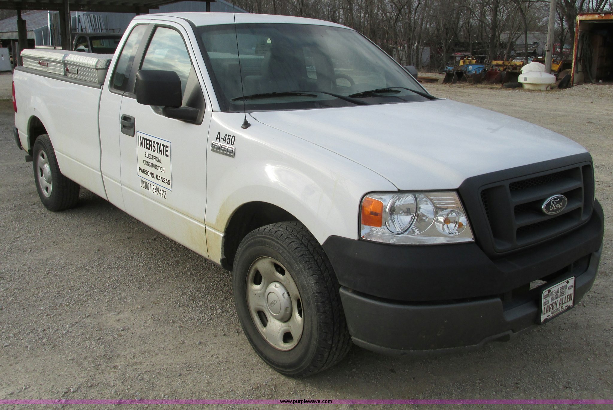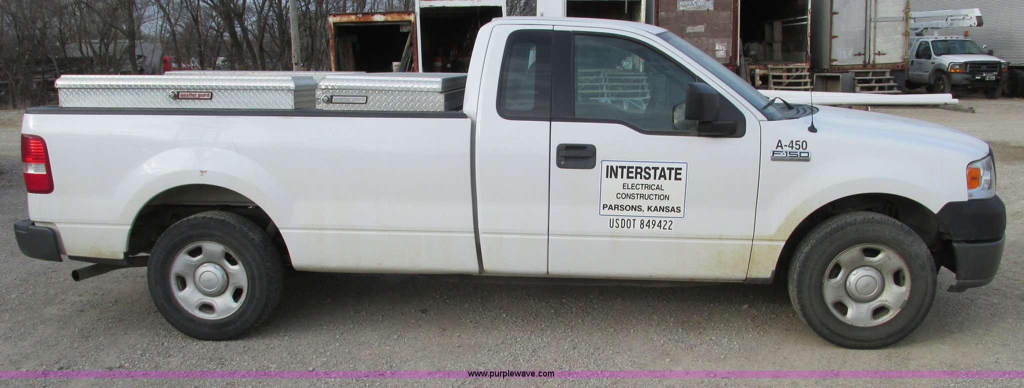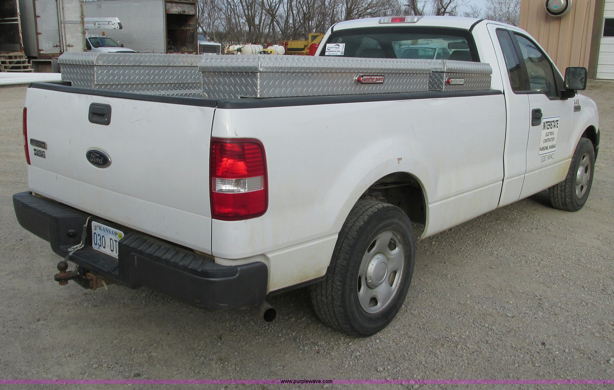 2005 Ford F150 XL pickup truck. 142,542 miles on odometer, 4.6L V8 SOHC 16V gas engine, Automatic transmission, AC and heat, Tilt, Cruise, AM/FM/CD, Manual windows and locks, Vinyl interior, Long bed, WeatherGuard aluminum diamond plate toolboxes Keys included, Receiver hitch, Trailer wiring, 245/70R17 tires, Interior/exterior cosmetic damage, Torn seat, Unit# A450. 1FTRF12W45KC17625. Shipping quotes available. Interstate Electrical Construction Inc.. 1715 S US Highway 59. Parsons, KS 67357