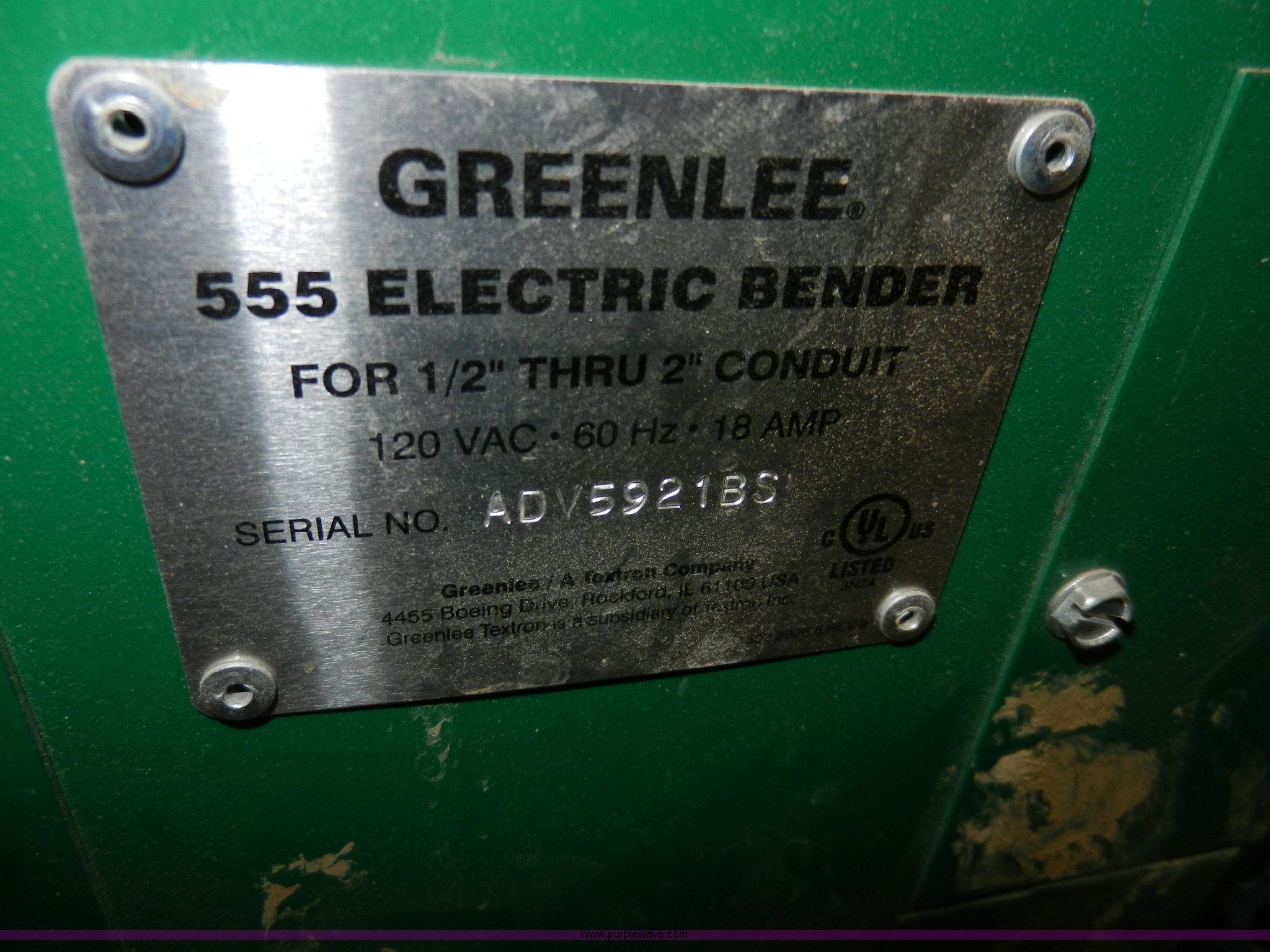 Greenlee 555 speed bender. 1/2" to 2" shoes, Bend angle remote, Shoe storage box included, Serial ADV53213S. Shipping quotes available. Interstate Electrical Construction Inc.. 1715 S US Highway 59. Parsons, KS 67357