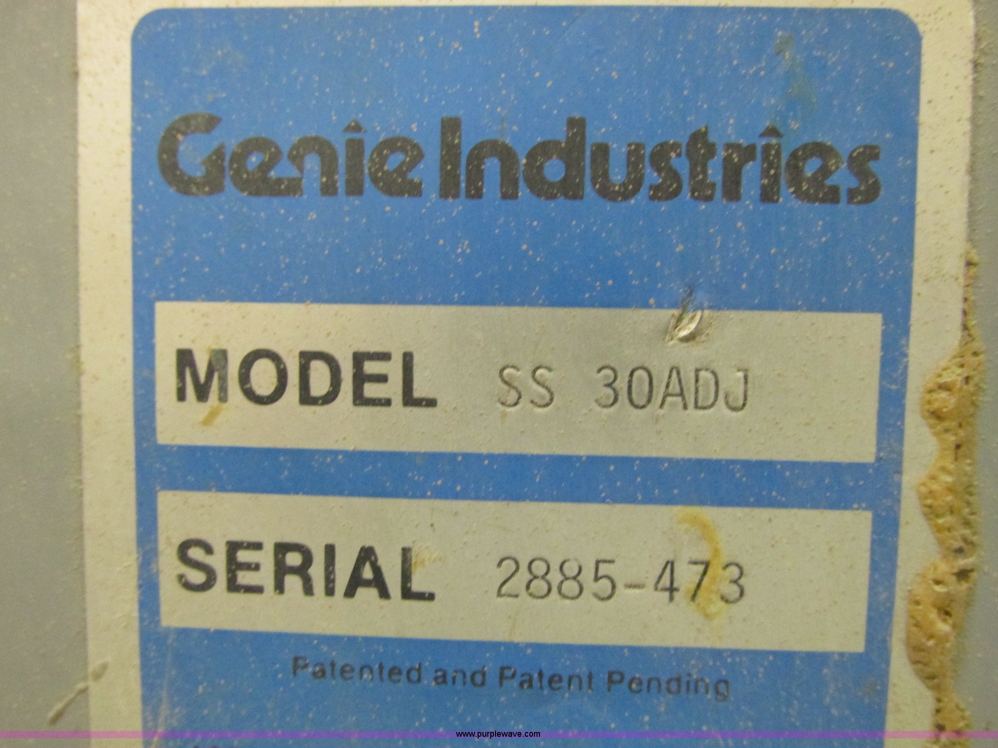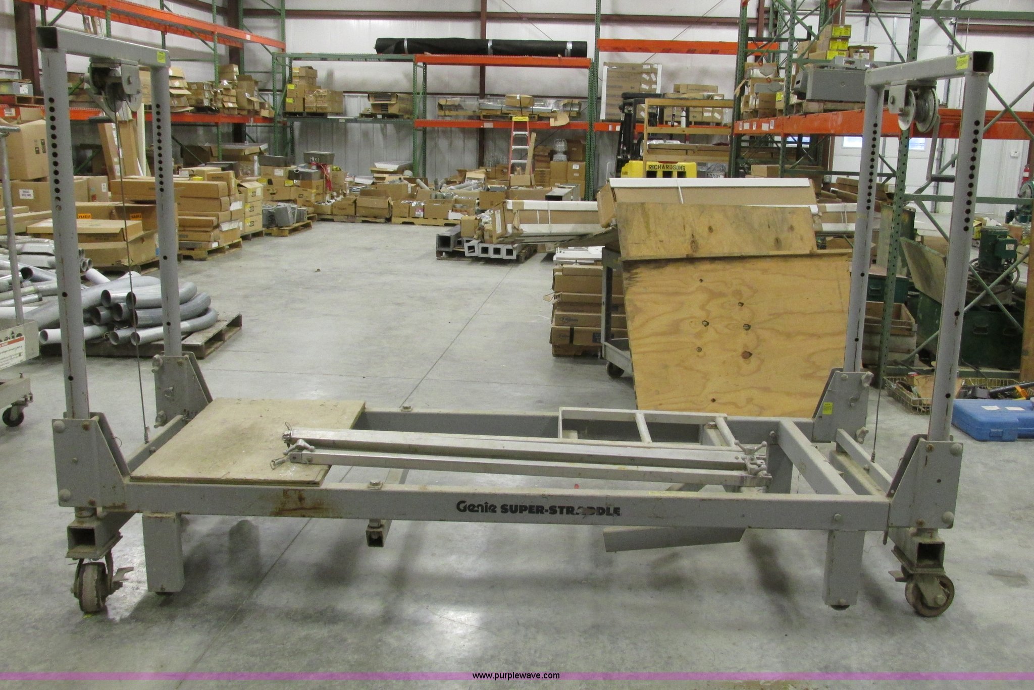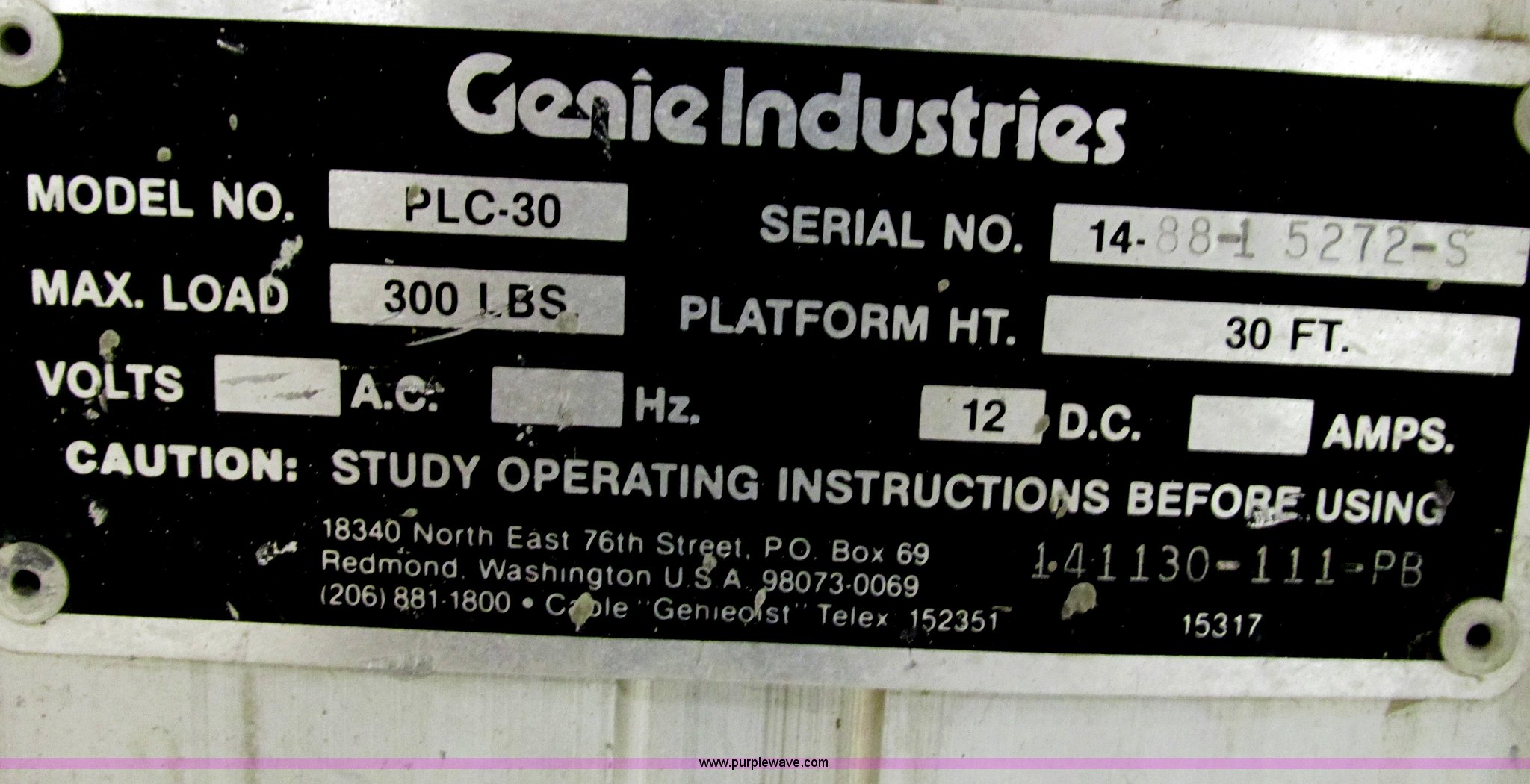 (2) Genie lifts. Genie PLC-30 single man lift 30' max height, 300 lb max capacity, 12V electrical system, On-board charger, Approx. 2'W x 2' basket, Approx. 44"H side rails, (2) outriggers, Extra dolly wheels, Extension to wheel through door ways, Recently replaced batteries, Serial 14-88-15272-S, Genie Super straddle Model SS30ADJ, Casters, Approx. 109"L x 33"W x 70"H, Serial 2885-473. Shipping quotes available. Interstate Electrical Construction Inc.. 1715 S US Highway 59. Parsons, KS 67357