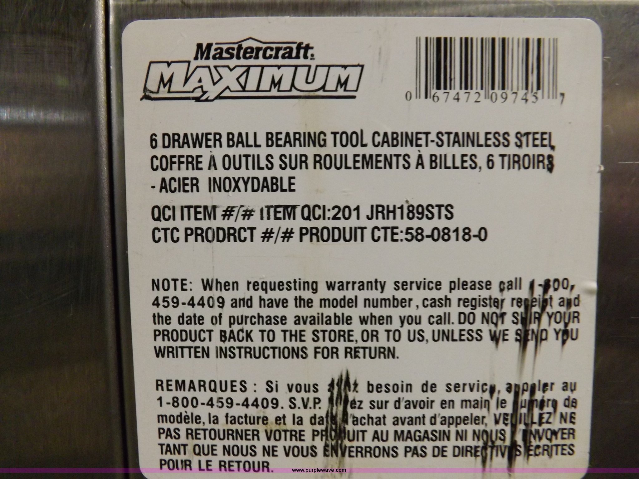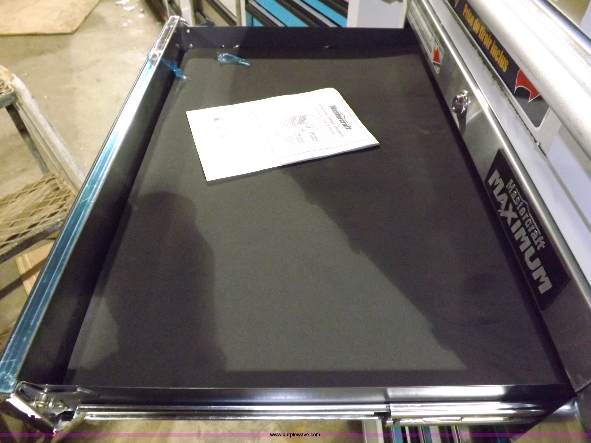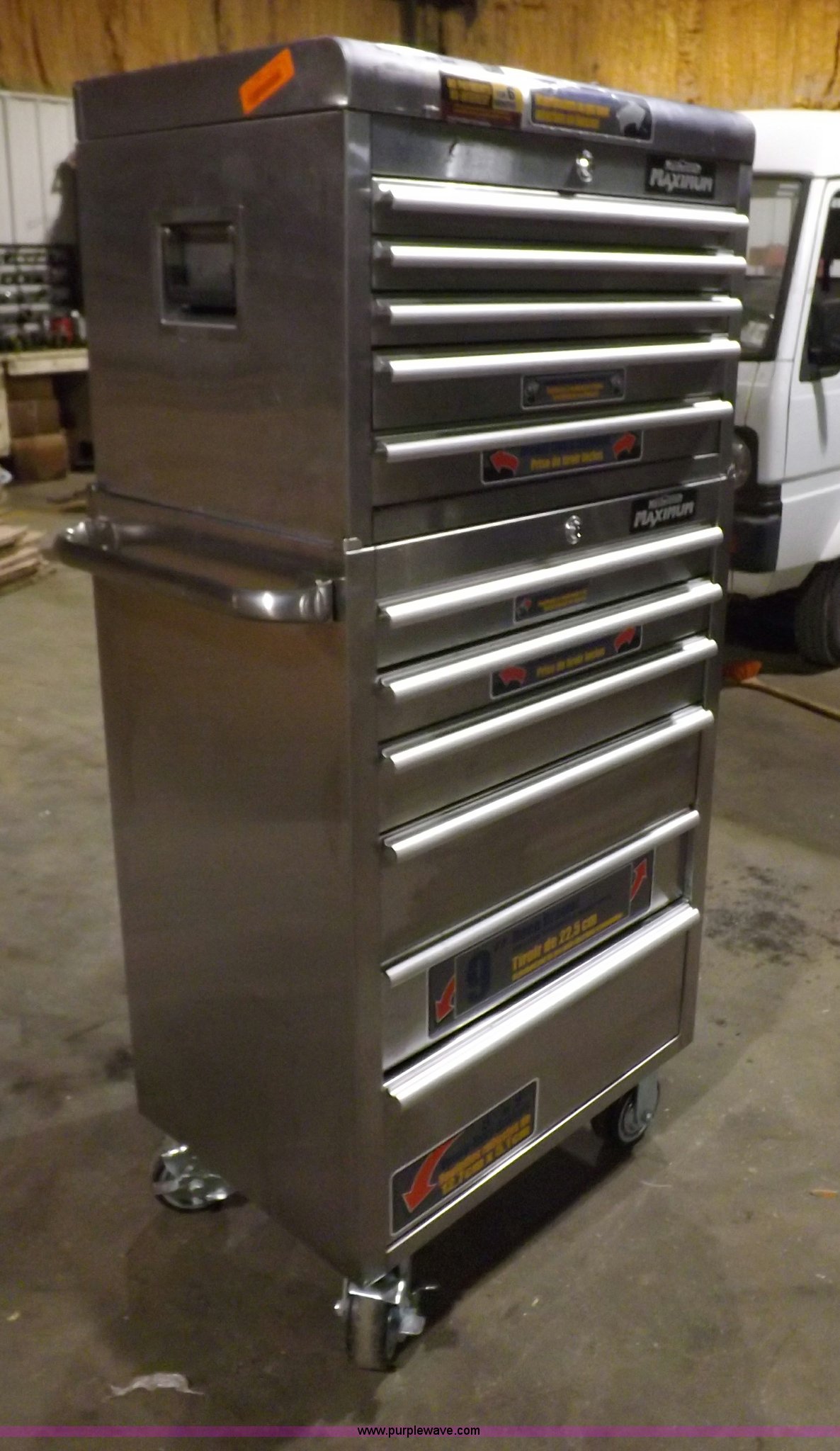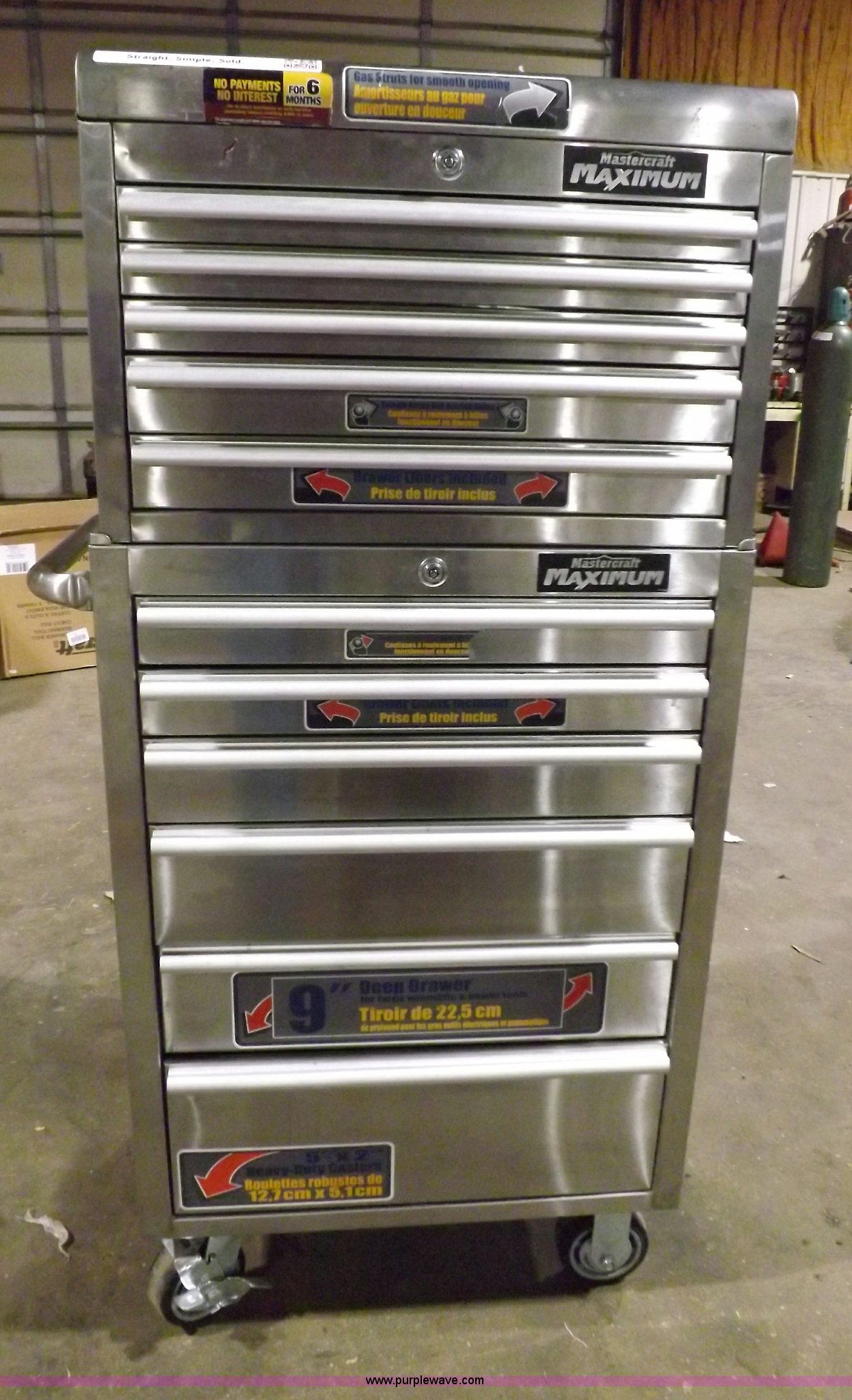 Purple Wave is selling a used Tools in Kansas. This item is a Master Craft toolbox with the following: 26"W x 17.5"H x 17.75"D top box, Five drawer, 26.5"W x 40"H x 18"D base unit, Six drawer, 5" casters and wheels, Lockable, Handles and push bar, Stainless steel construction, Drawer liners, Cosmetic damage