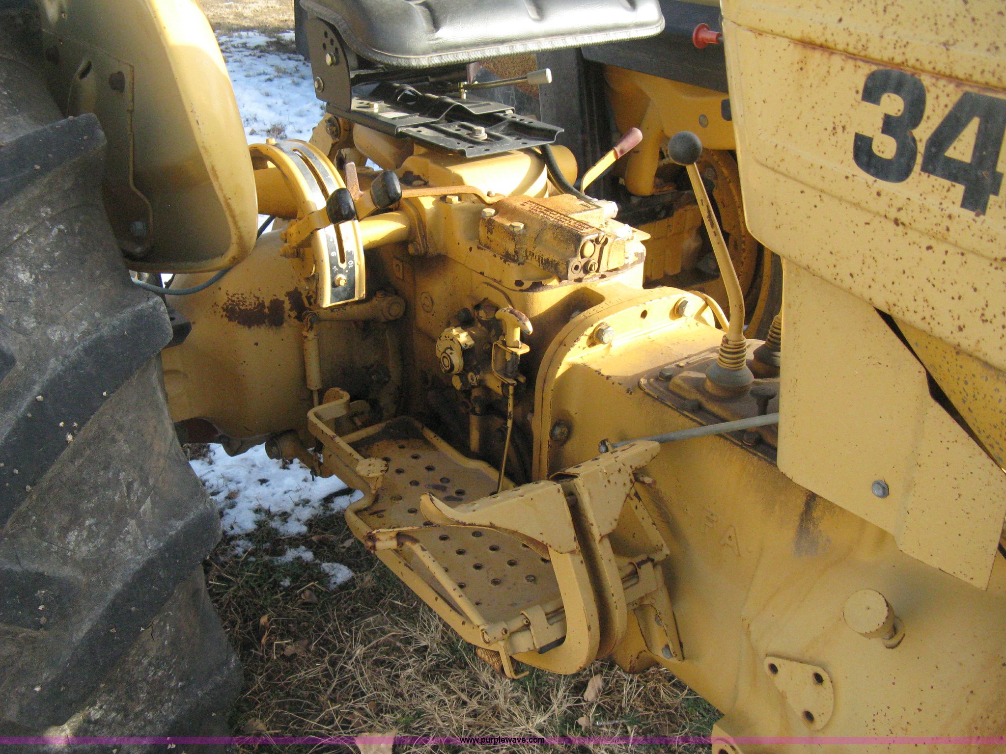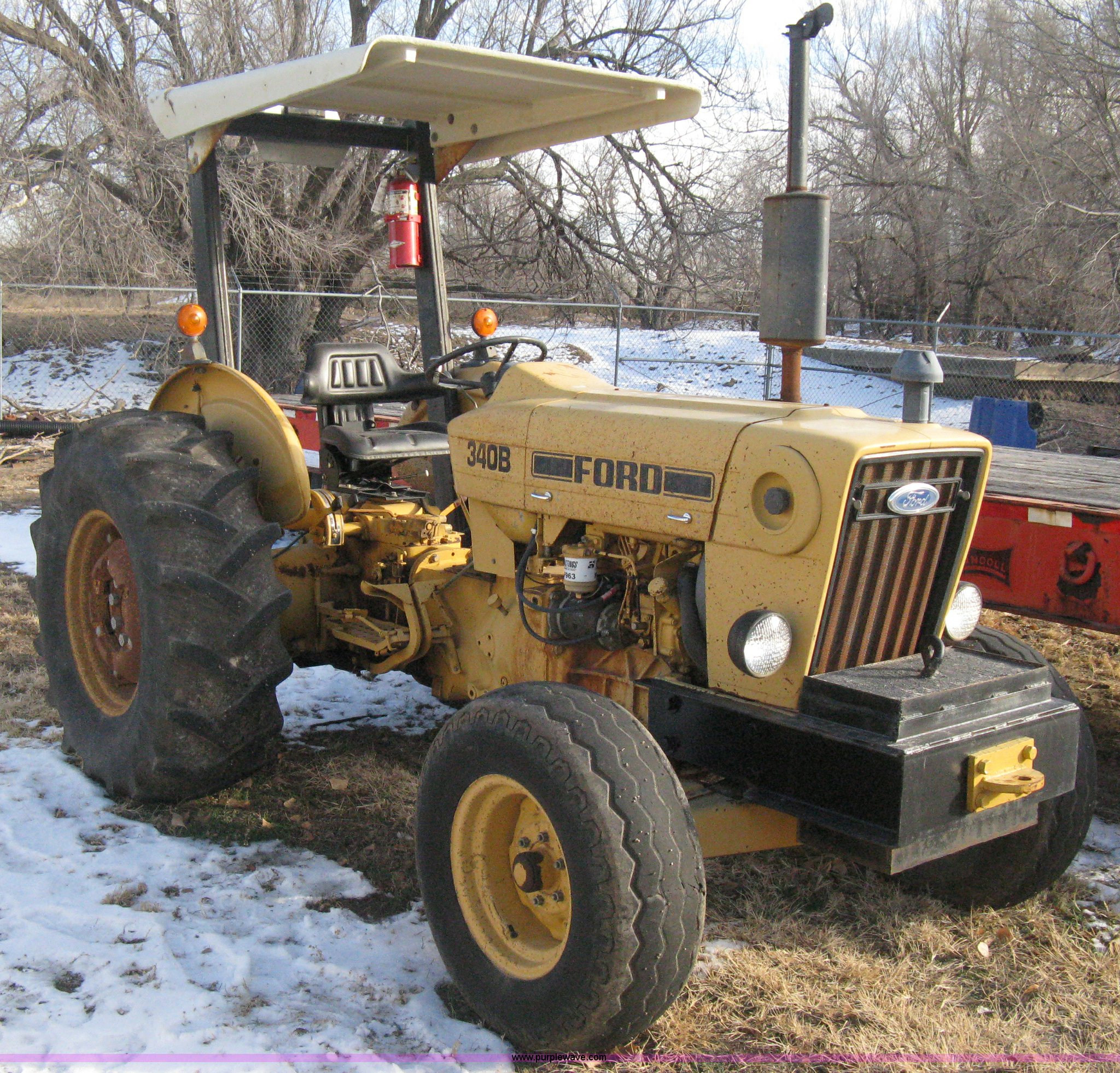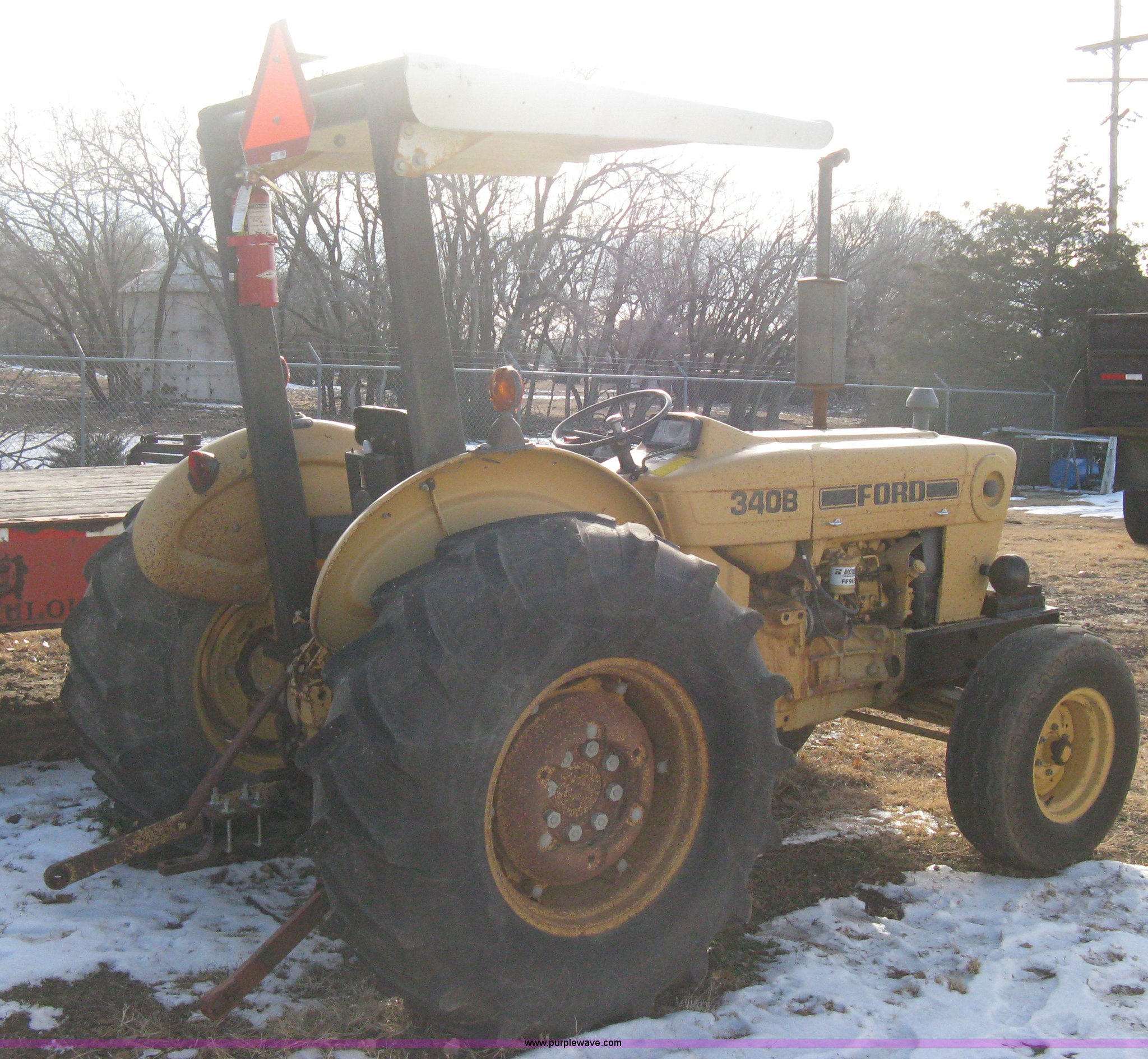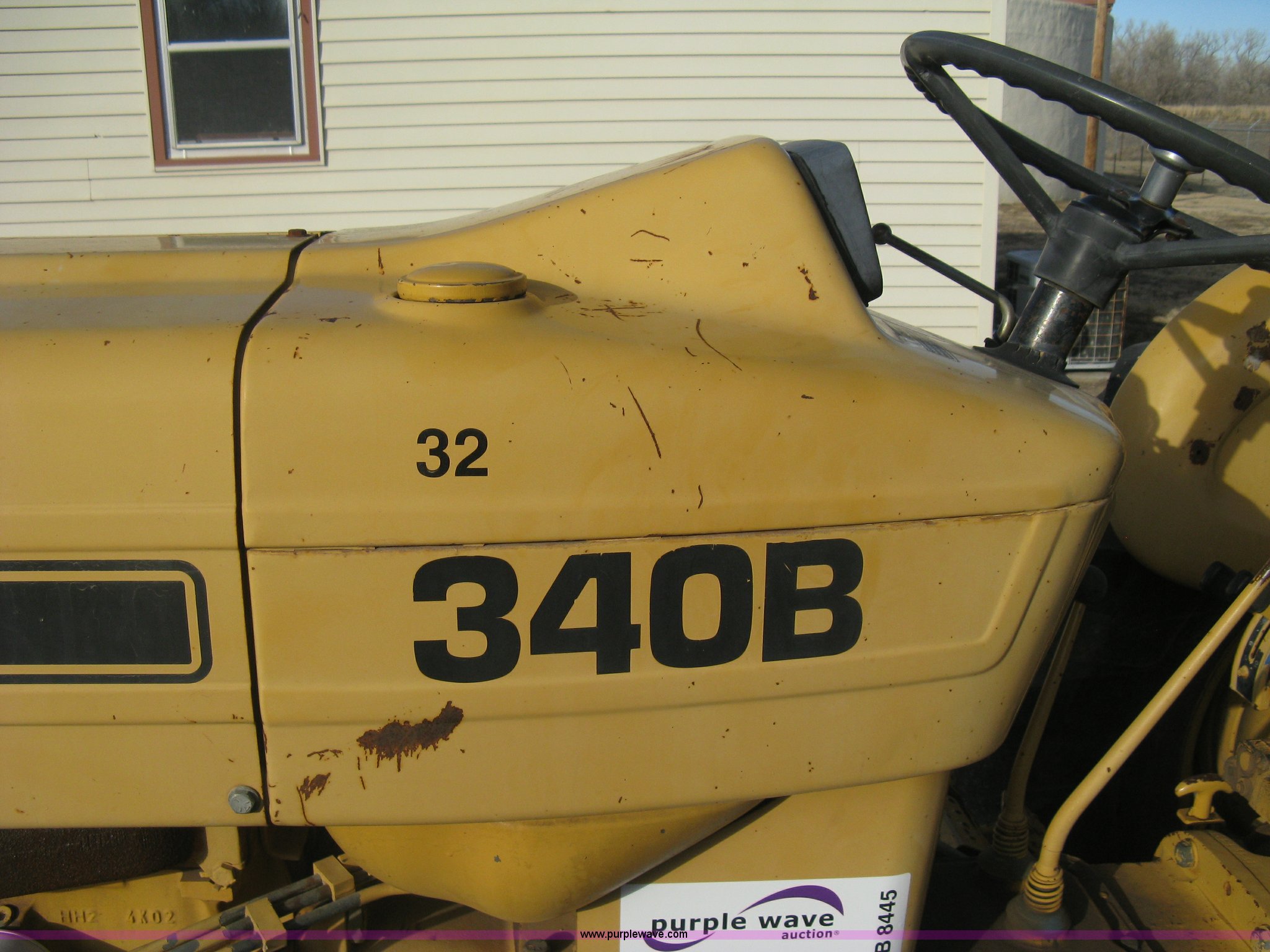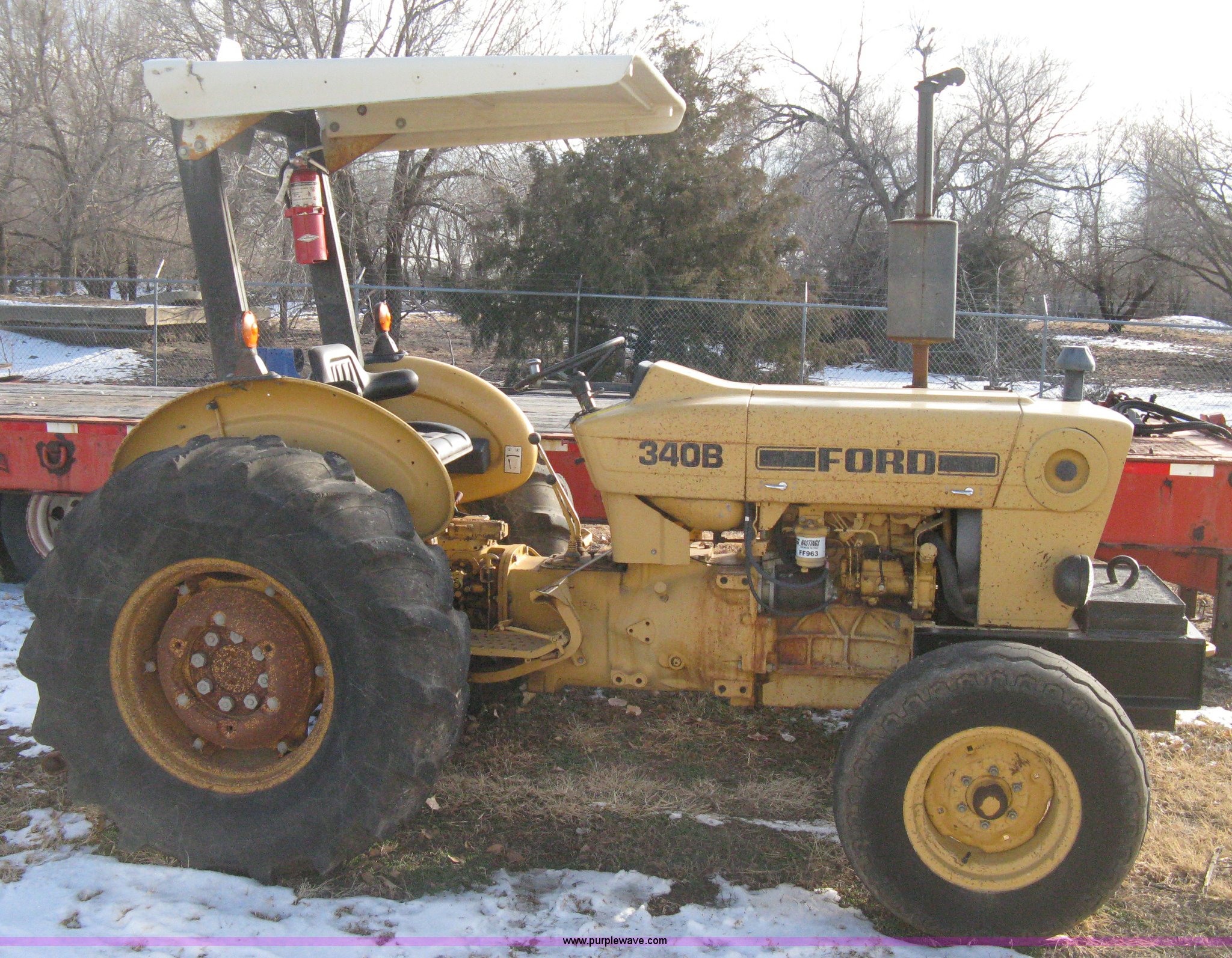Purple Wave is selling a used Tractor in Kansas. This item is a Ford 340B industrial tractor with the following: 2,159 hours on meter, Three cylinder diesel engine, Three speed hi-lo transmission, 6F-4R gears, Two post roll bar with hard top fiberglass canopy, Foot and column throttle control, Suspension seat, Three point, Hydraulic remotes, Draw bar with receiver hitch attachment, 540 PTO, Inner/outer rear wheel weights, Front mounted weight with pin hitch, Work and caution lights, 11L-16SL front tires, 16.9-24 rear tires, Serial D9NN-7006-FA, Unit# 32