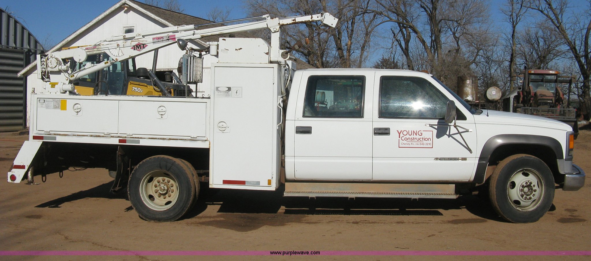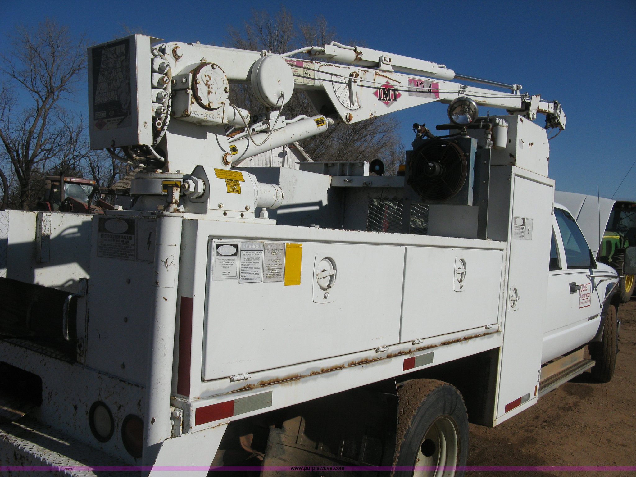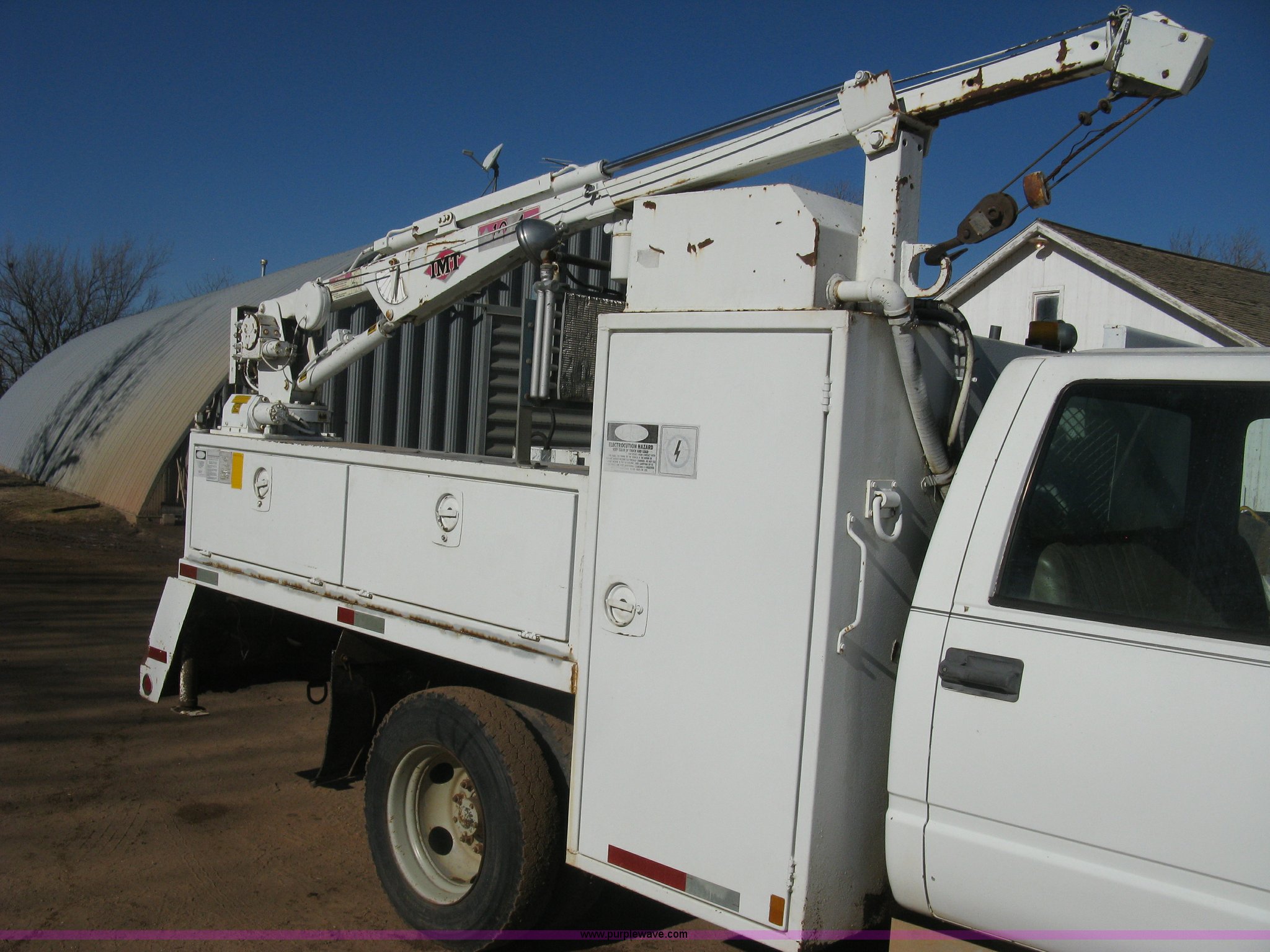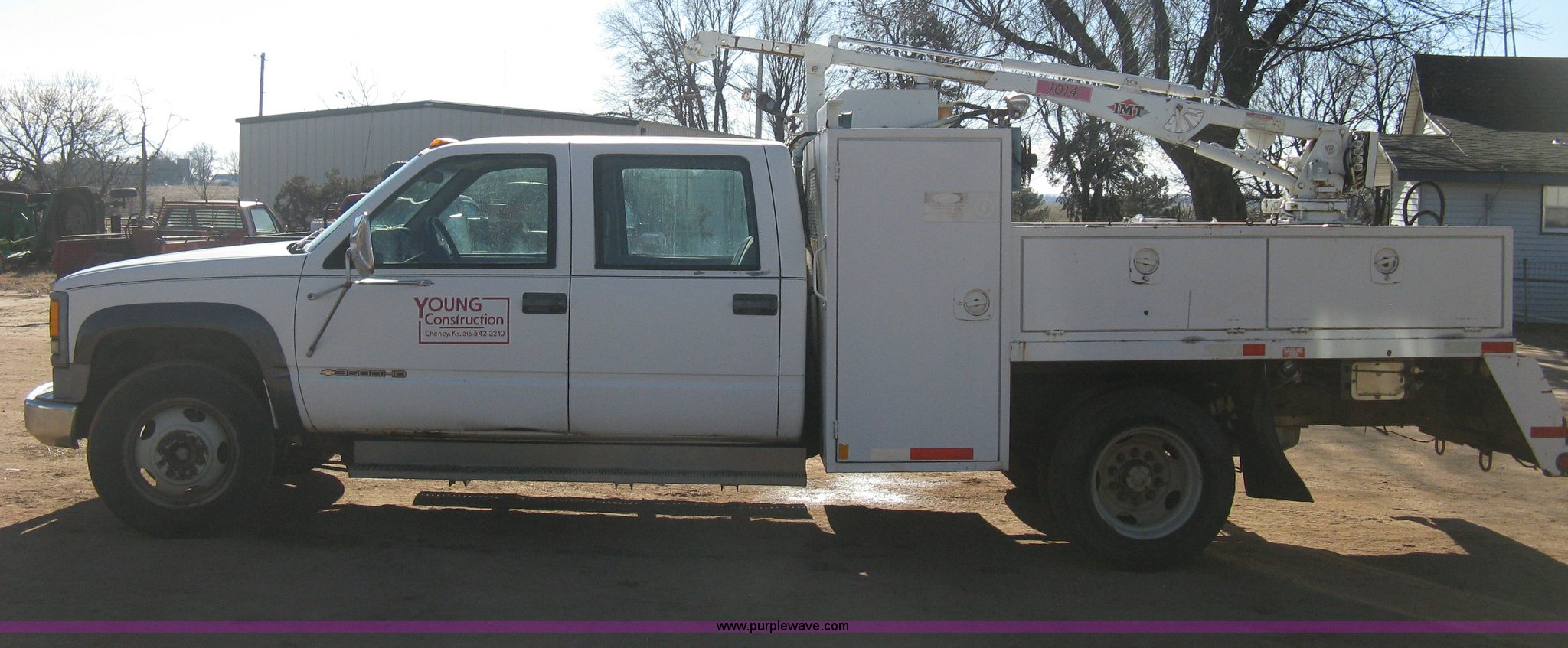Purple Wave is selling a used Bucket Truck in Kansas. This item is a 1994 Chevrolet 3500 Crew Cab utility truck with the following: 135,296 miles on odometer, 9,266 hous on meter, 7.4L V8 OHV 16V gas engine, Five speed manual transmission, AC and heat, AM/FM, Manual windows and locks, Vinyl interior, Chelsea PTO, Alton 11'L x 90"W utility bed, Diamond plate floor, Step up bumper, (6) tool cabinets, Serial 901728, IMT 1014 telescoping crane, Oscillating, 1.75 ton hook end, Rear hydraulic remotes, Receiver hitch, Trailer wiring, 8R19.5 tires