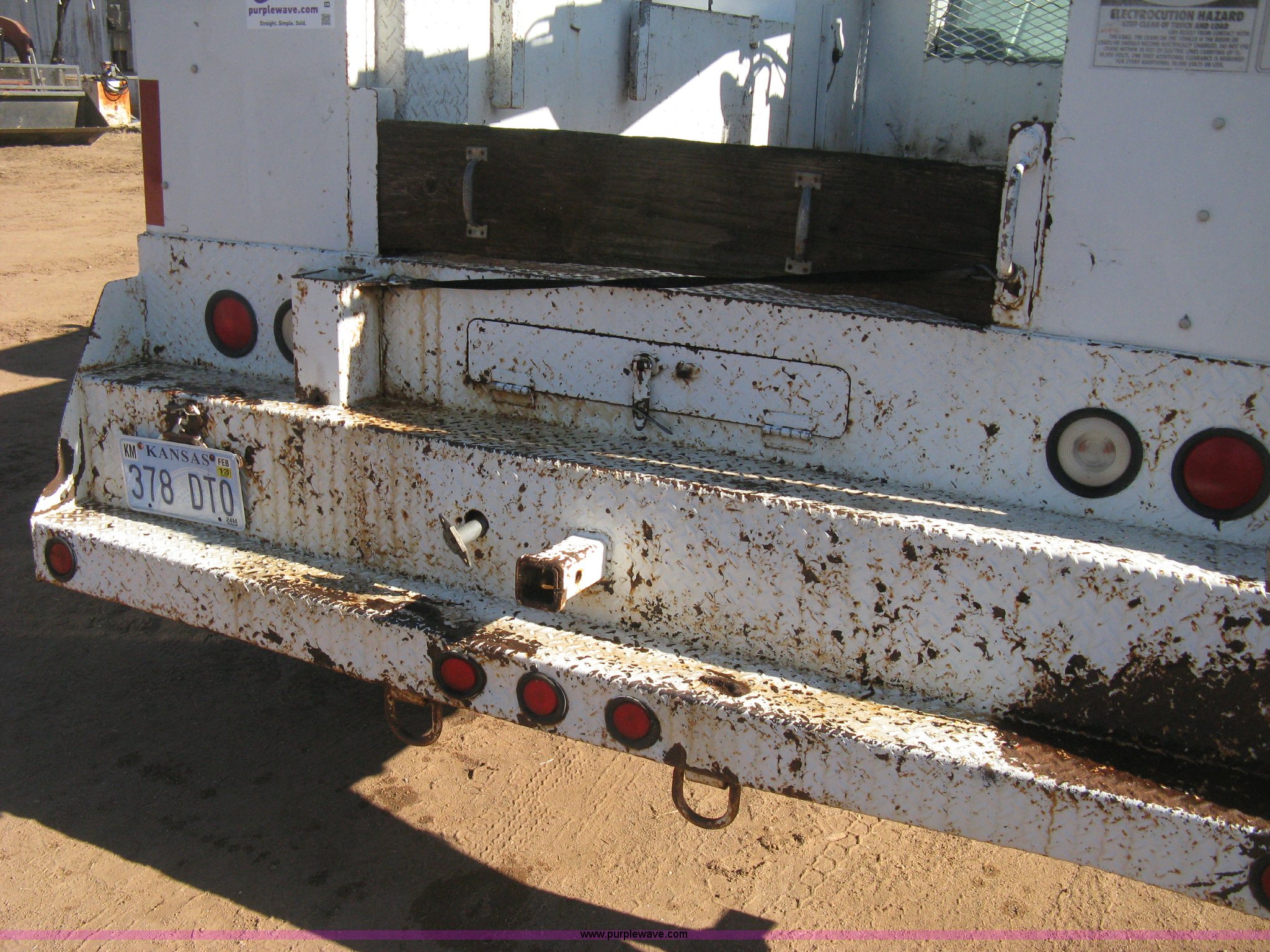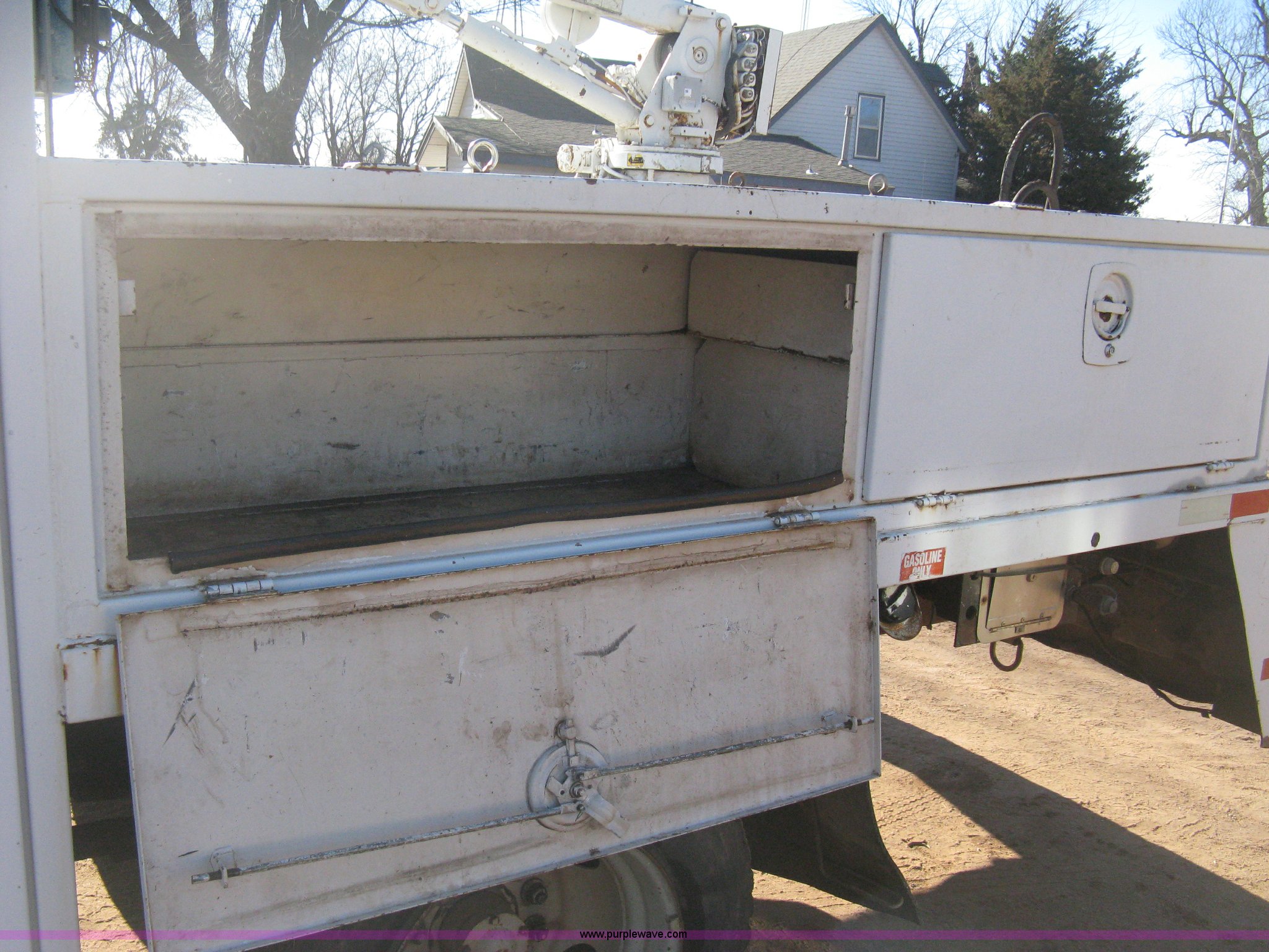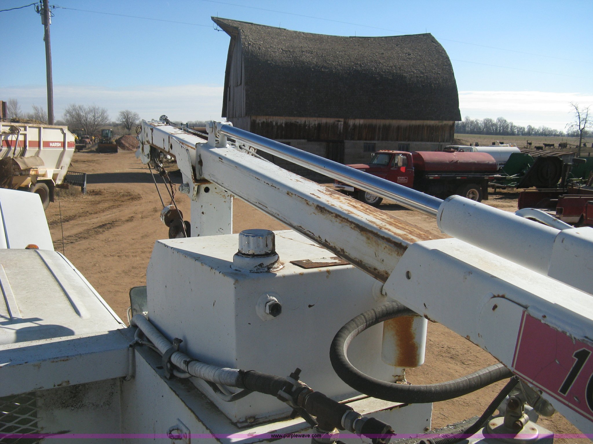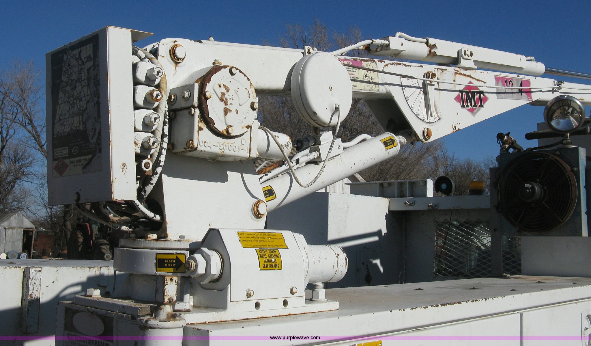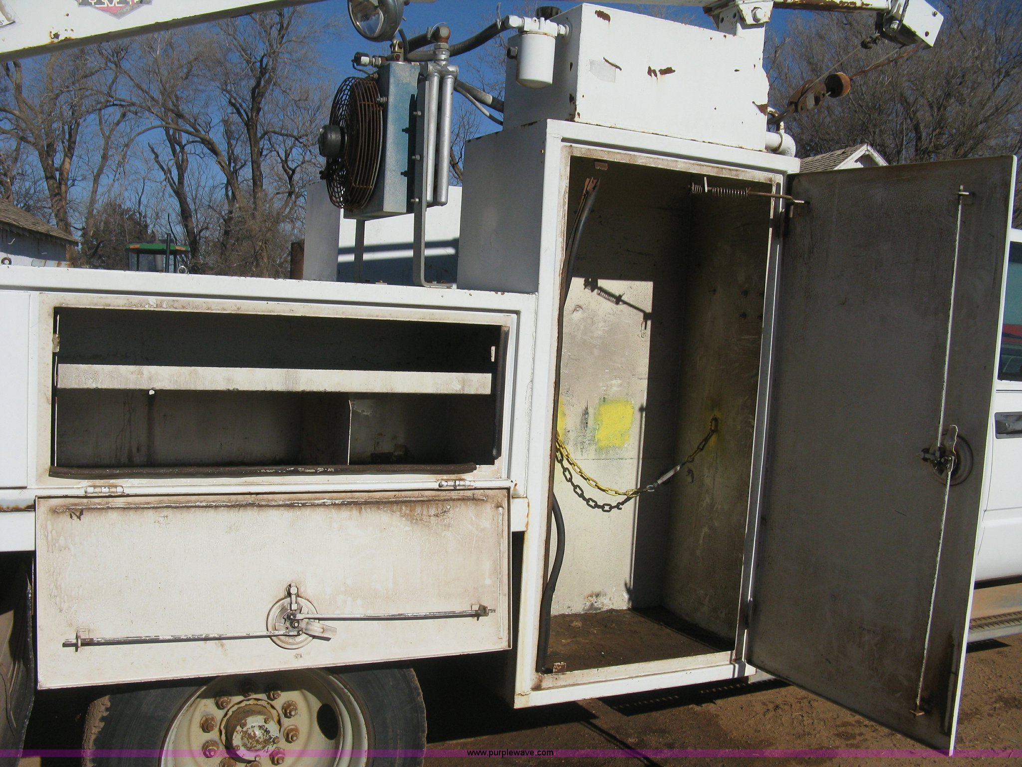 Purple Wave is selling a used Bucket Truck in Kansas. This item is a 1994 Chevrolet 3500 Crew Cab utility truck with the following: 135,296 miles on odometer, 9,266 hous on meter, 7.4L V8 OHV 16V gas engine, Five speed manual transmission, AC and heat, AM/FM, Manual windows and locks, Vinyl interior, Chelsea PTO, Alton 11'L x 90"W utility bed, Diamond plate floor, Step up bumper, (6) tool cabinets, Serial 901728, IMT 1014 telescoping crane, Oscillating, 1.75 ton hook end, Rear hydraulic remotes, Receiver hitch, Trailer wiring, 8R19.5 tires