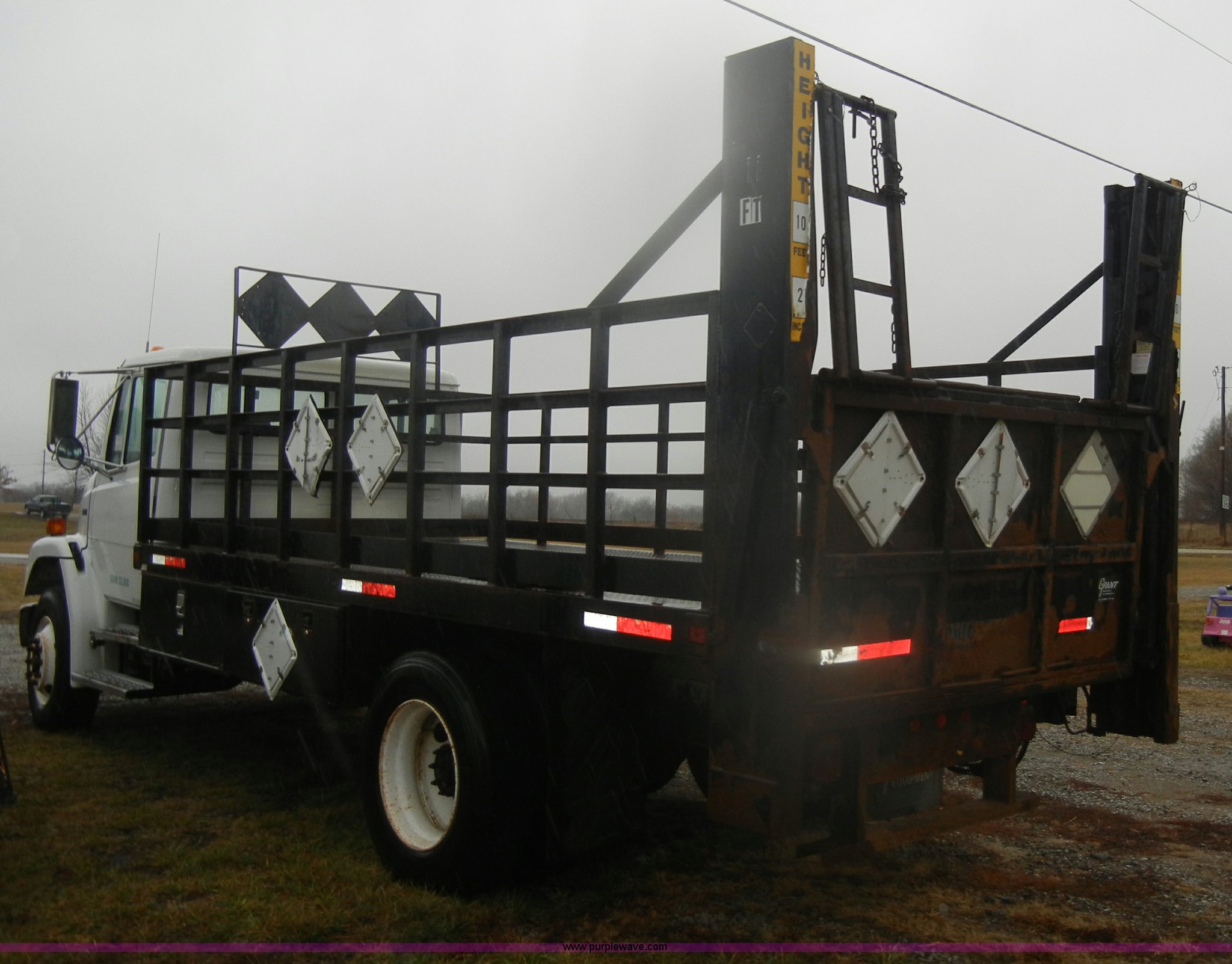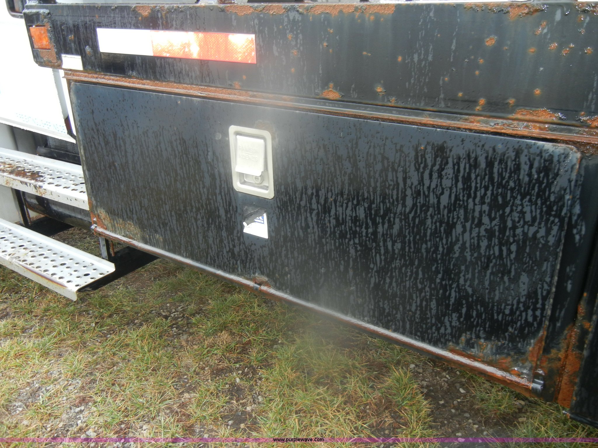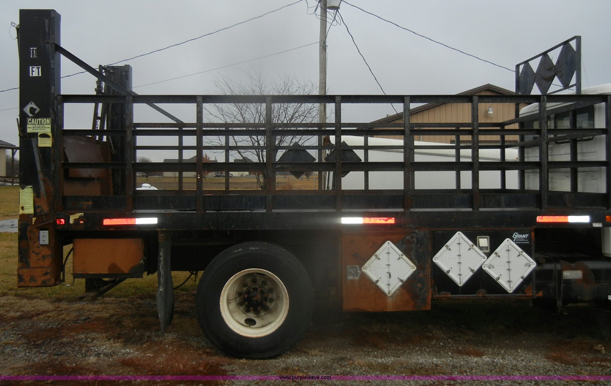 2002 Freightliner FL70. 199,708 miles on odometer, Caterpillar 3126 7.2L L6 diesel engine, Eaton Fuller automatic transmission, AC and heat, Tilt, Telescopic steering wheel, Cruise, AM/FM, Manual windows and locks, Power mirrors, Air suspension seat, Cloth interior, Dual rear windows, Heated mirrors, block heater, 75 gallon fuel tank, (4) toolboxes Some rusted, Maibar 16'L x 8' bed Steel plated, 40" sides, Air suspension over spring, Air brakes, 3,500 lbs capacity lift gate, 275/80R22.5 tires, GVWR 33,000 lbs, FAWR 12,000 lbs, RAWR 21,000 lbs, Paint peeling on front grill, Manuals included. 1FVABTAK82HJ45022. View equipment video. Shipping quotes available. 6124 NW Jennings Road. Topeka, KS 66618